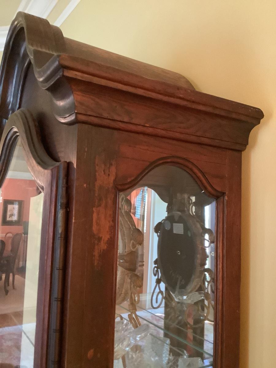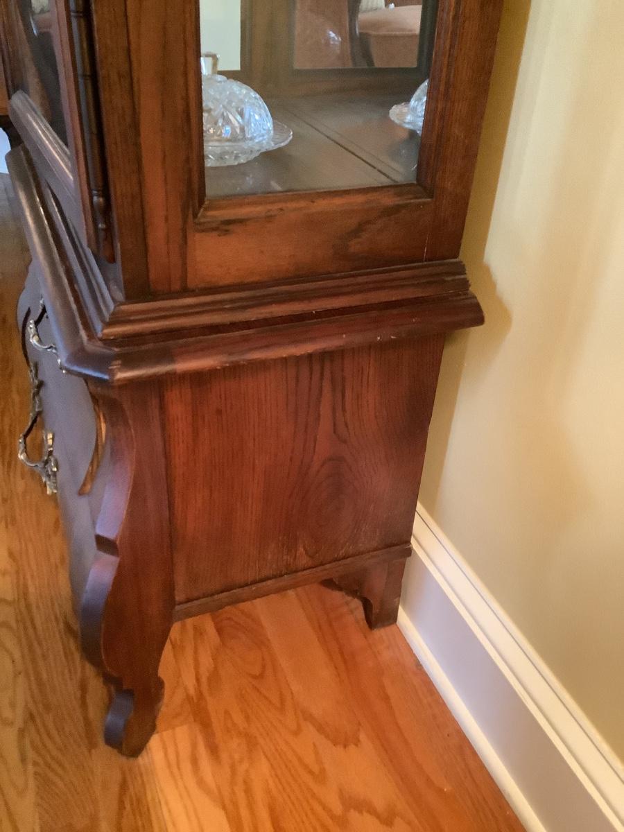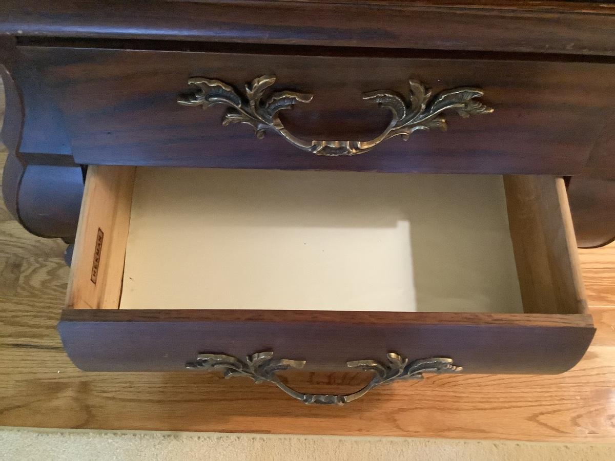 Hekman curio display cabinet with 2 drawers, antique brass handles, lighted - does need a new latch
