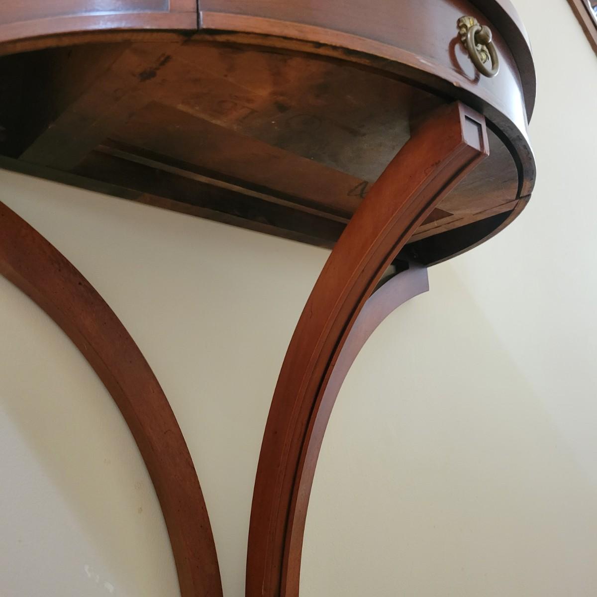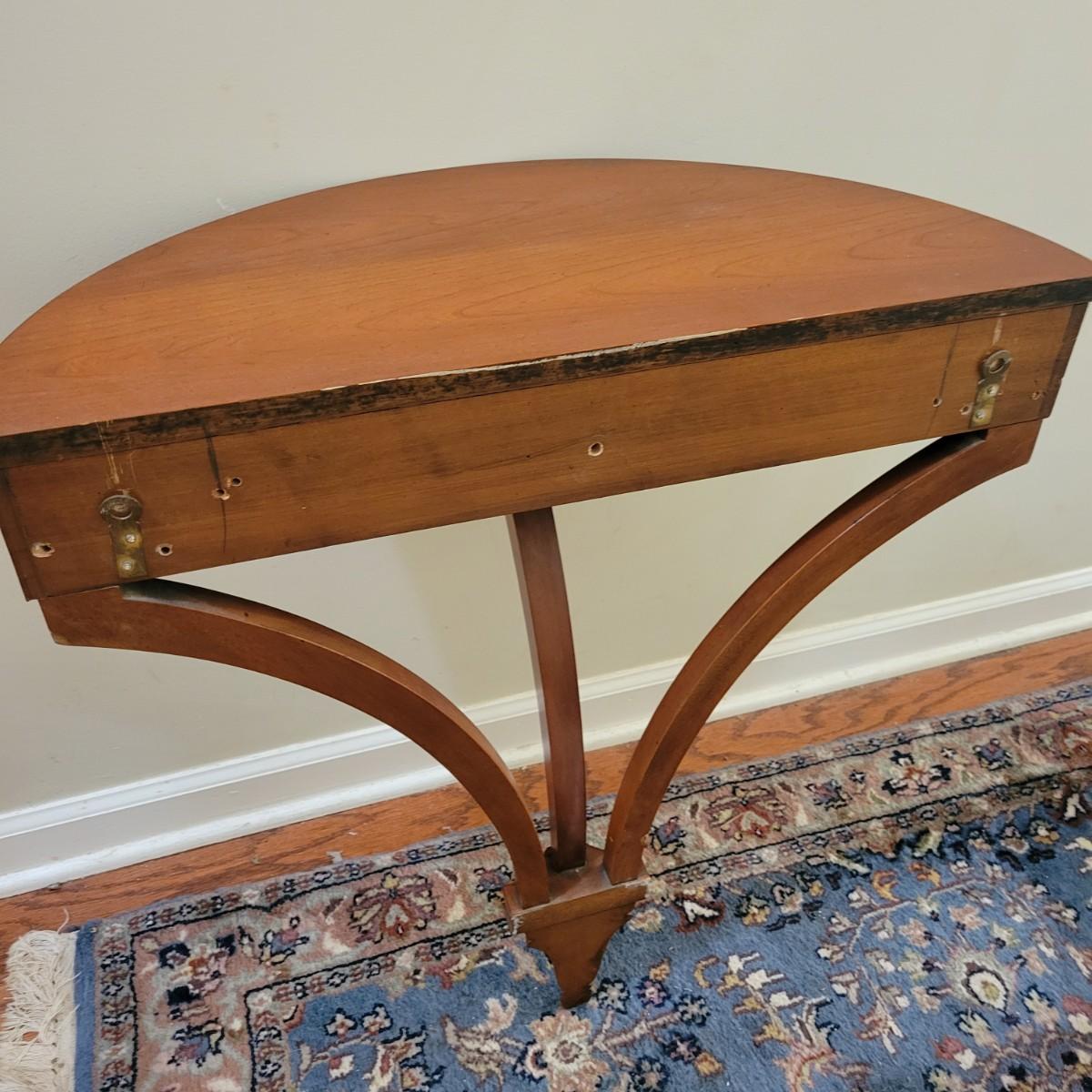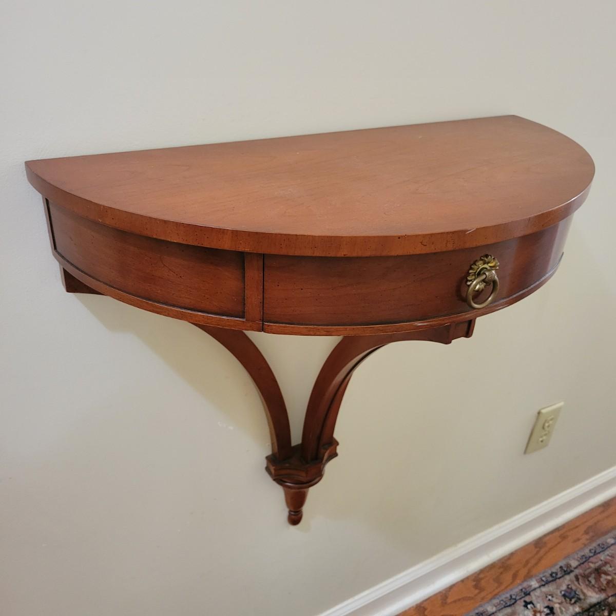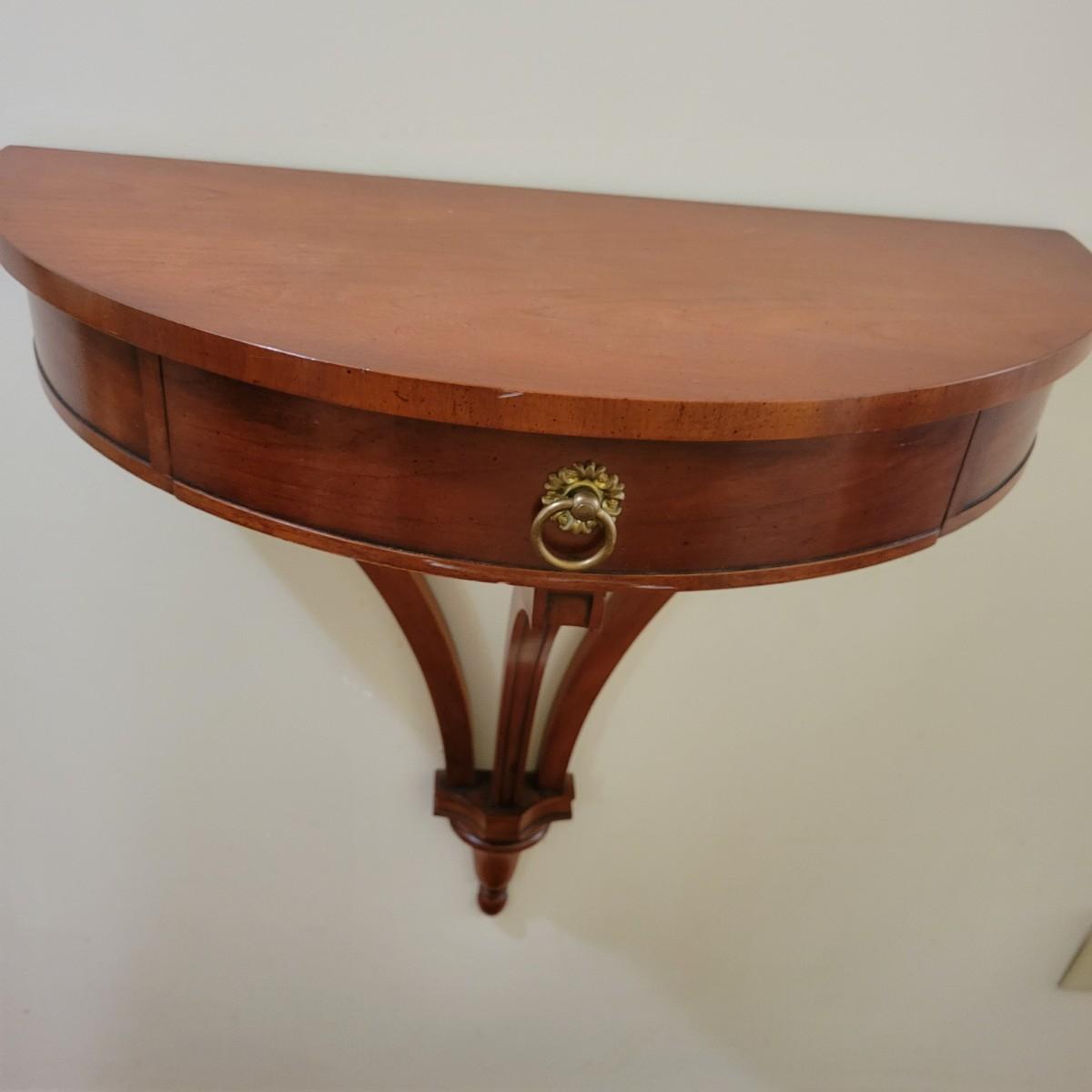 A Hekman demilune wall shelf/table with a drawer in good condition with a few minor blemishes. This demilune wall table features a dovetailed drawer with brass hardware. Piece measures approximately 24" x 11" x 26". Local pickup only