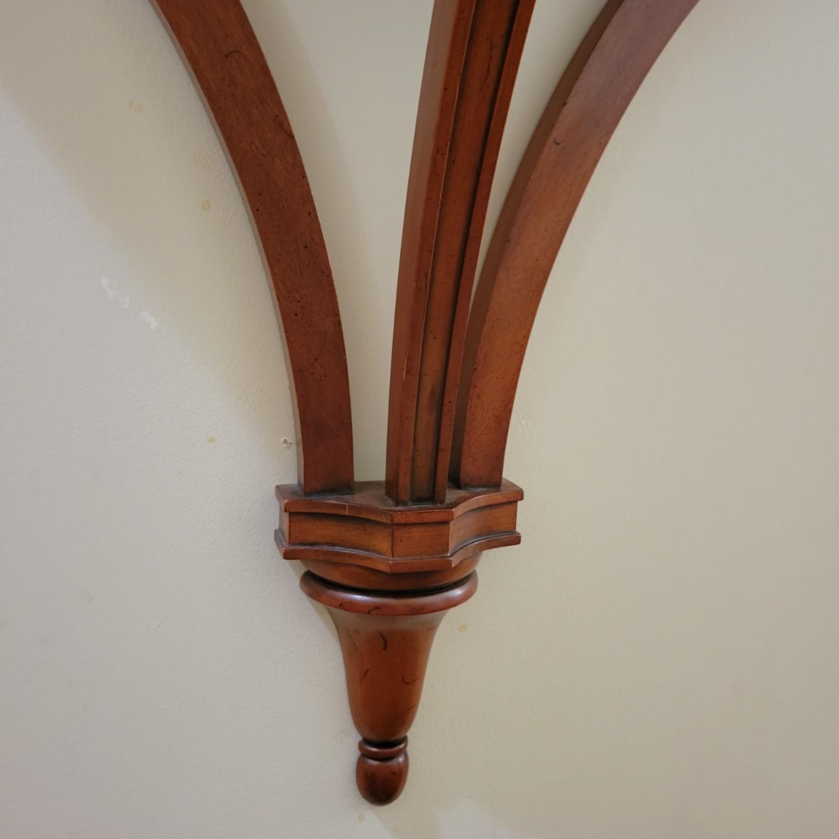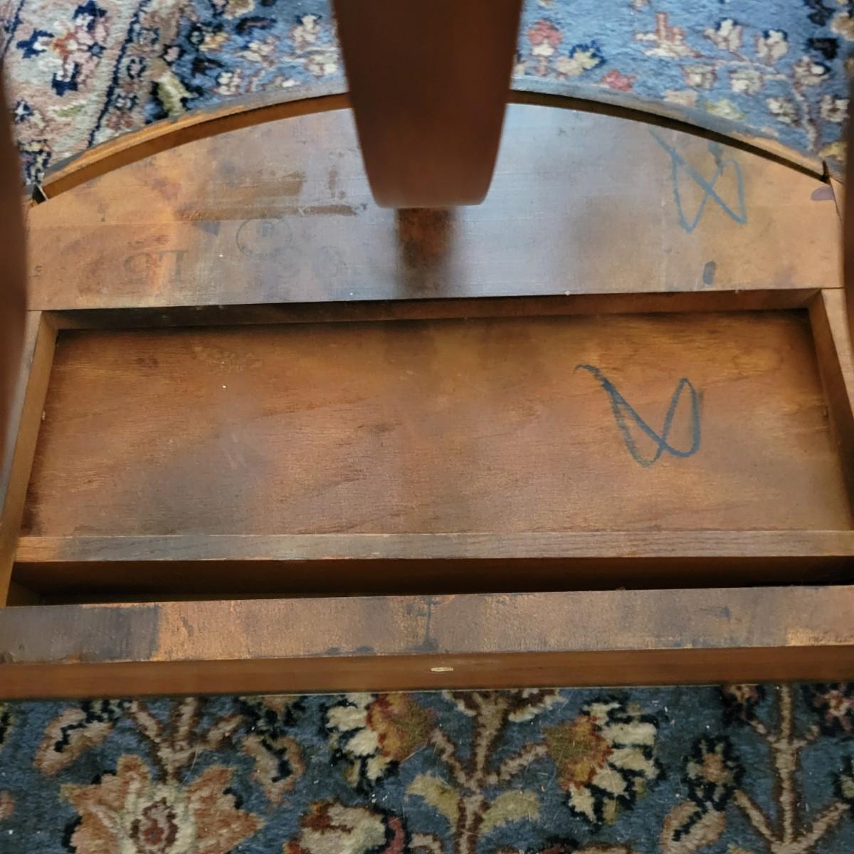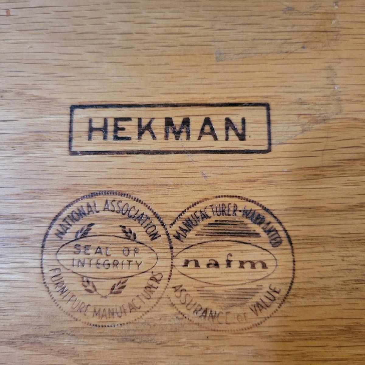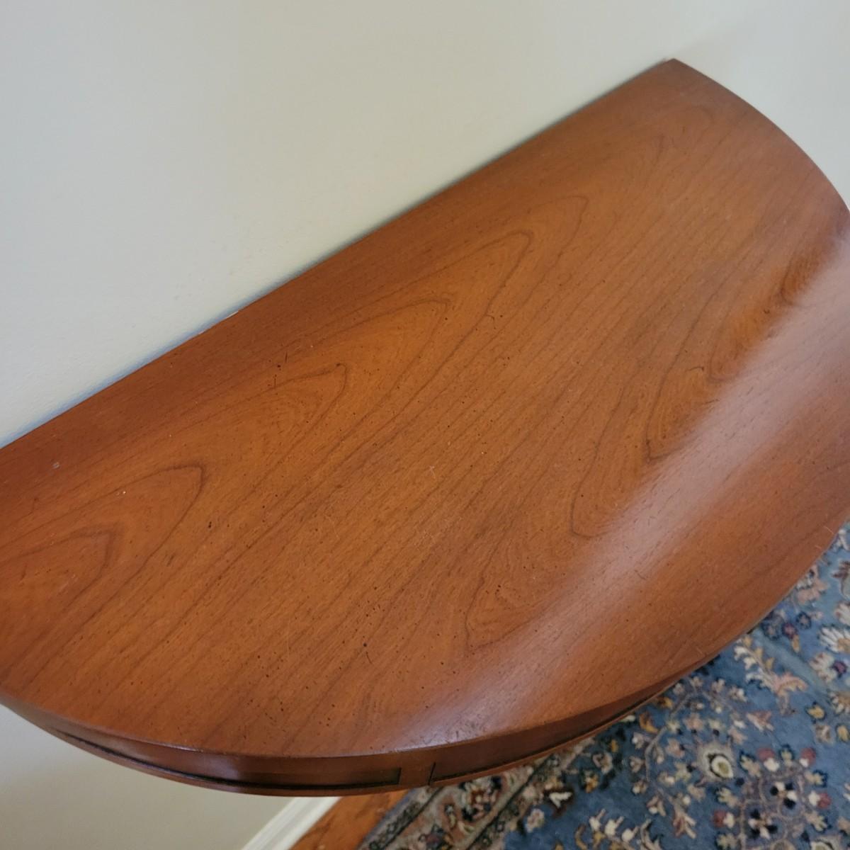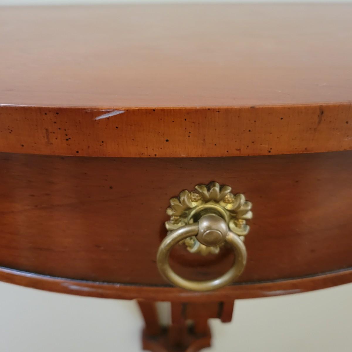 A Hekman demilune wall shelf/table with a drawer in good condition with a few minor blemishes. This demilune wall table features a dovetailed drawer with brass hardware. Piece measures approximately 24" x 11" x 26". Local pickup only
