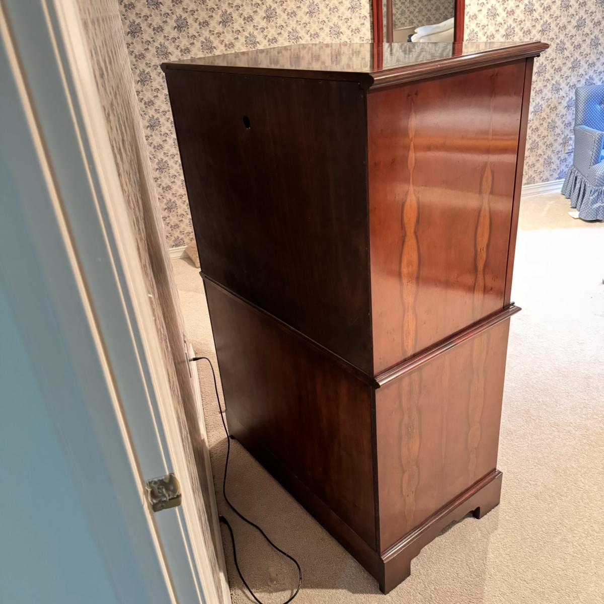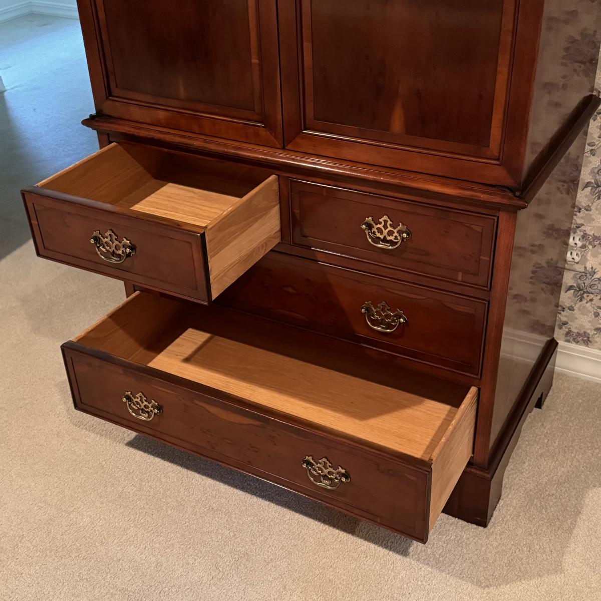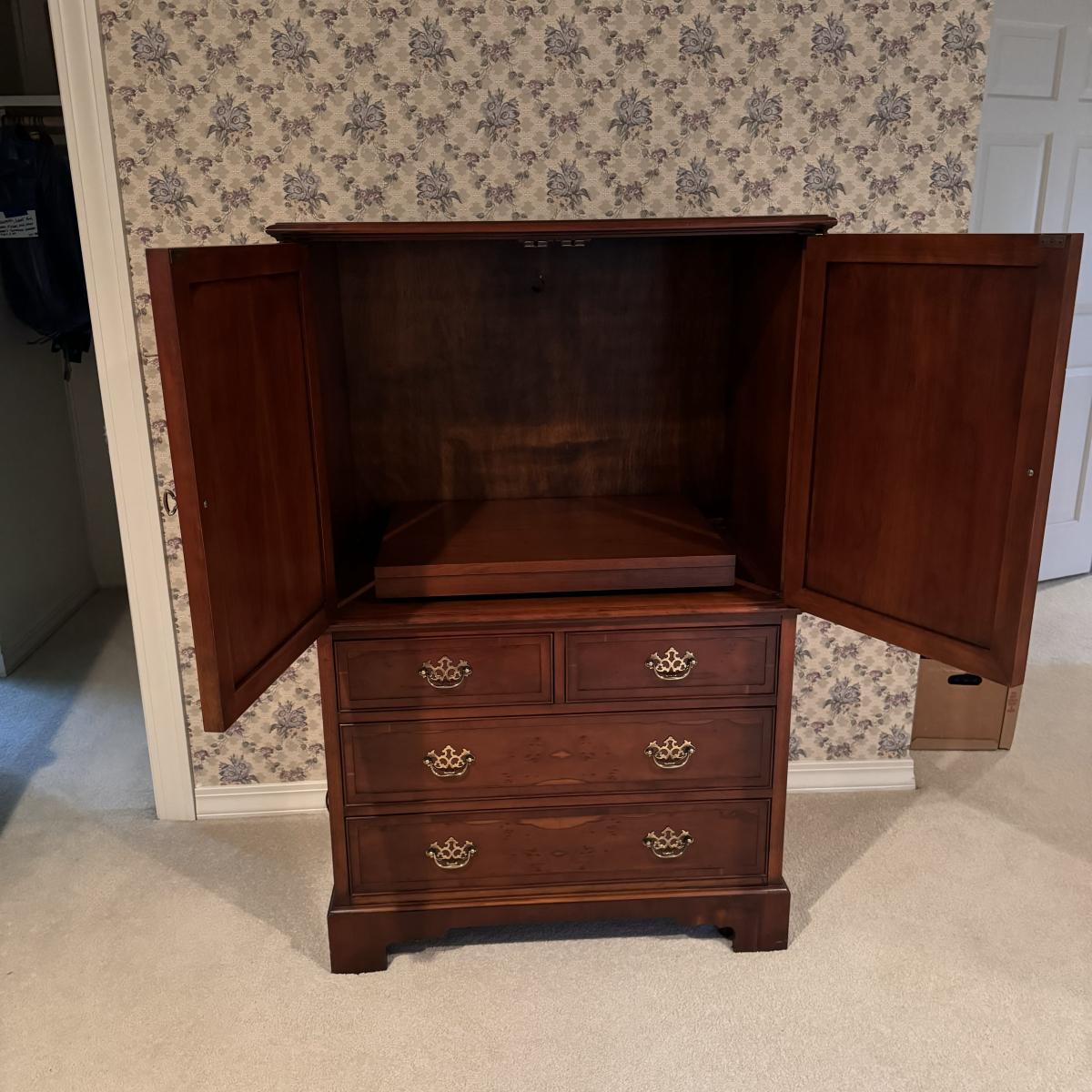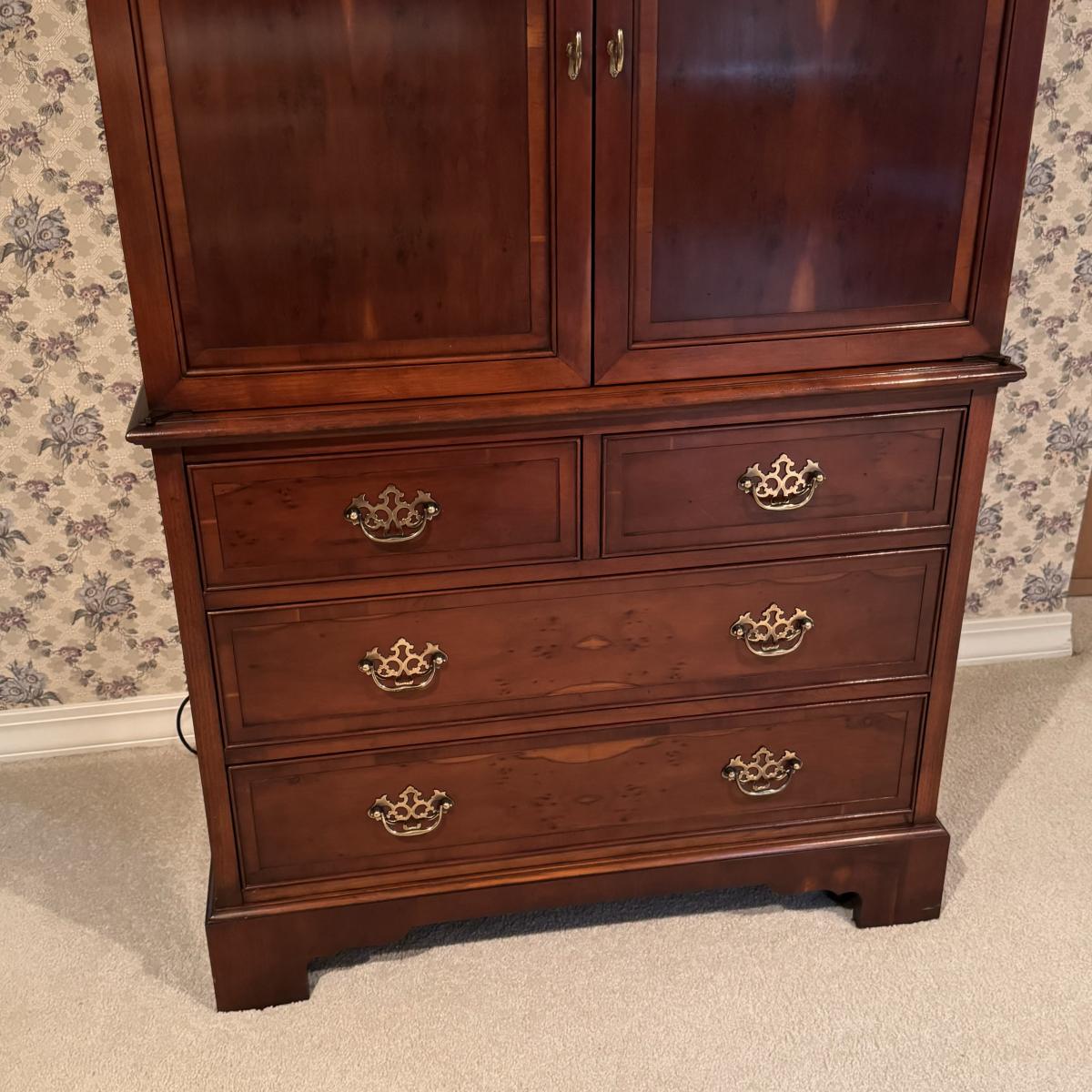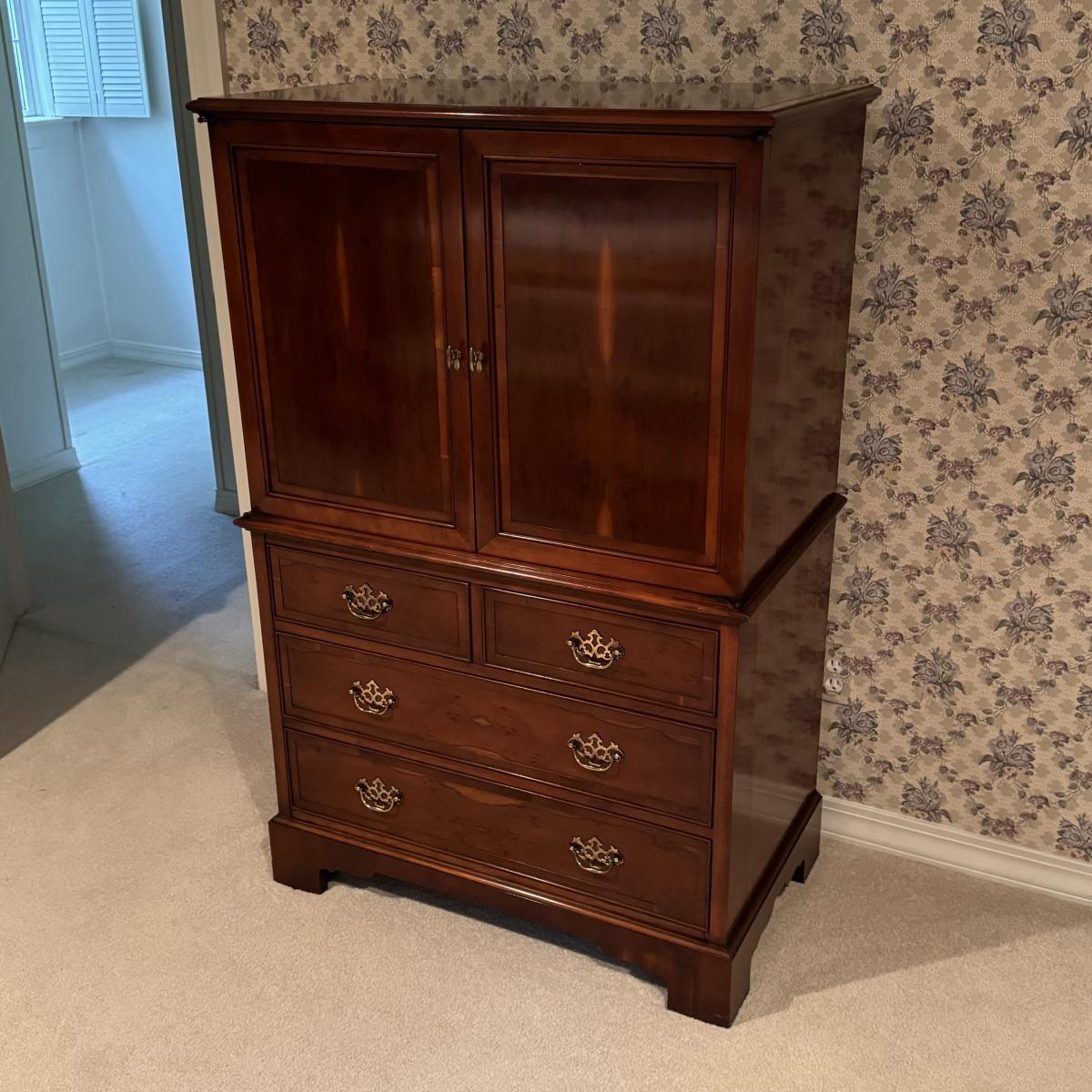 This lot includes one inlaid yew wood entertainment cabinet chest by Hekman. The top half of this piece opens up to a sliding tray that is perfect for a TV but could also house or hide other items. The bottom half has four drawers that all open smoothly. The cabinet measures 34.5” x 20” x 53”H. Local pickup only. Winning bidder must bring assistance to help move and load this item due to its weight and size. Item is located up a flight of stairs.