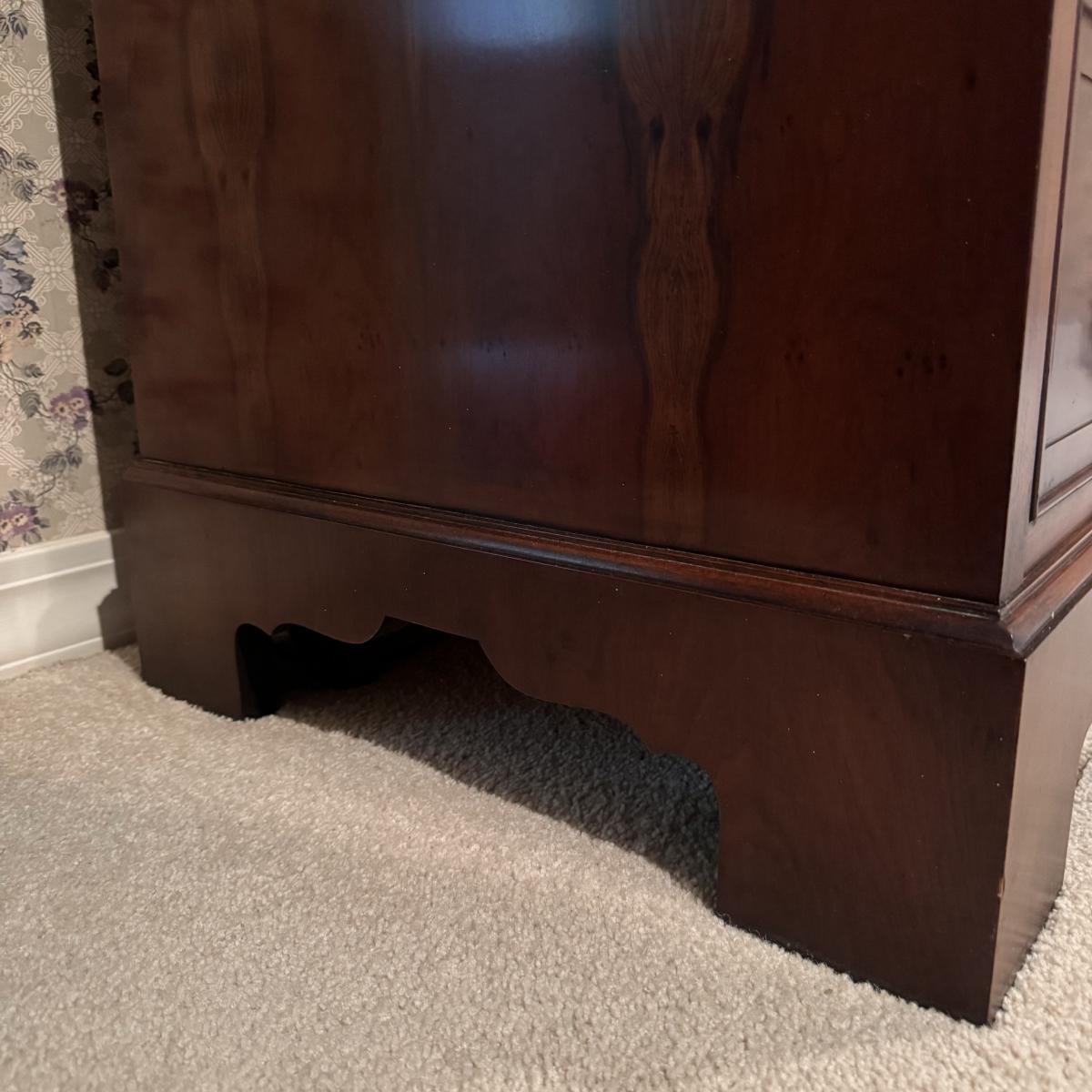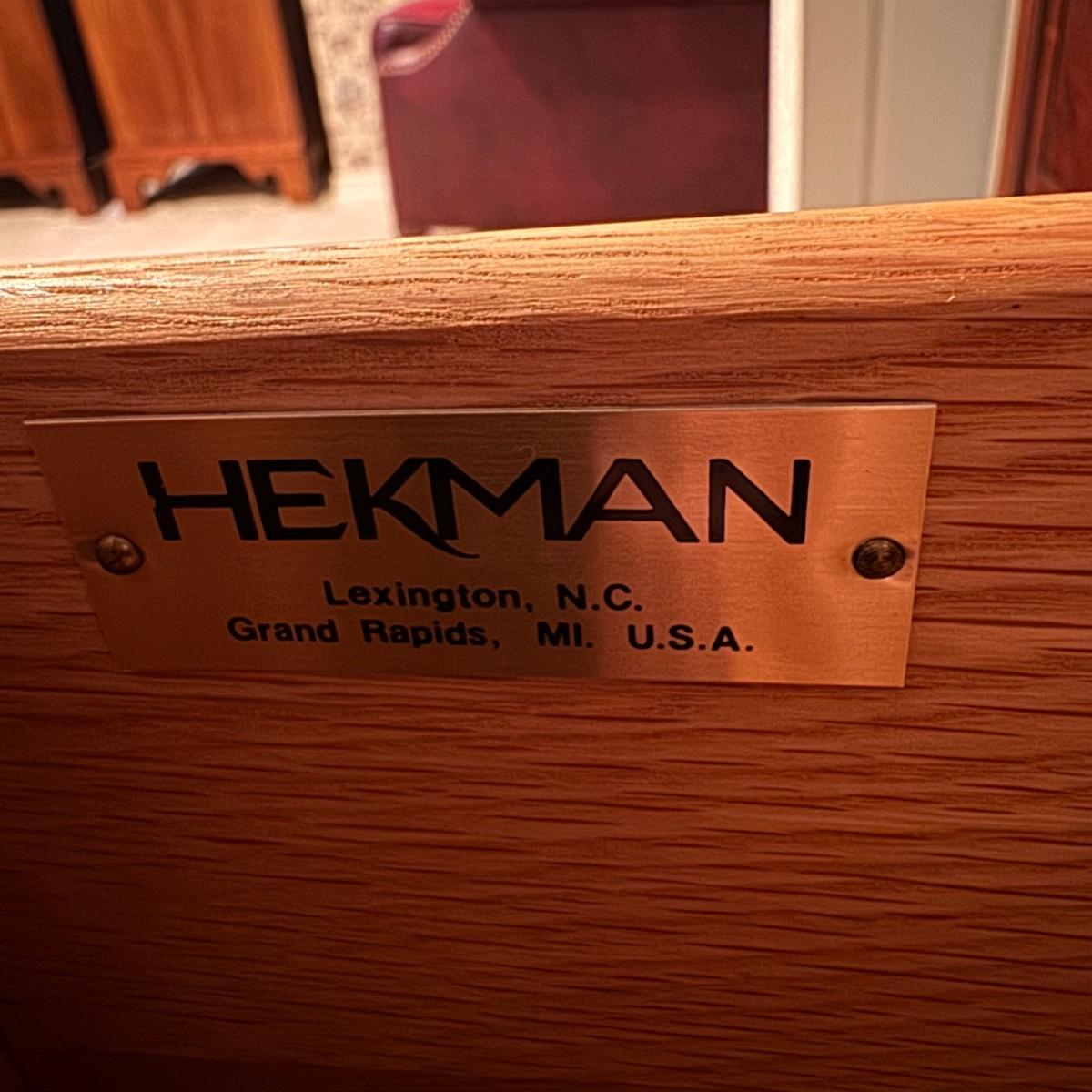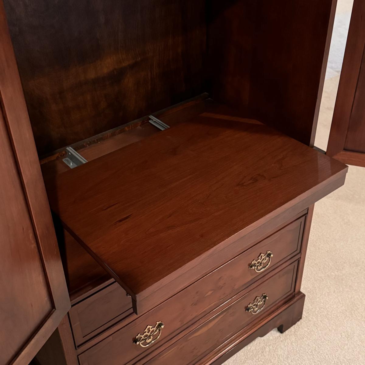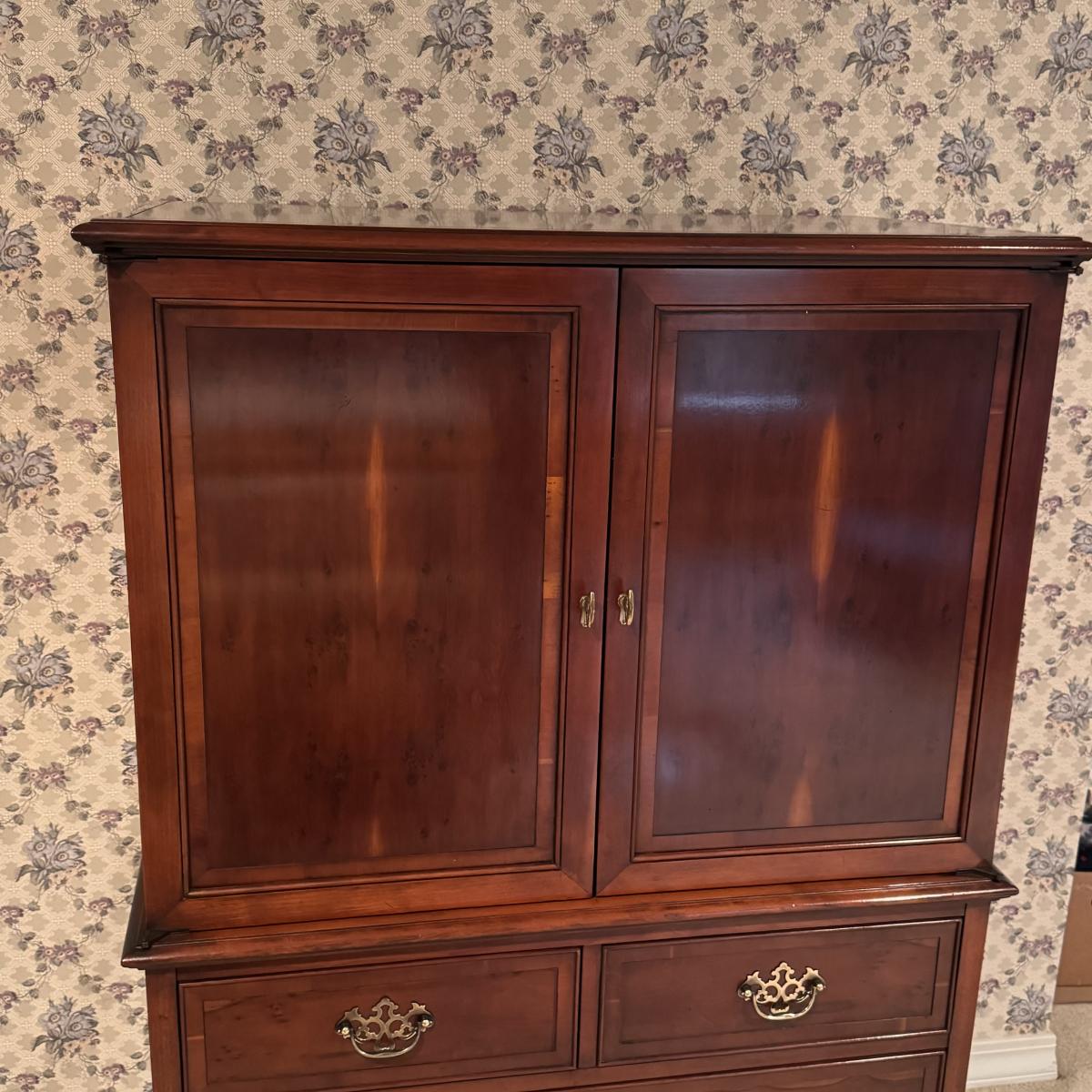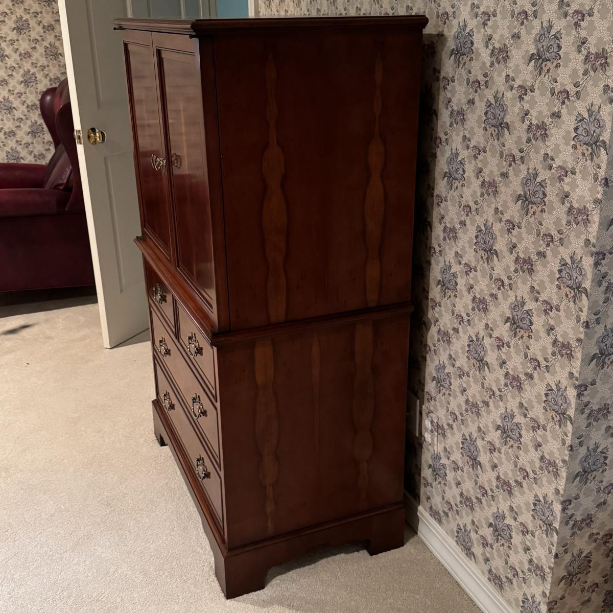 This lot includes one inlaid yew wood entertainment cabinet chest by Hekman. The top half of this piece opens up to a sliding tray that is perfect for a TV but could also house or hide other items. The bottom half has four drawers that all open smoothly. The cabinet measures 34.5” x 20” x 53”H. Local pickup only. Winning bidder must bring assistance to help move and load this item due to its weight and size. Item is located up a flight of stairs.