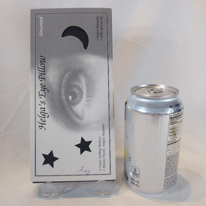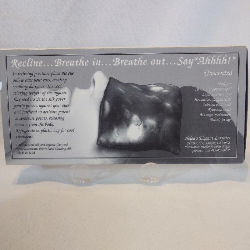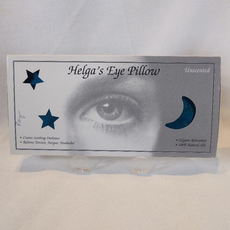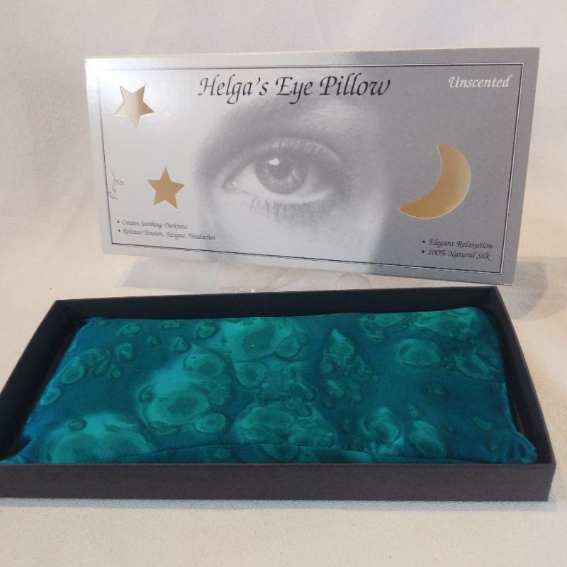 This is a teal silk eye pillow. Appears unused in its original 4-inch X 8-inch box. Looking for a good night's sleep - cover your eyes and look no more.