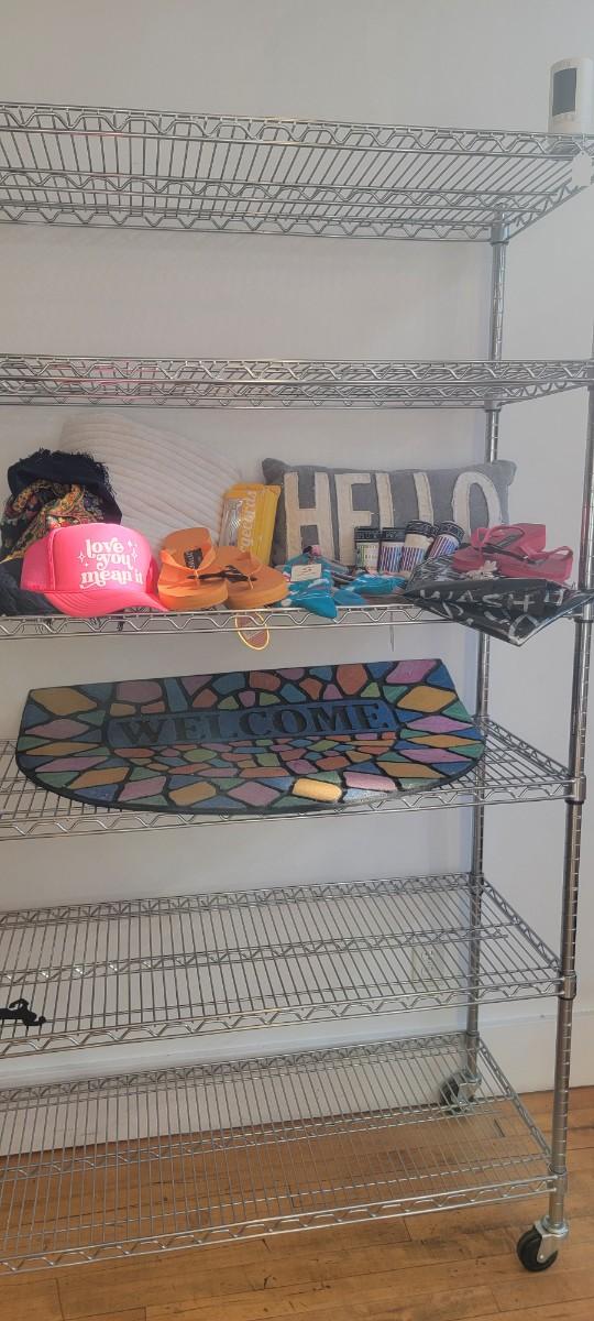 Hello pillow, cream color blanket, socks, and more