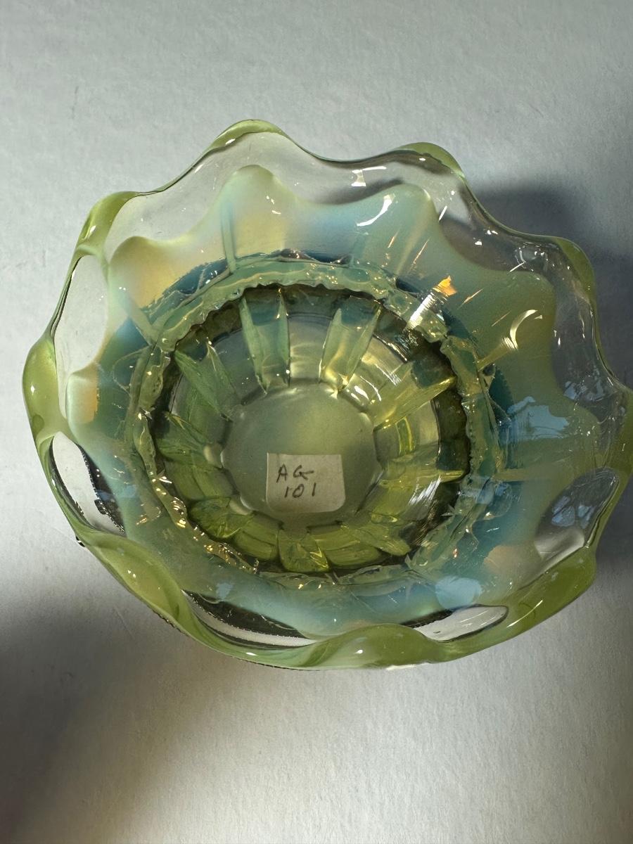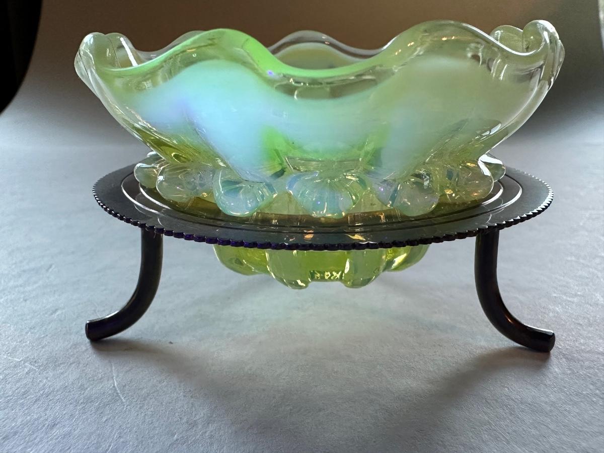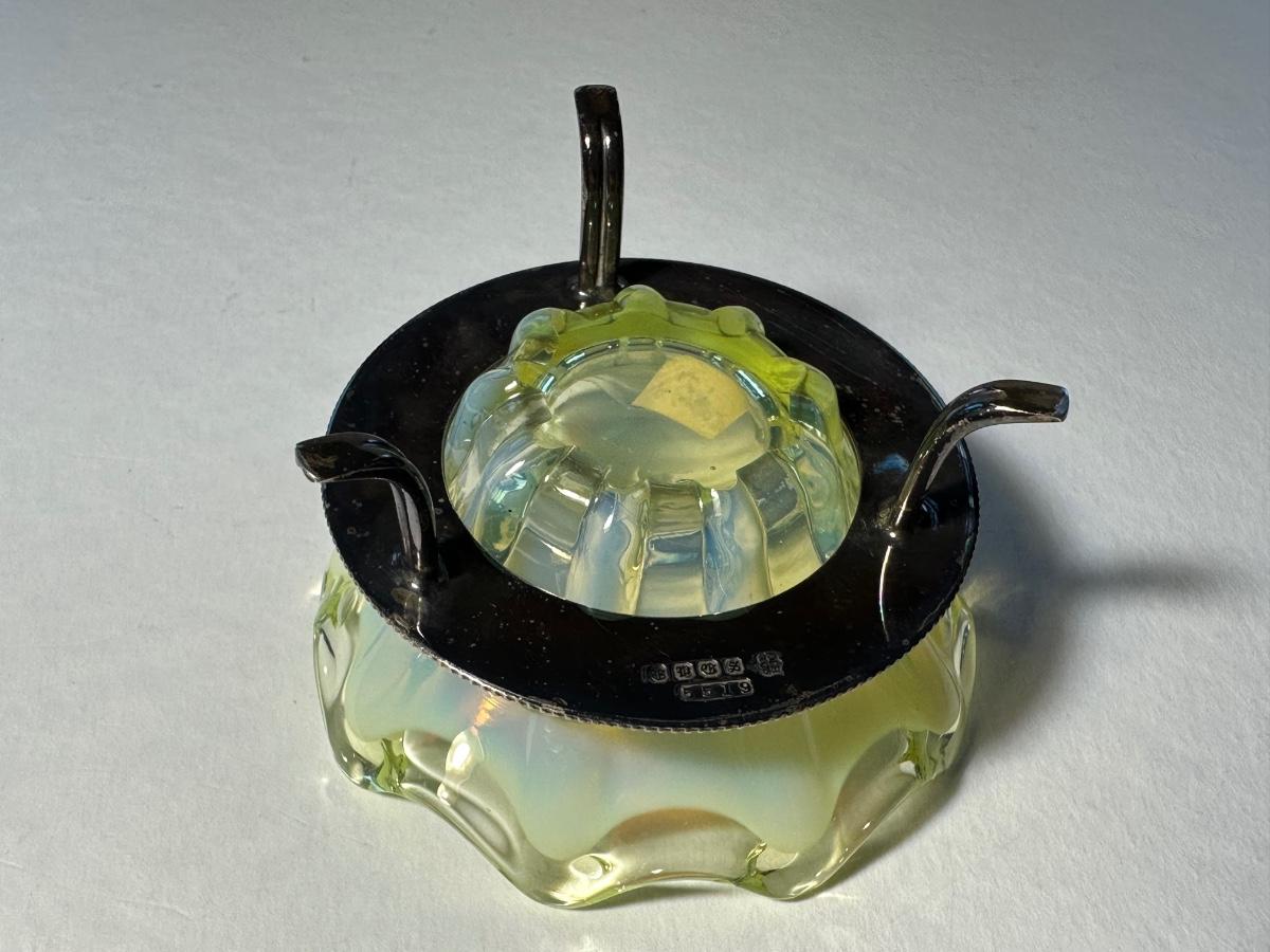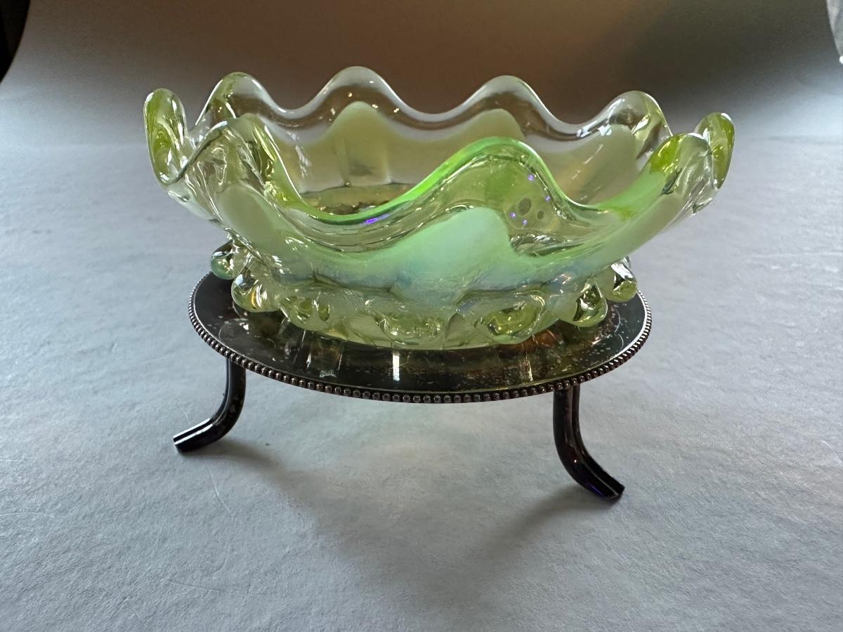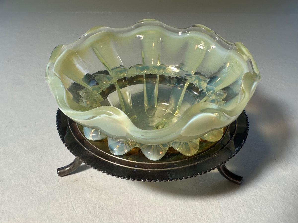 Hello Vaseline and Opalescent Ruffled fits into silver plate holder.