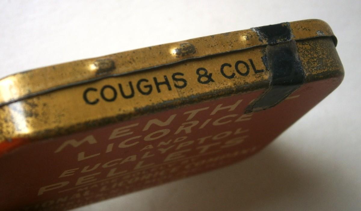 "HELPS" Licorice & Eucalyptol Tin, vintage, 2 1/4 x 1 3/4 in., lithographed tin, in nice condition.
