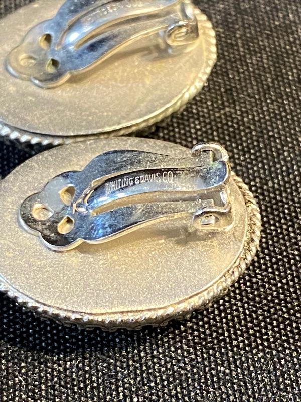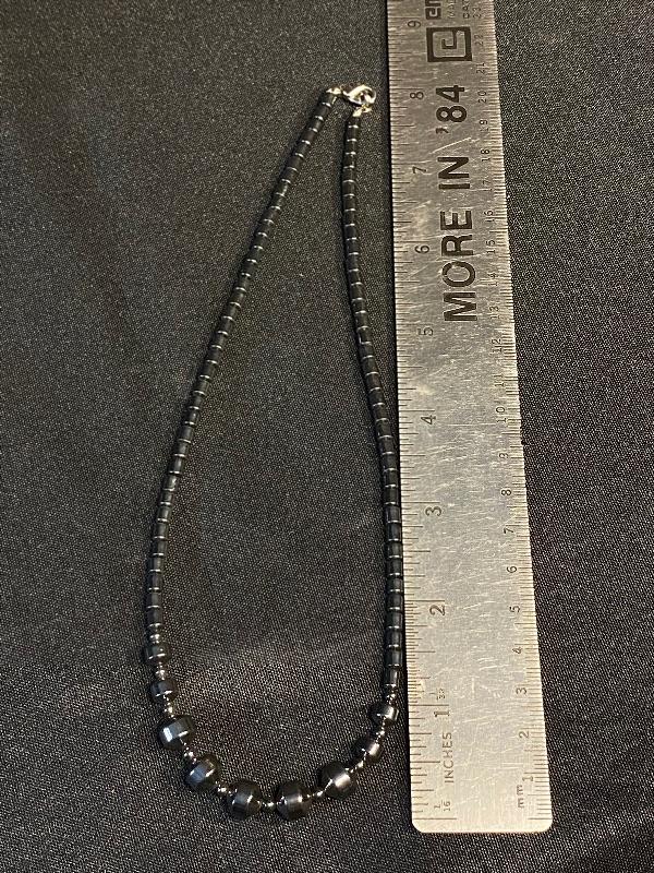Dark Hematite beaded necklace and earrings. Short necklace is almost choker style at 8" length. Graduated beads in the center give simple detail. Earrings are vintage Whiting & Davis Co. clip style earrings. Large oval shape, about 1" in size.