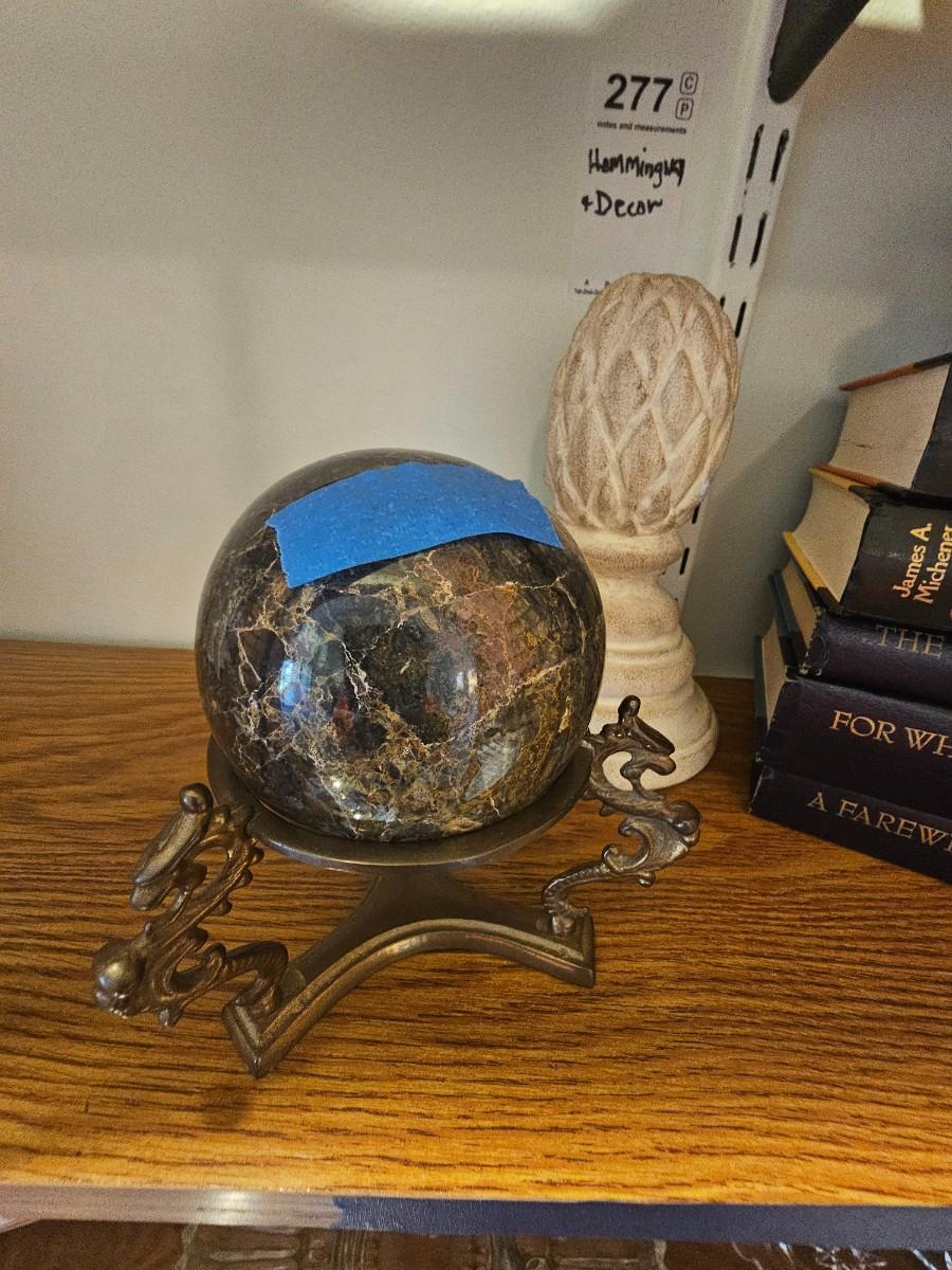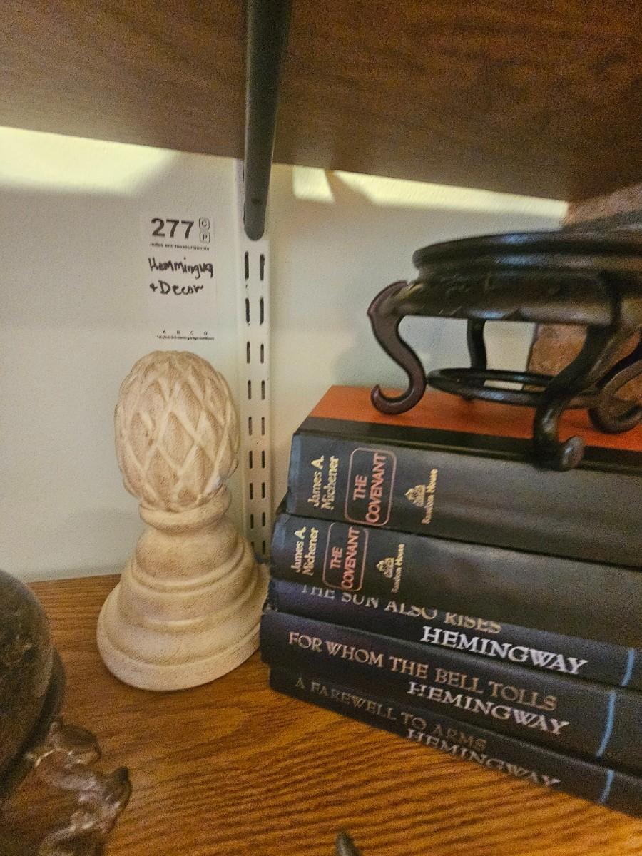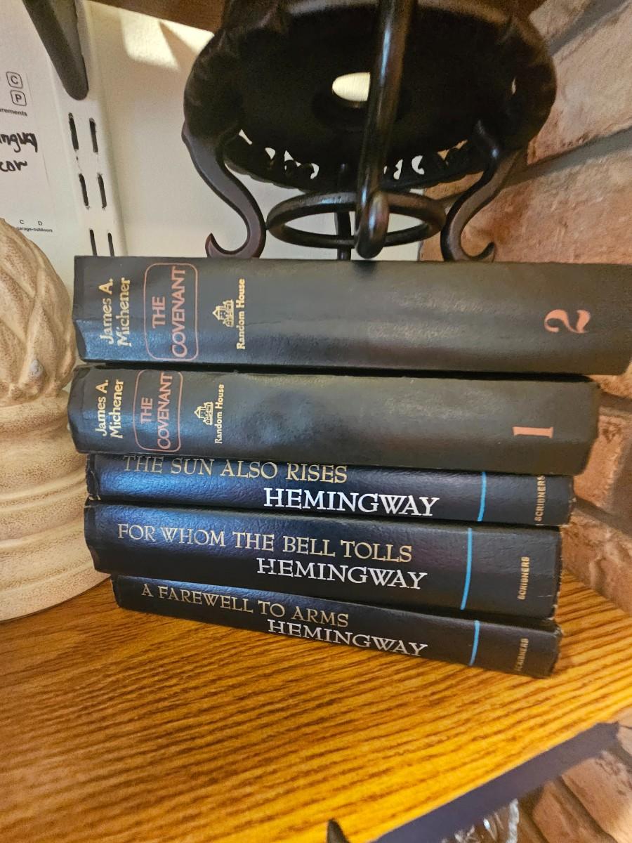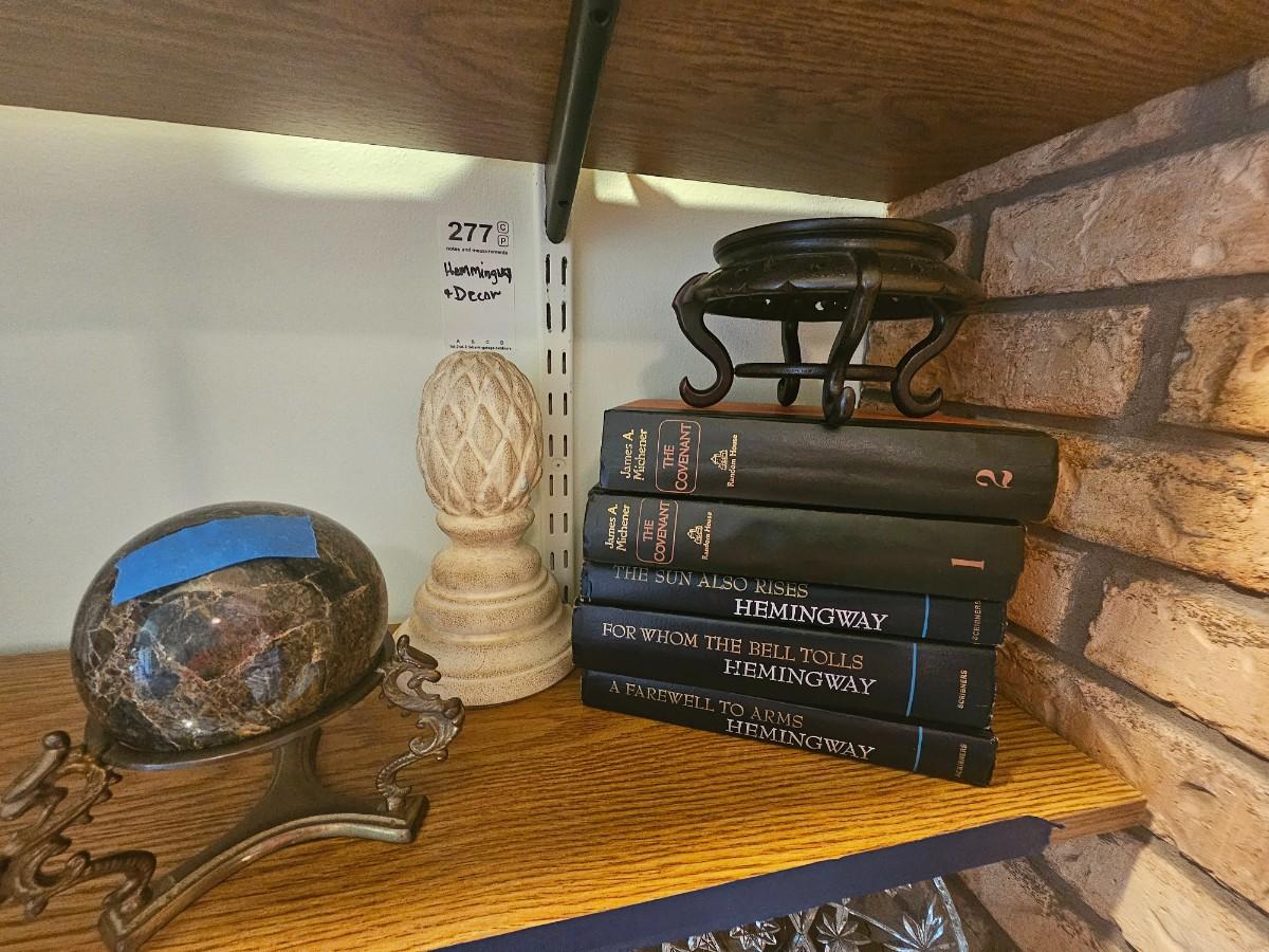 Collection of Hemmingway books, James A. Michener books, Asian plant stand, home decor pieces