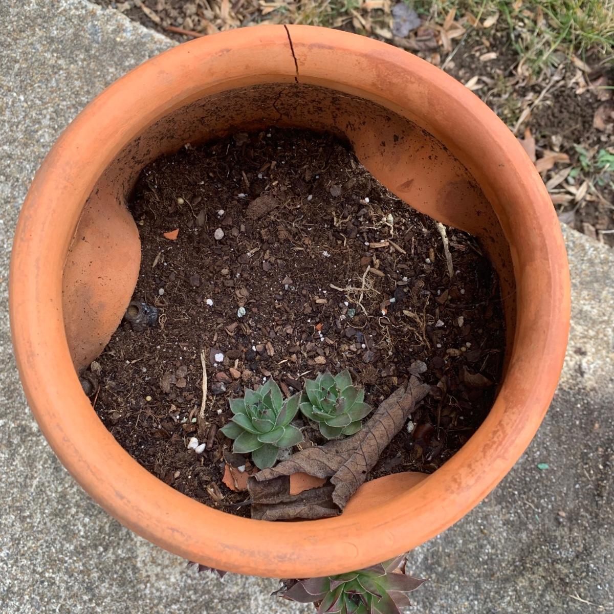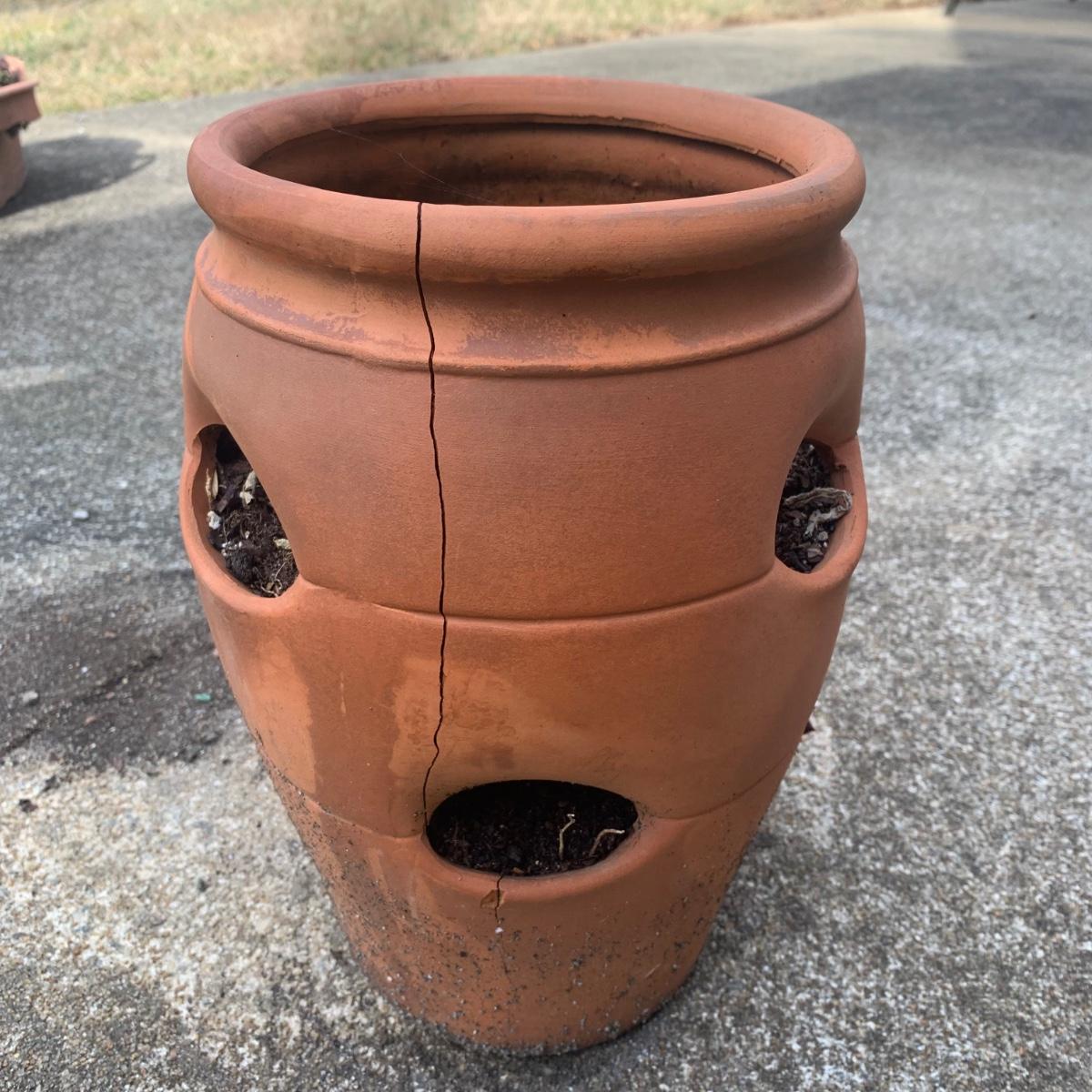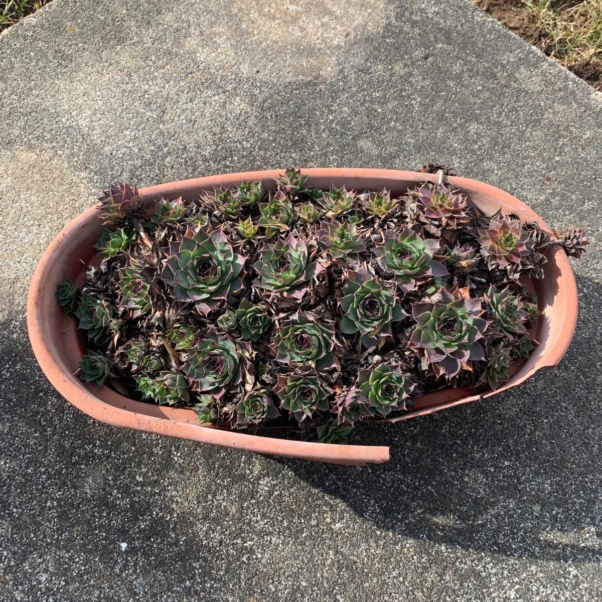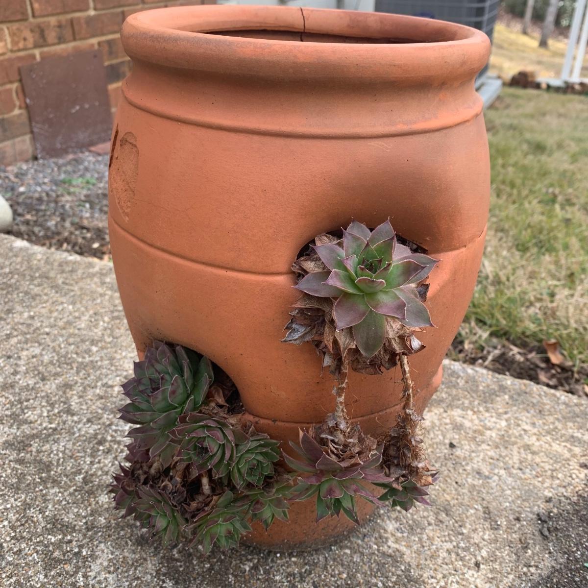 Hen and Chicks succulents, two pots included. One pot is a terracotta strawberry pot and the other a plastic terracotta-colored pot. Please note, both have multiple cracks and are quite fragile. Please see photos for more details. Larger pot measures, 17” x 9” x 6”H.