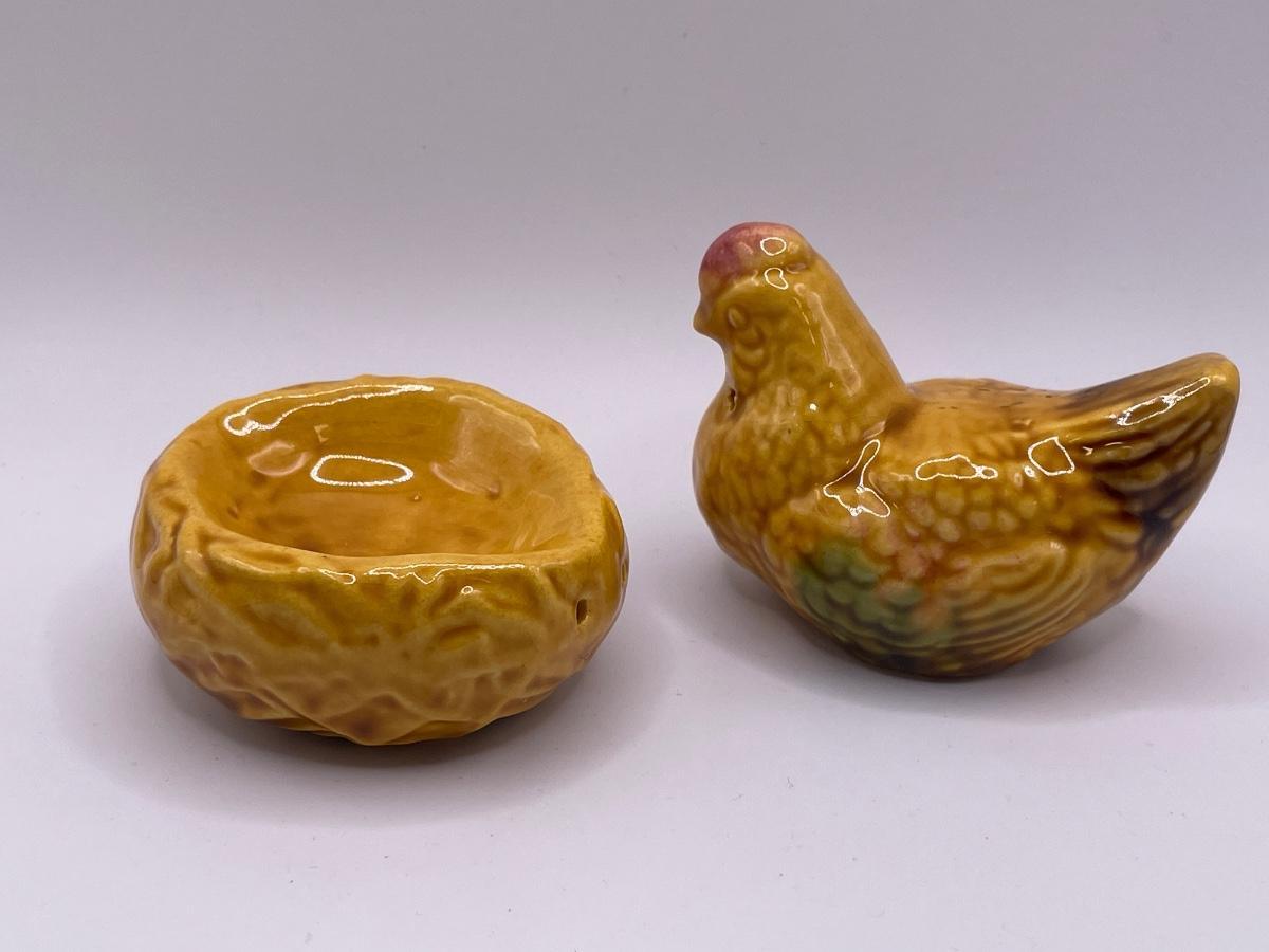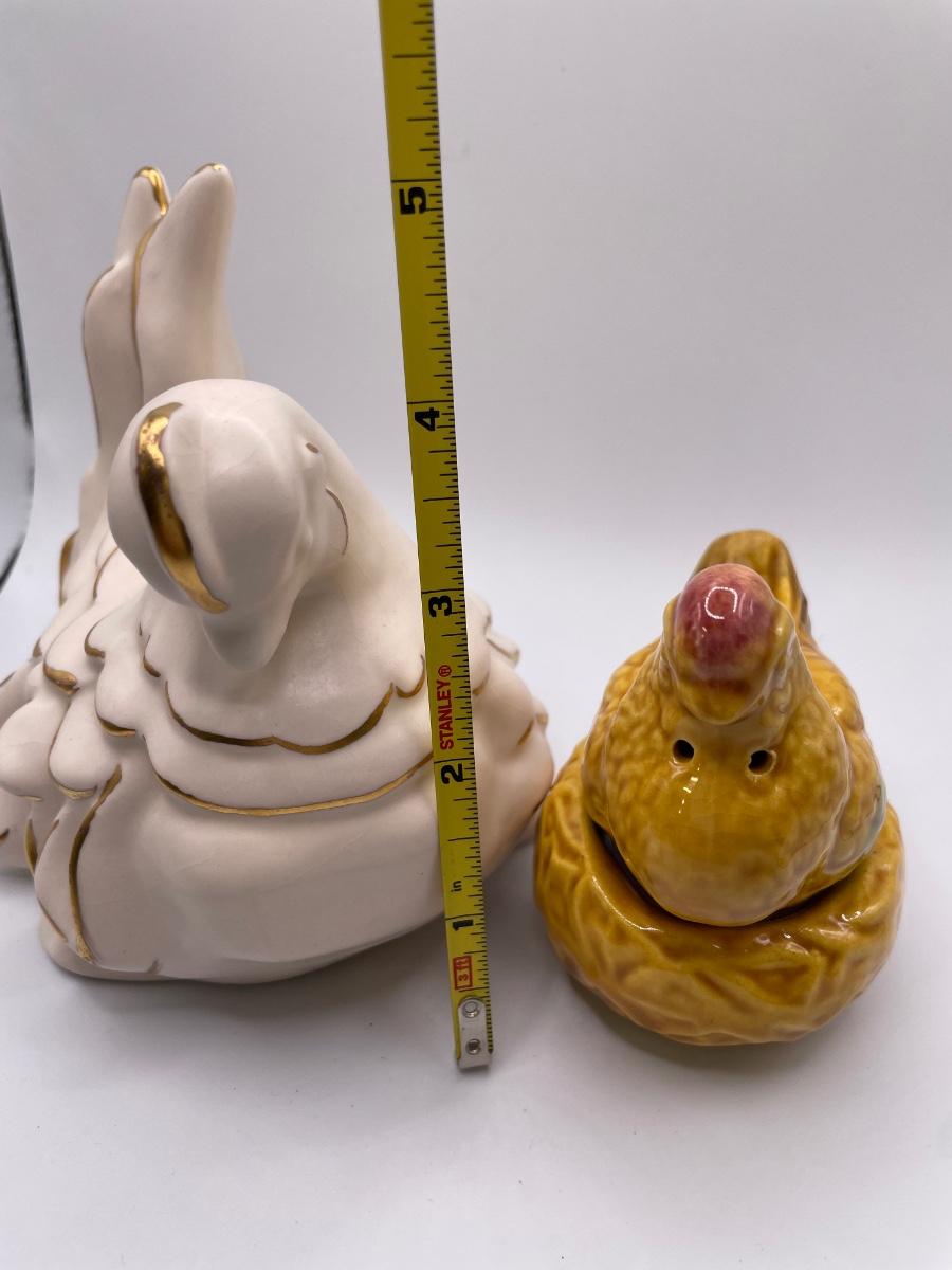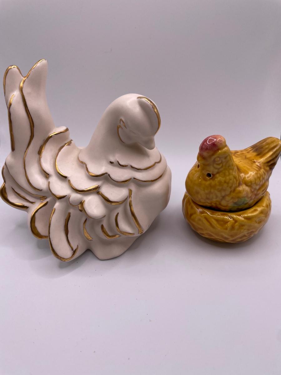 Hen, rooster and nest S&P shakers with cream and gold hen