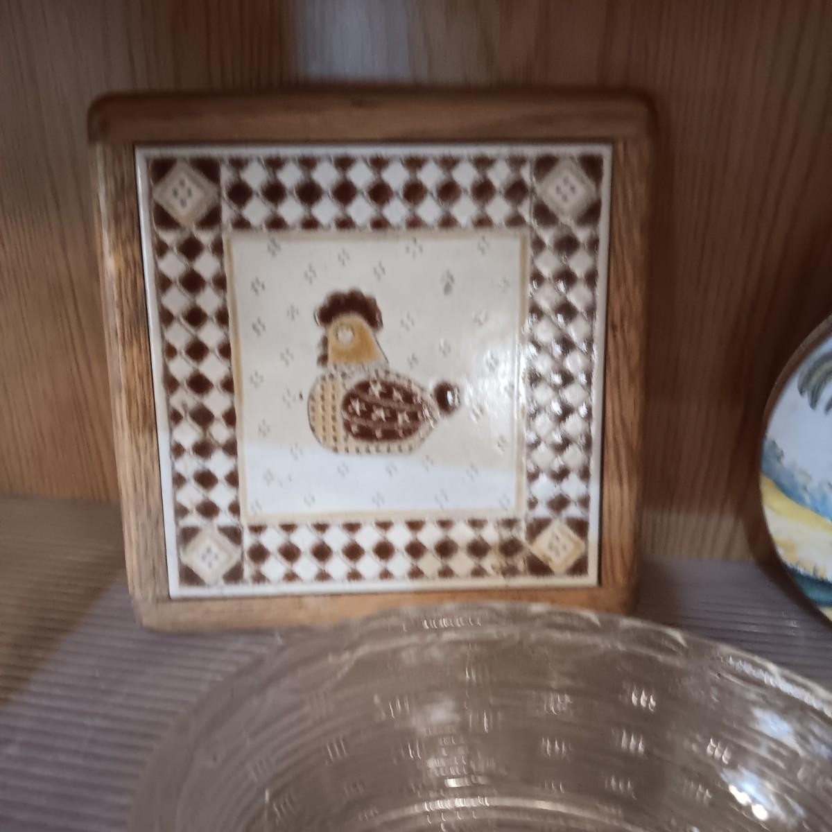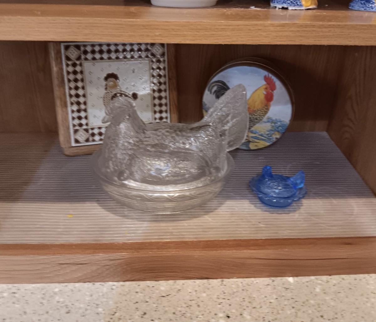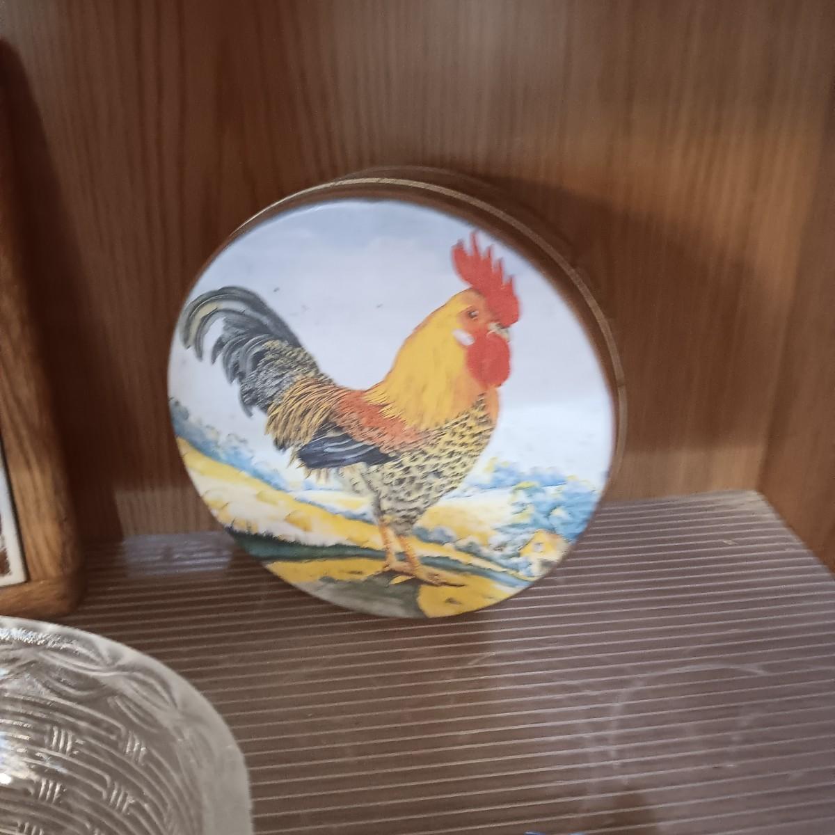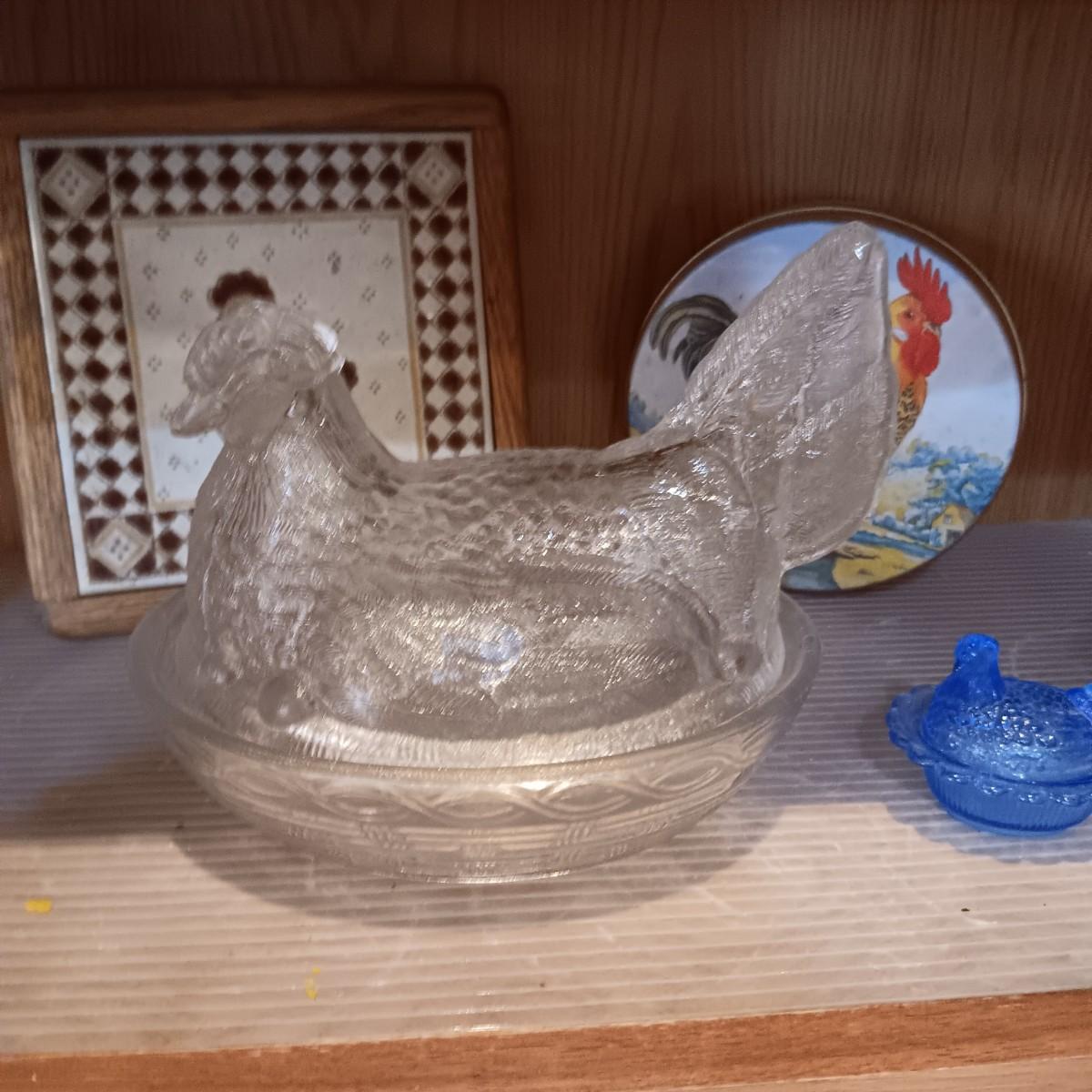 LARGE AND SMALL HENS ON NEST, ROOSTER HOT PLATE AND A TIN