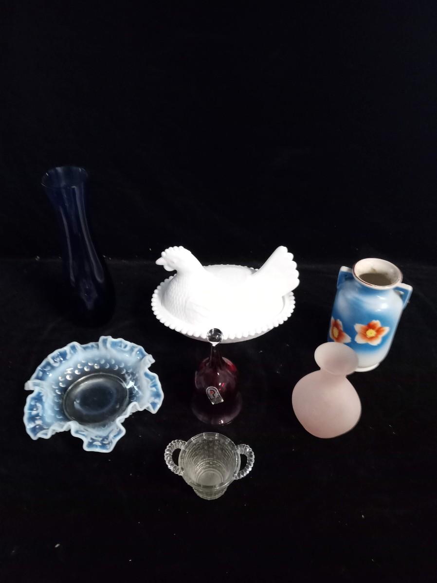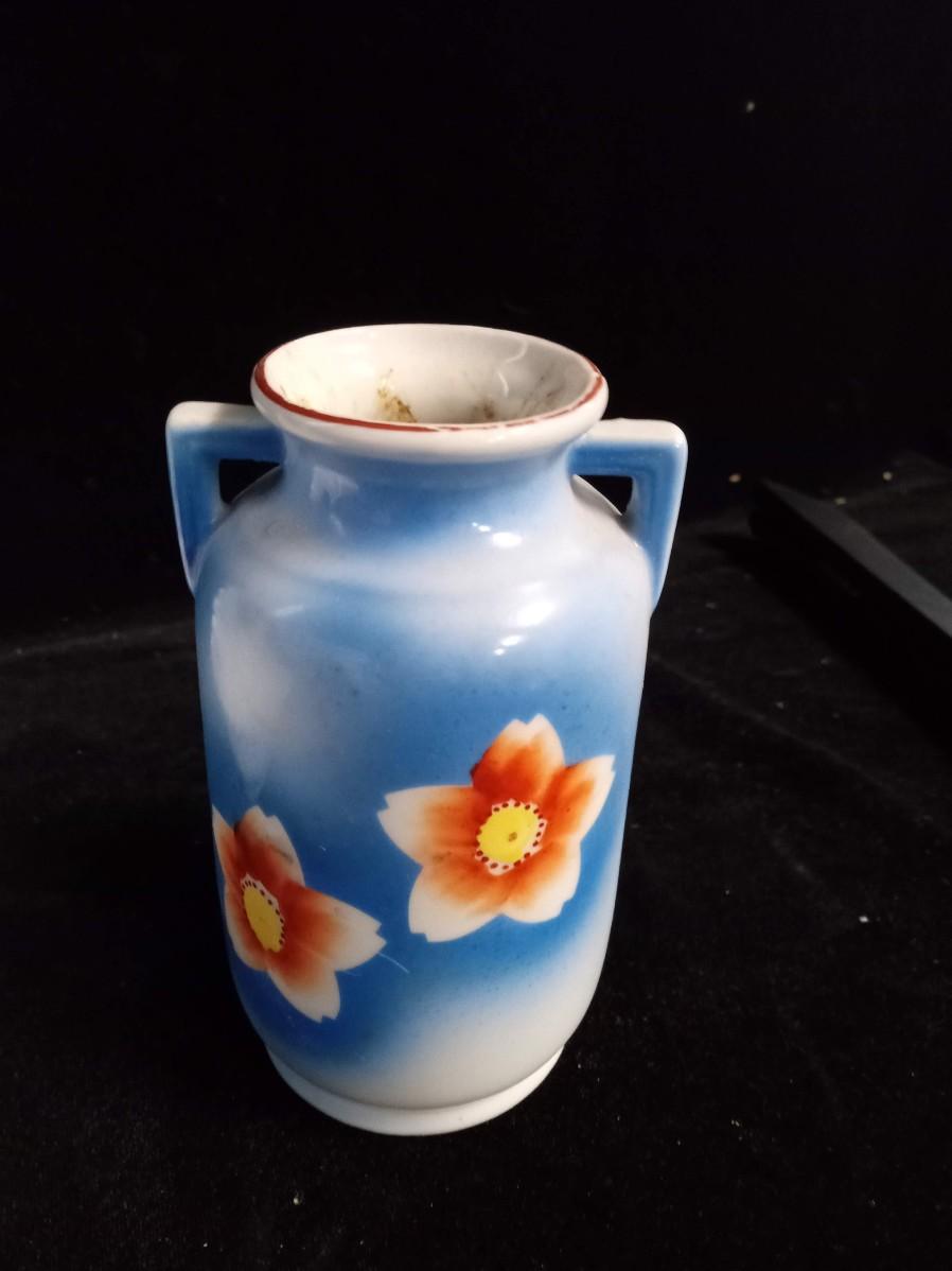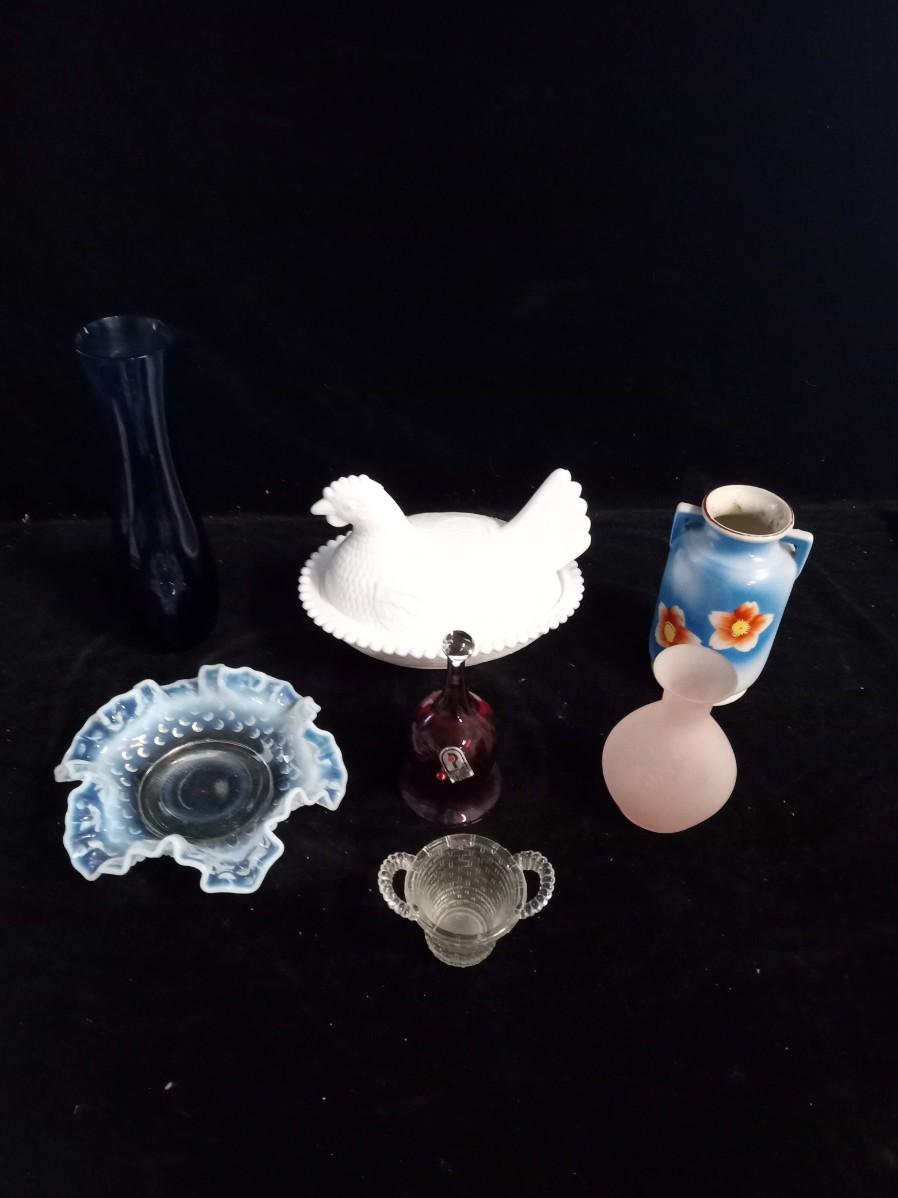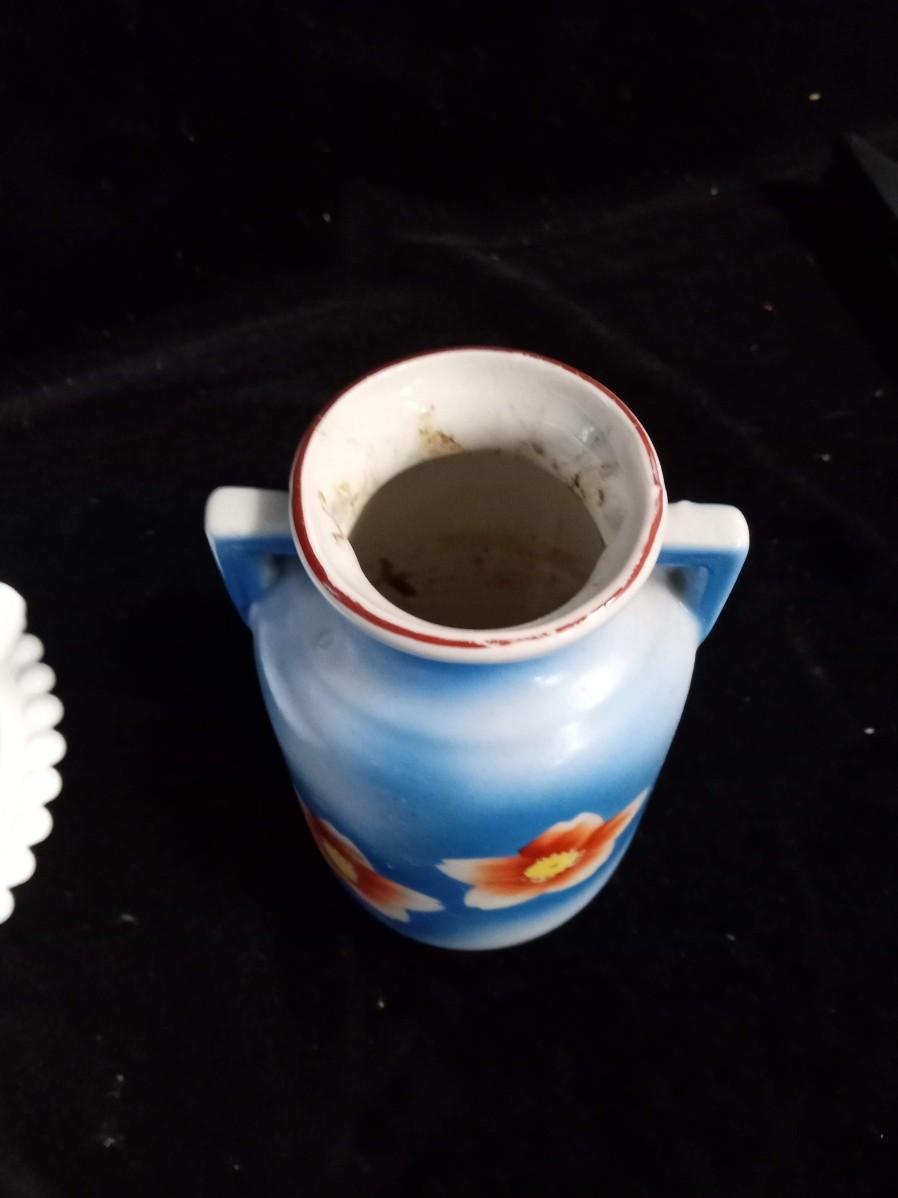 ALSO INCLUDES A HANDPAINTED VASE AND A SMALL GLASS DOUBLE-HANDLED CUP AND A BLUE GLASS VASE