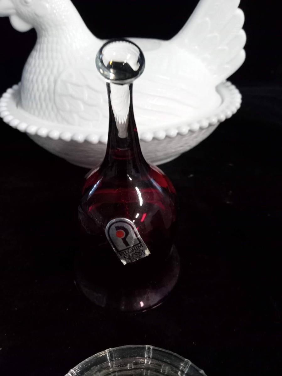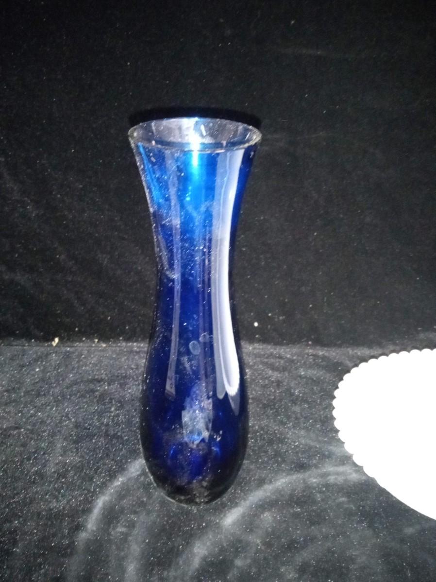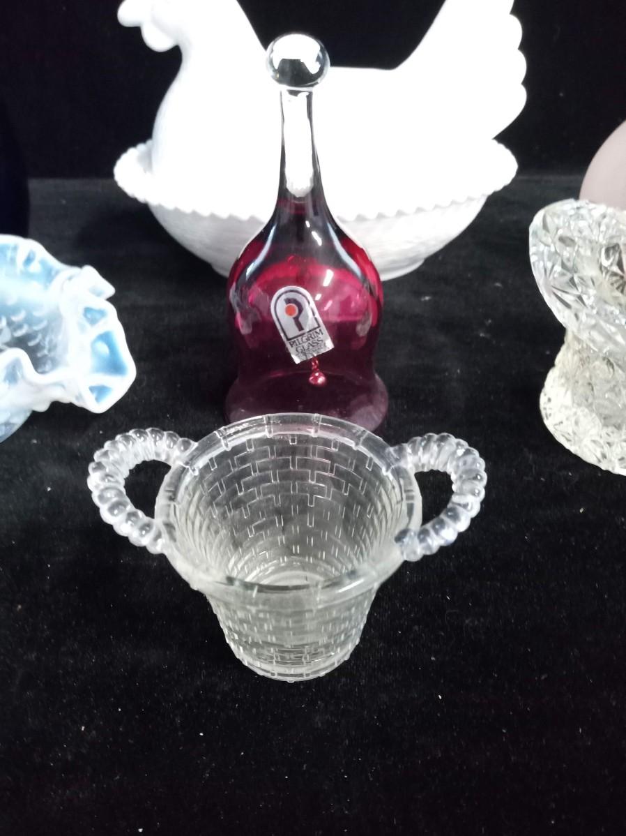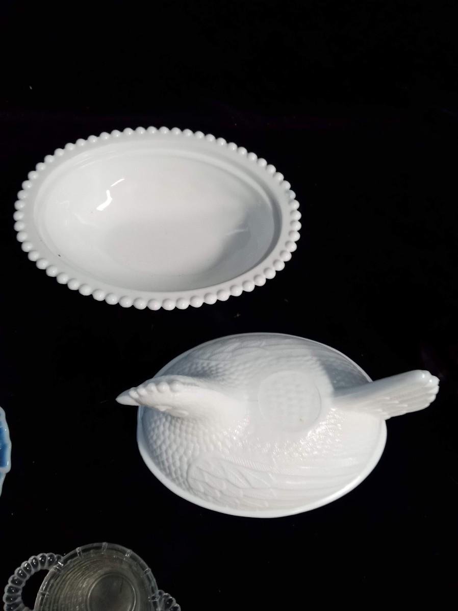 ALSO INCLUDES A HANDPAINTED VASE AND A SMALL GLASS DOUBLE-HANDLED CUP AND A BLUE GLASS VASE