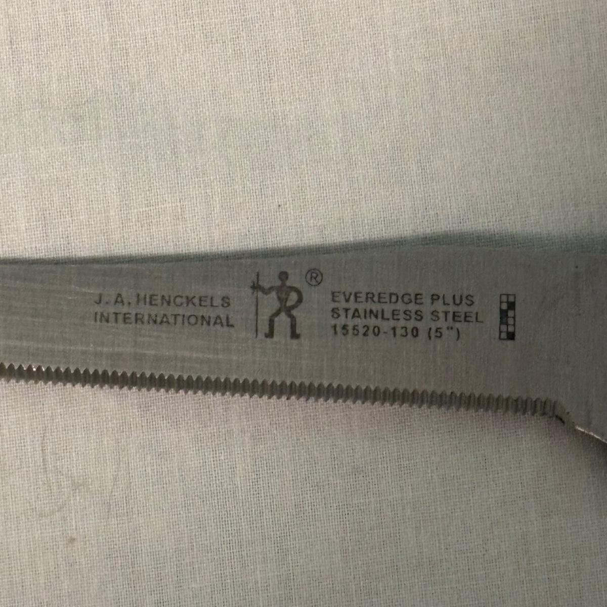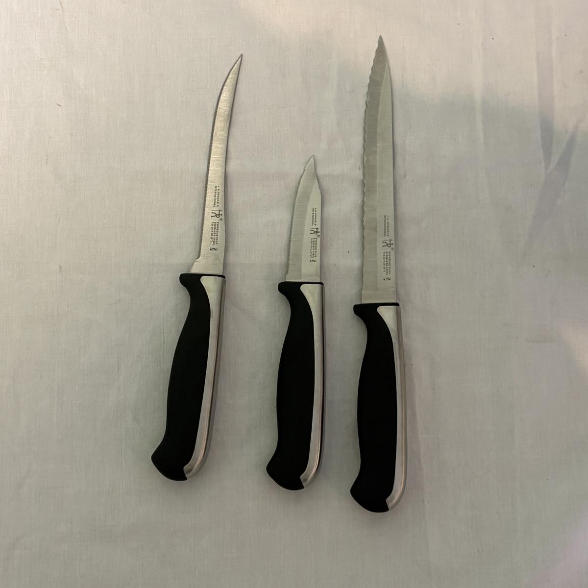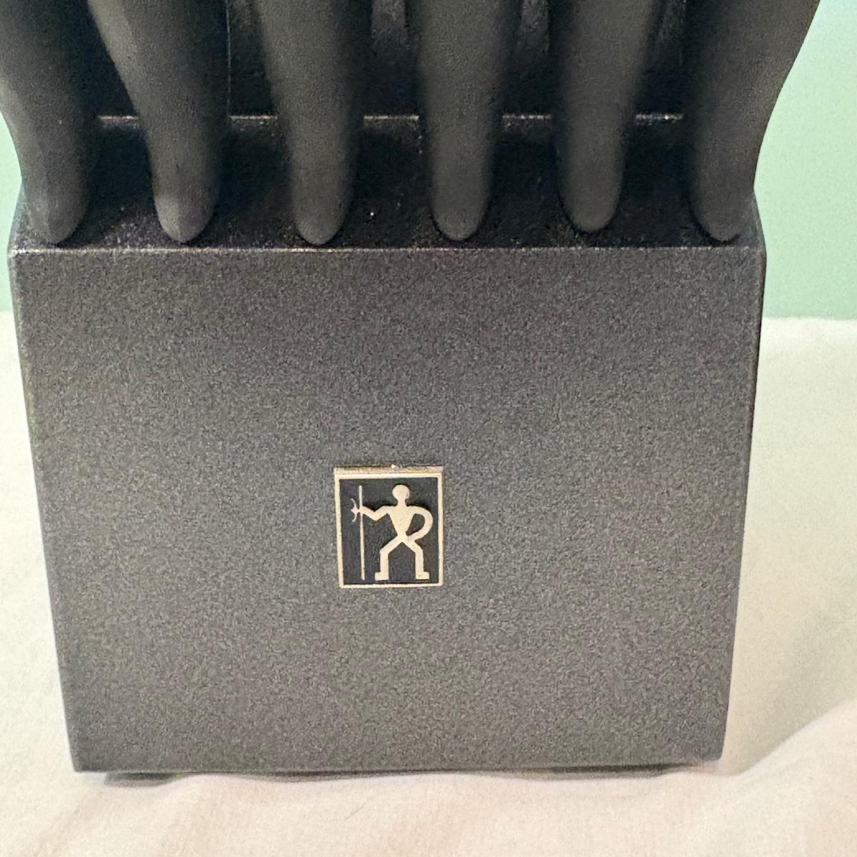 This lot is a Henckels knife block set with 12 knives of varying uses. The measurements of the block are approximately 4.5" x 7" x 7.5"H.