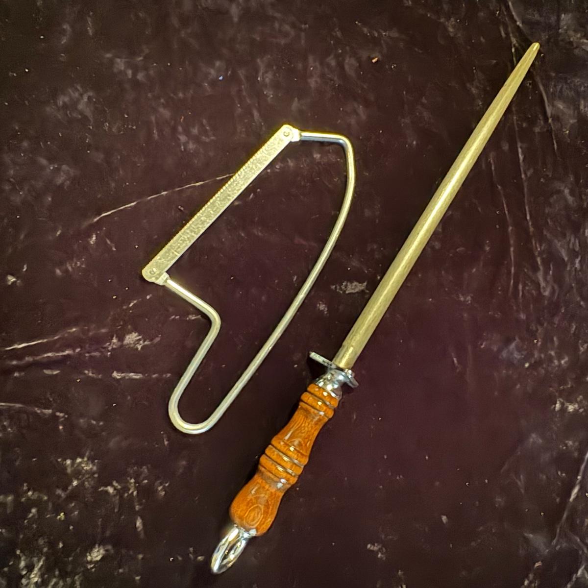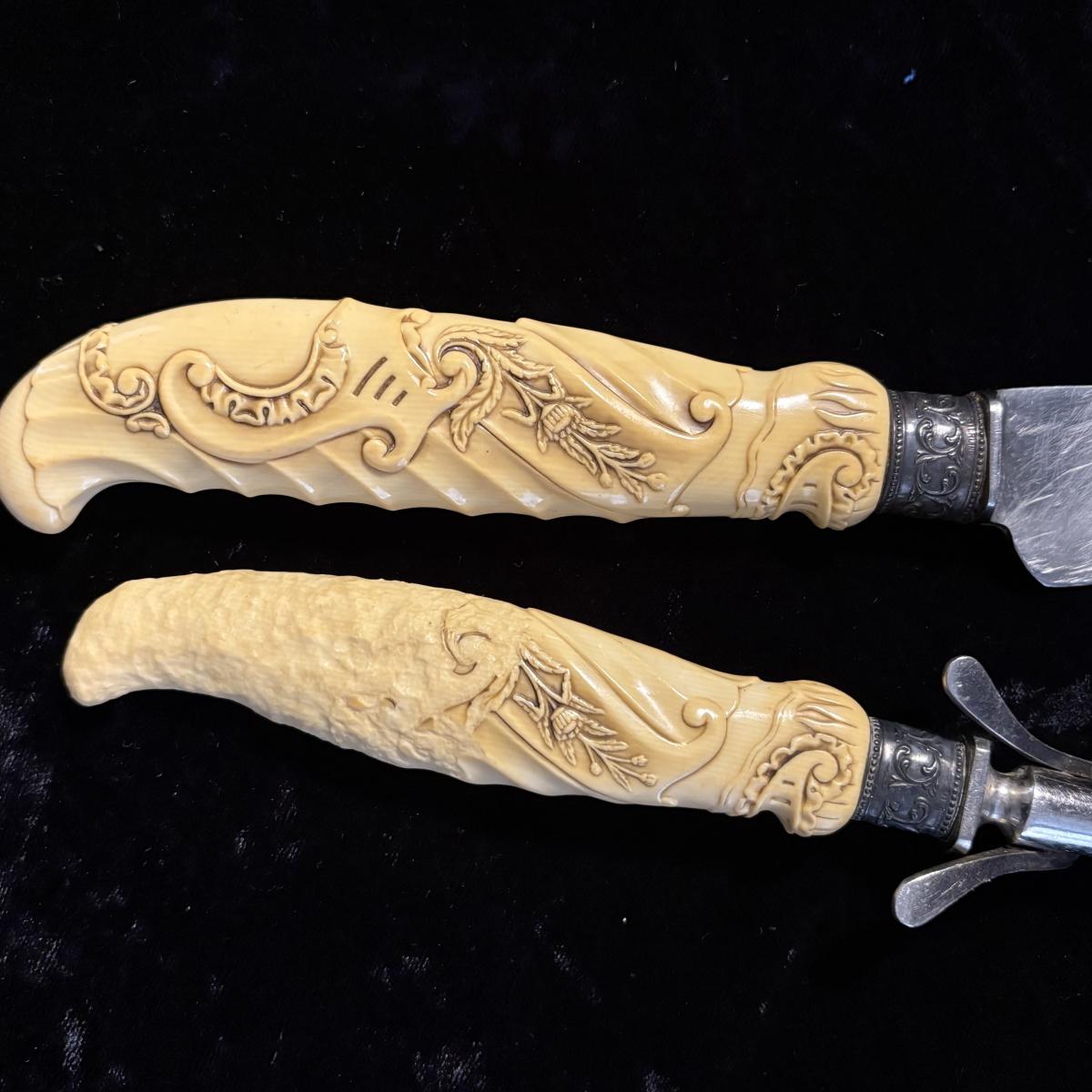 Three sets of carving knives and forks from Norway, Germany, USA. Stainless steel and plastic bone-styled handles. Largest set knife is 15” and fork is 12”. Sharpening steel is 21”.