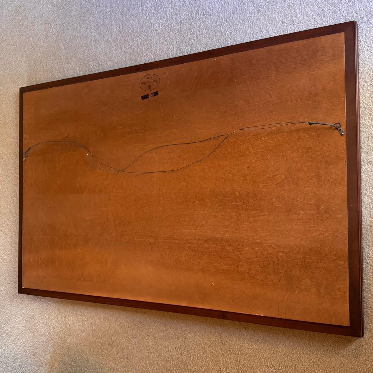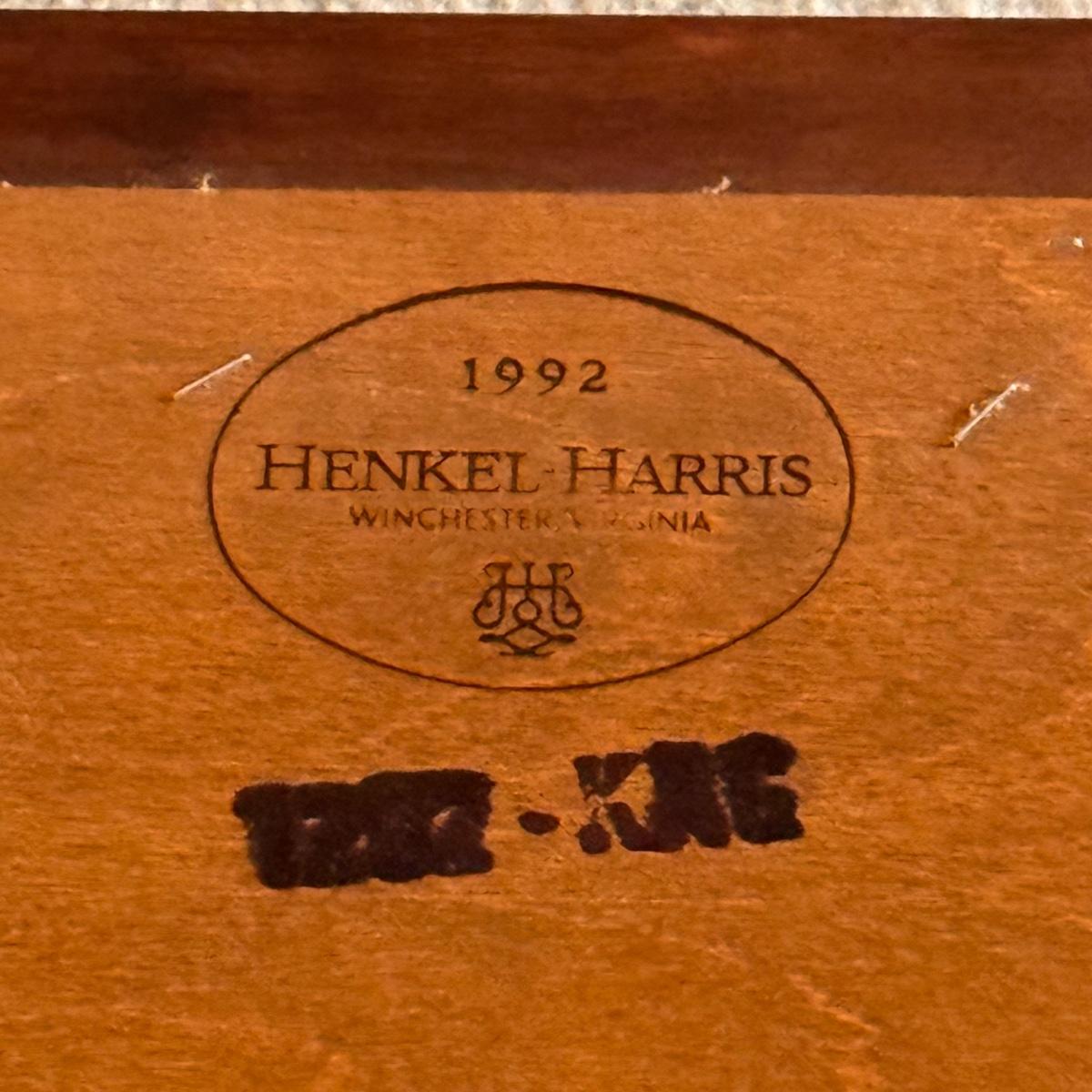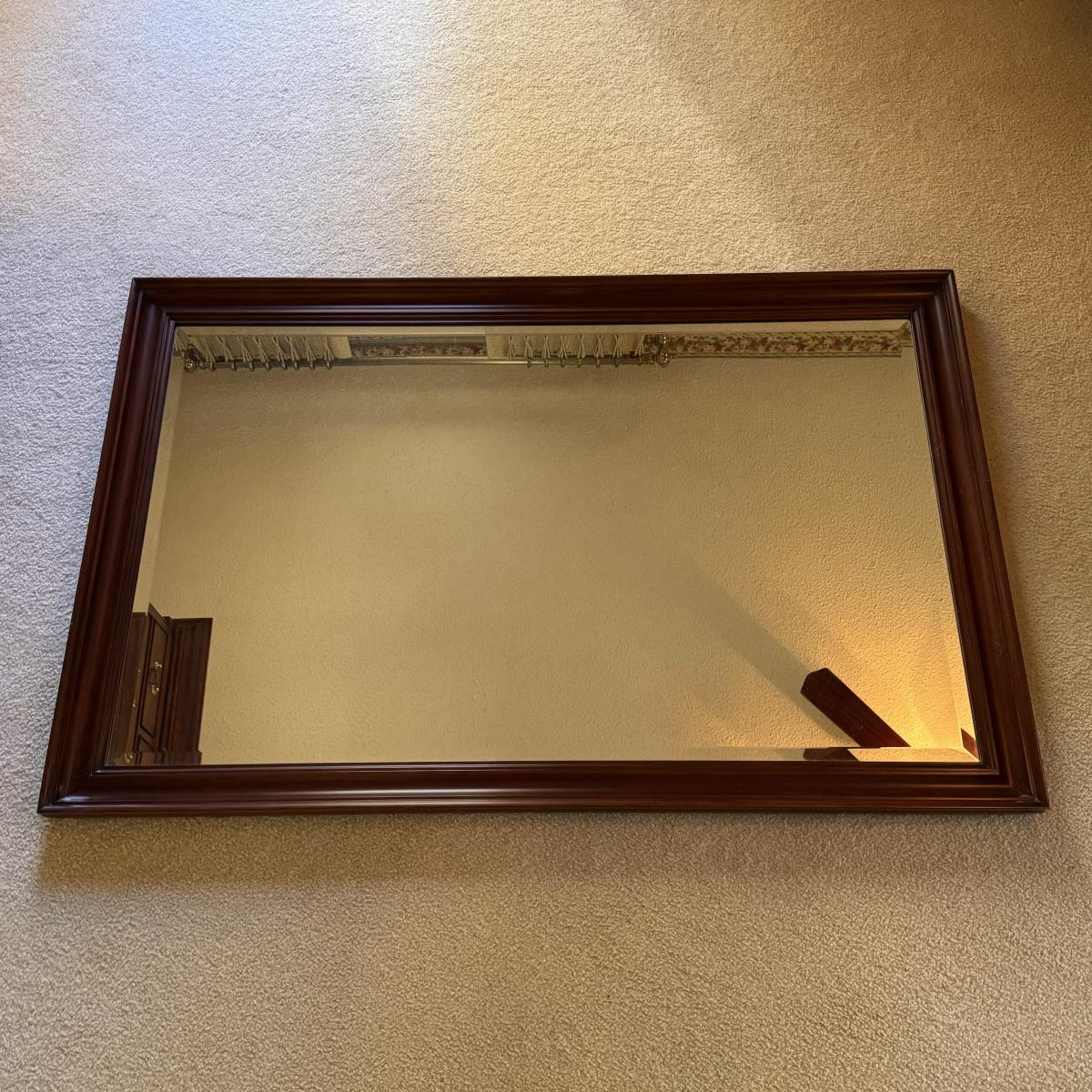 This lot includes one large Henkel Harris mirror in a wooden frame. There is a wire installed to the back of the frame for hanging purposes. The mirror measures 52” x 34”H. Local pickup only.