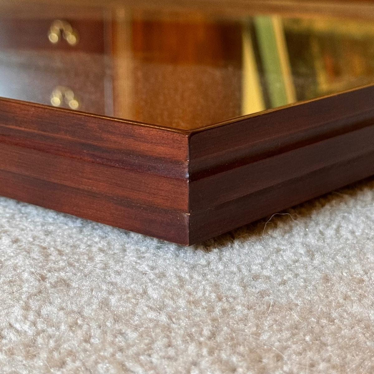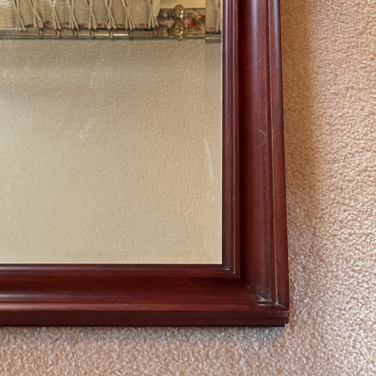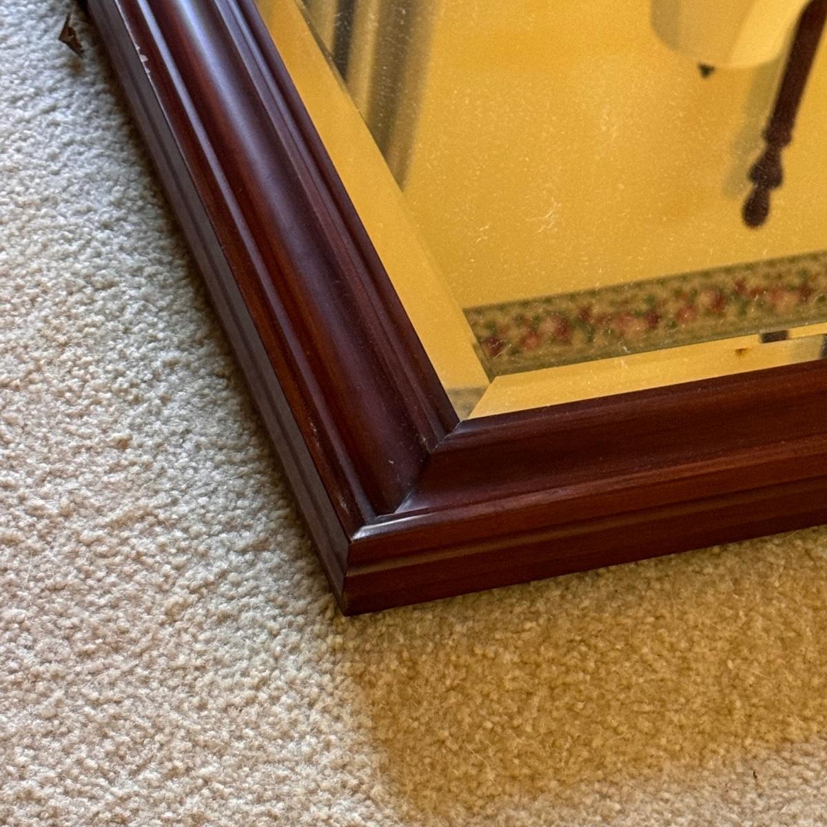 This lot includes one large Henkel Harris mirror in a wooden frame. There is a wire installed to the back of the frame for hanging purposes. The mirror measures 52” x 34”H. Local pickup only.