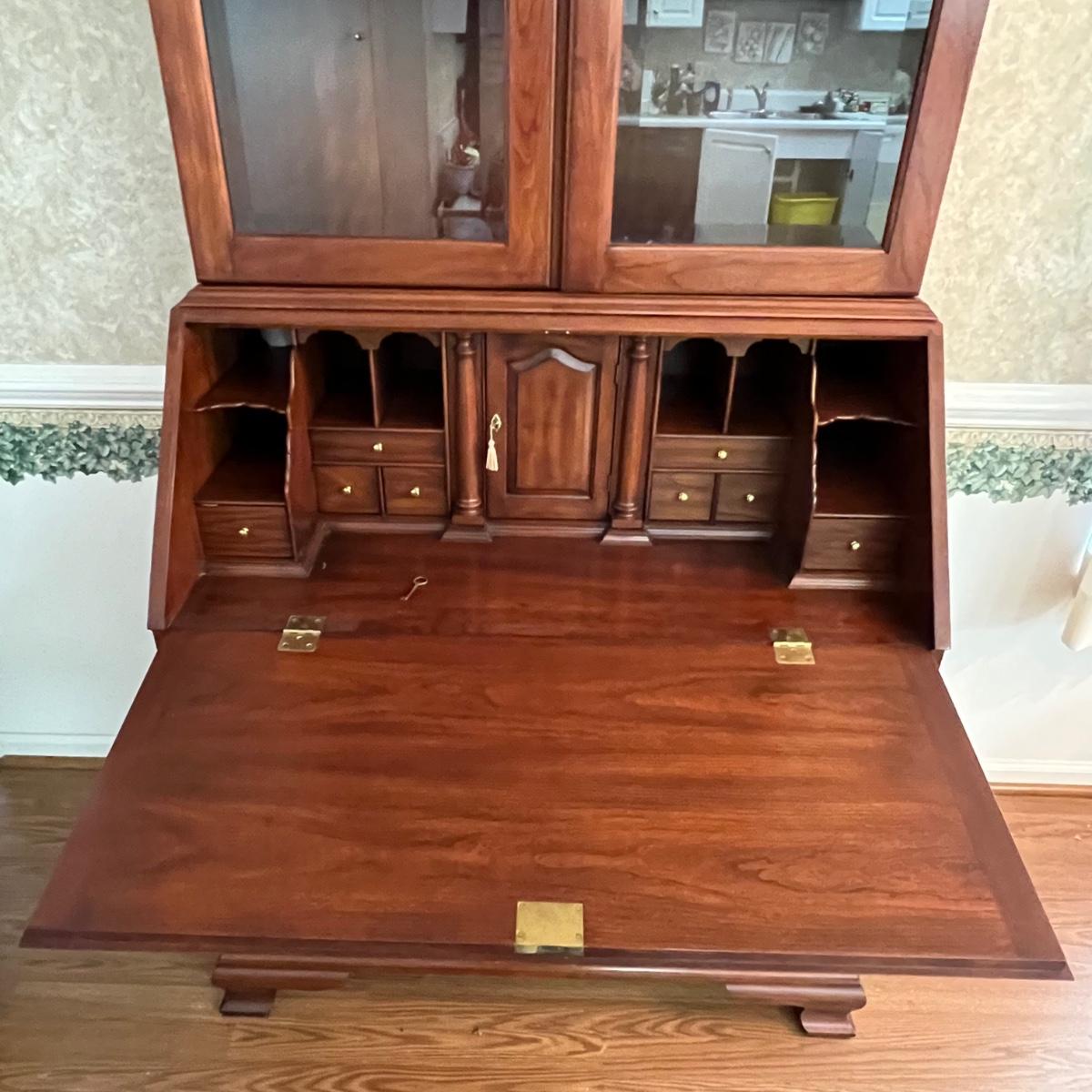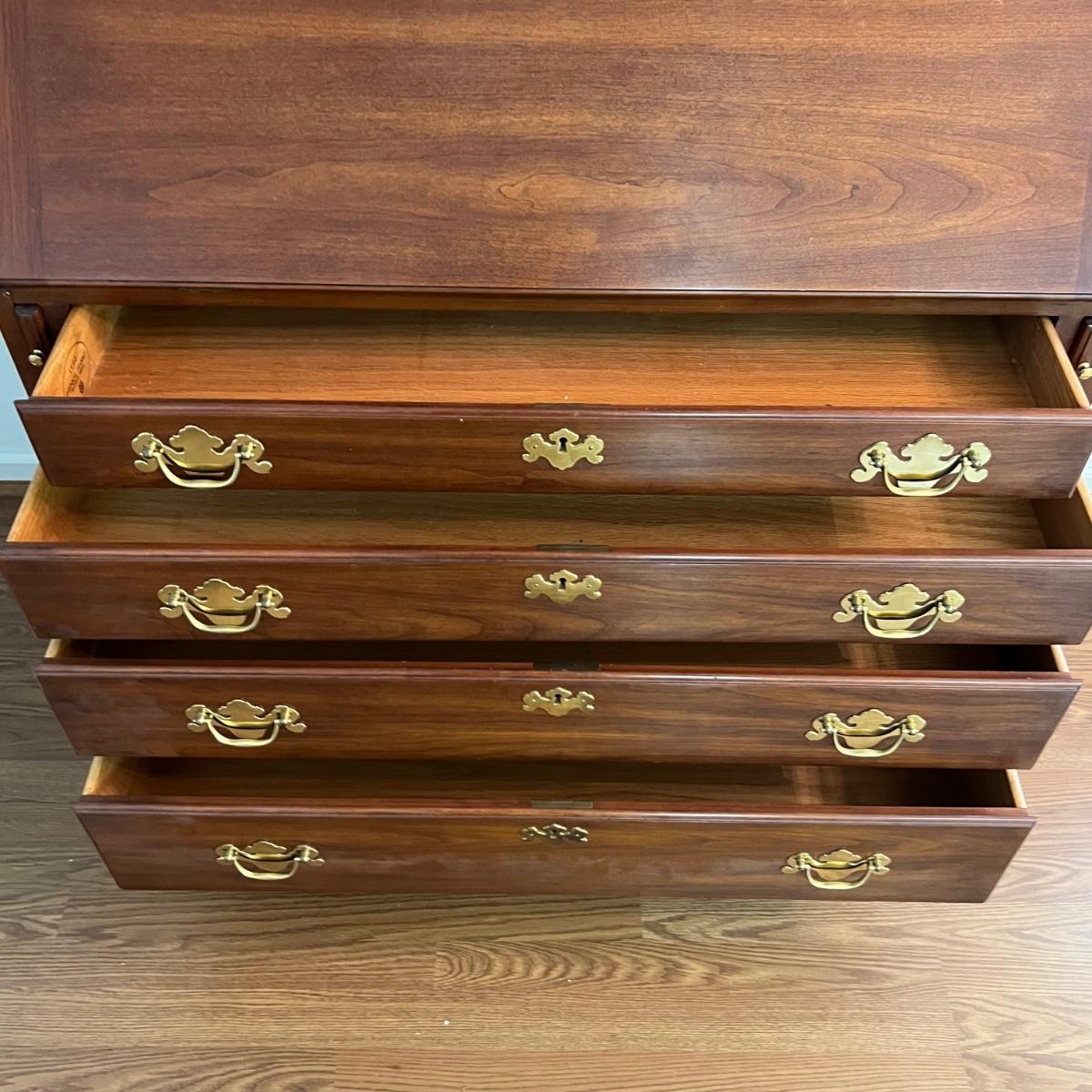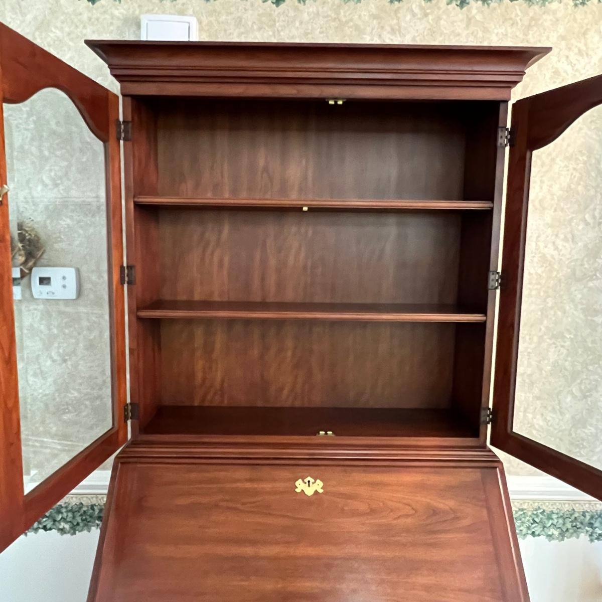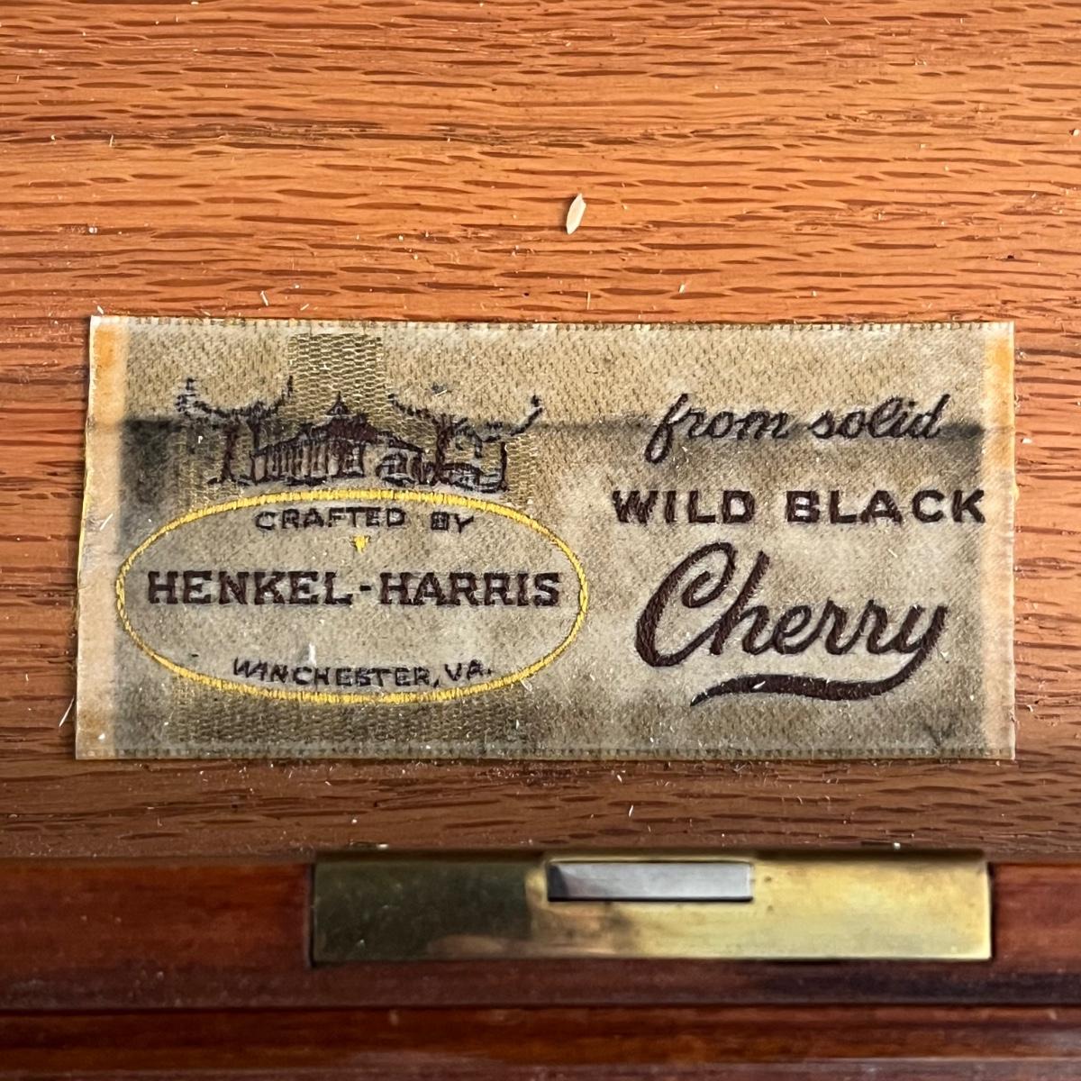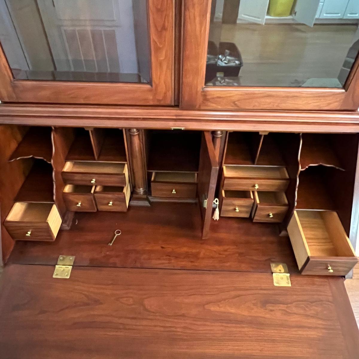 This Henkel-Harris two piece Secretary desk is solid wild black cherry wood and is in excellent condition and includes key. All hardware appears to be brass and drawers are dovetailed. Phillips head screwdriver will be needed to dismantle by winning bidder.