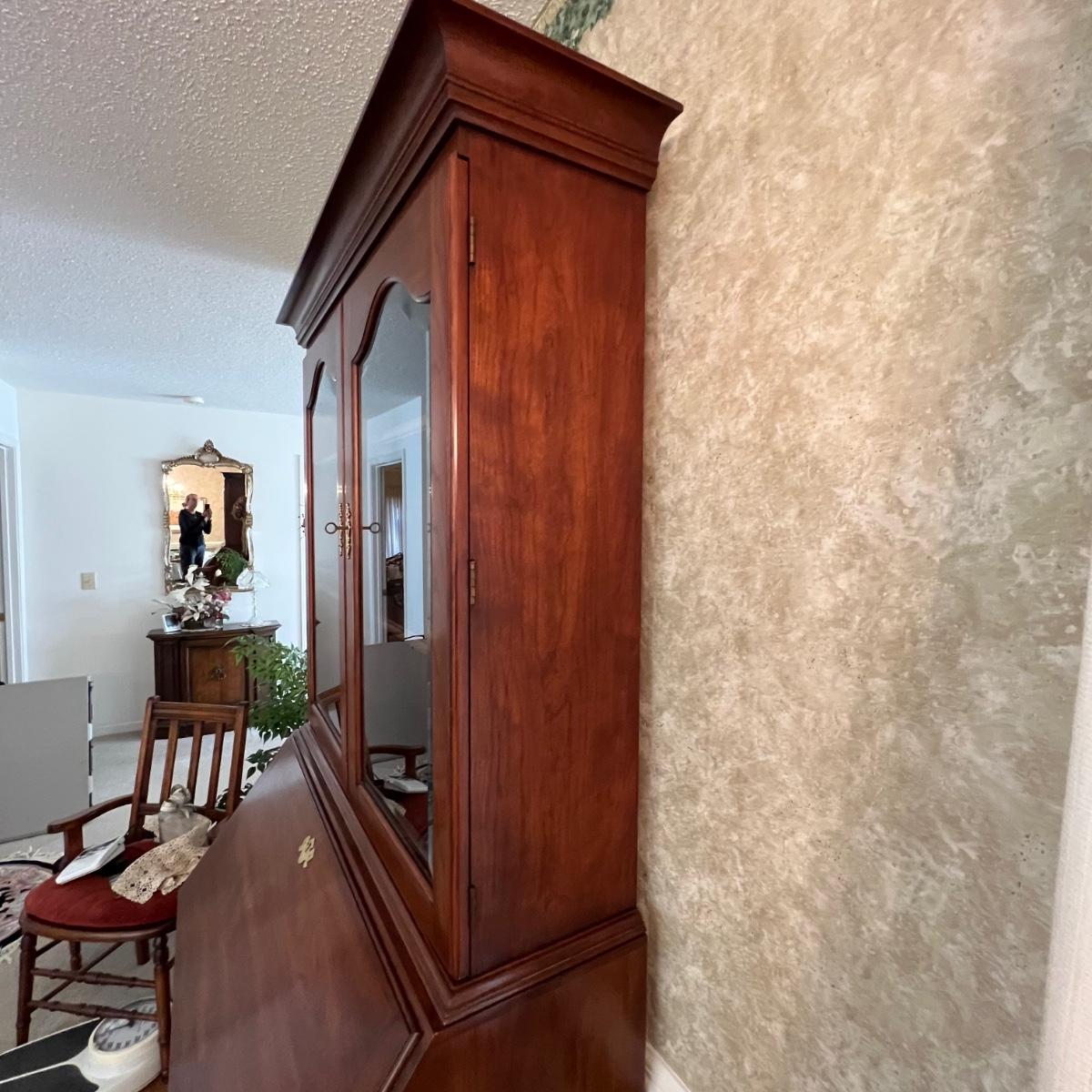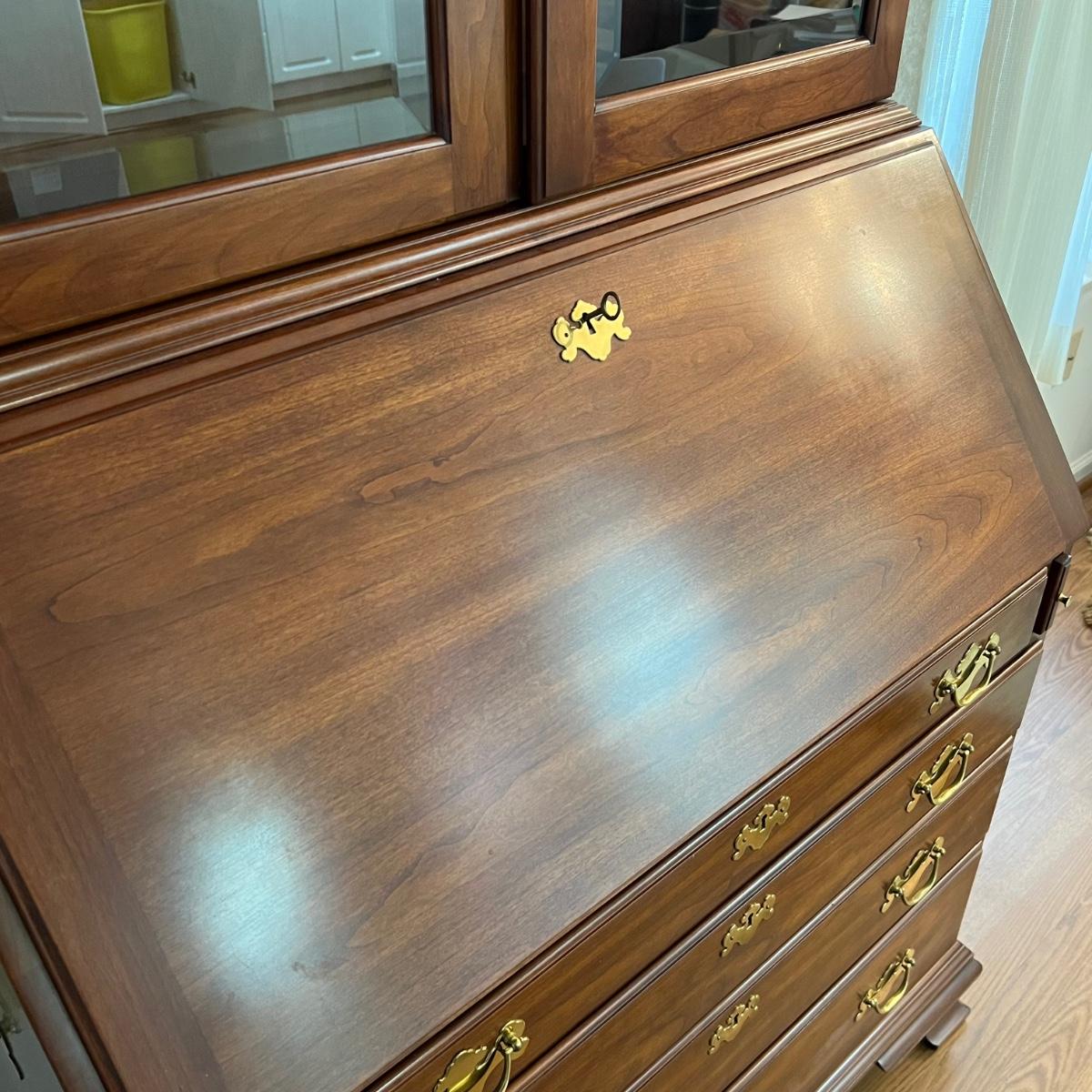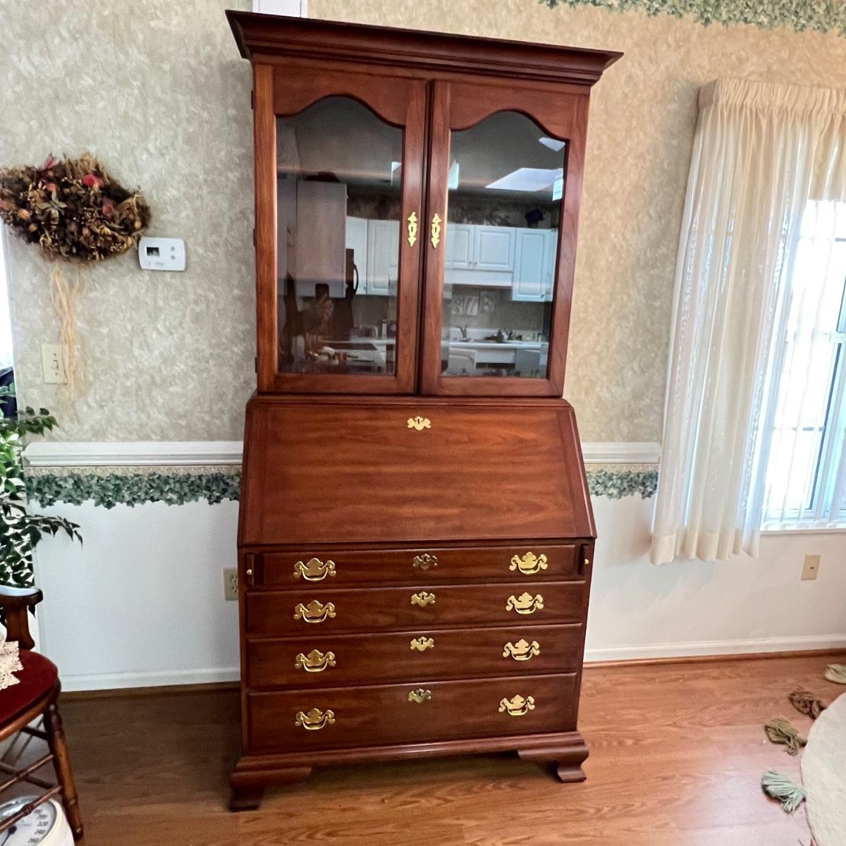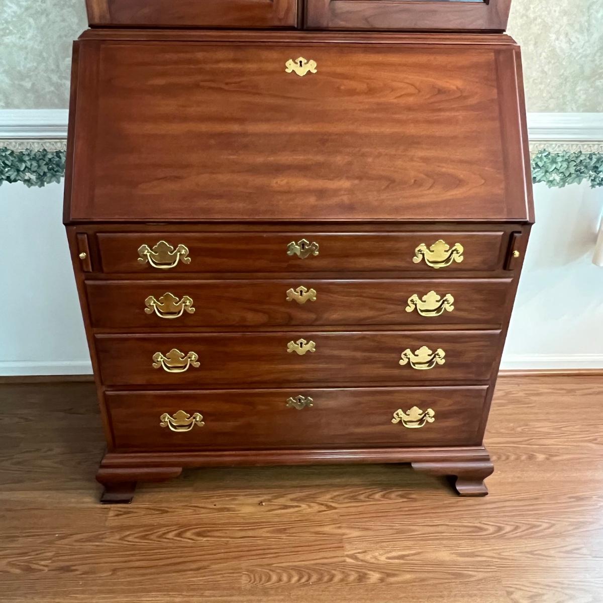 This Henkel-Harris two piece Secretary desk is solid wild black cherry wood and is in excellent condition and includes key. All hardware appears to be brass and drawers are dovetailed. Phillips head screwdriver will be needed to dismantle by winning bidder.