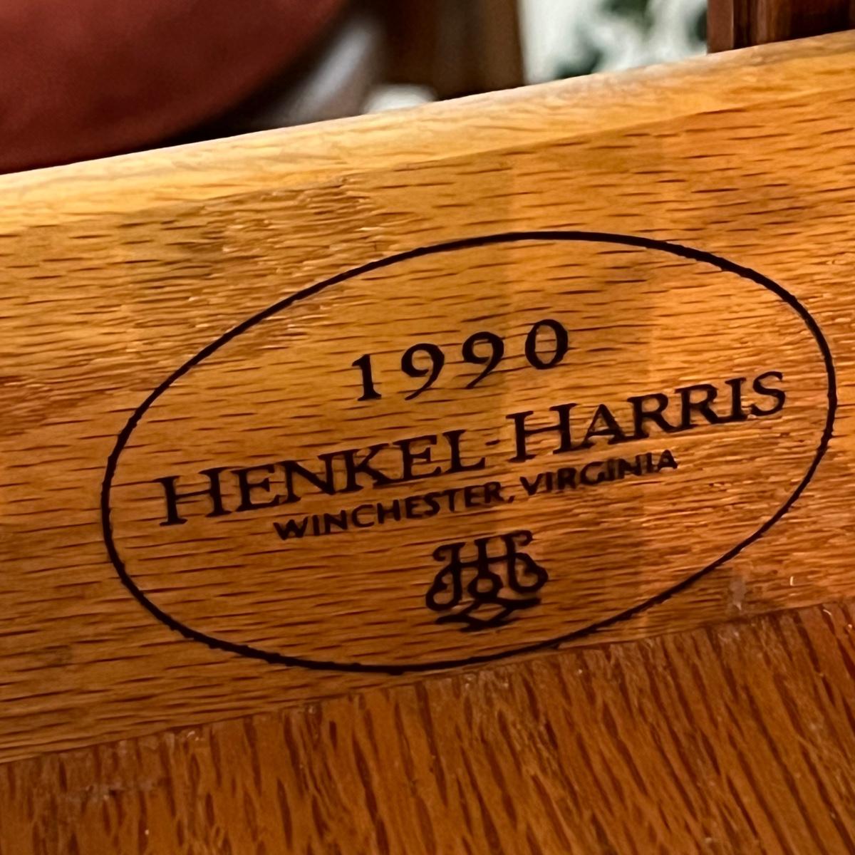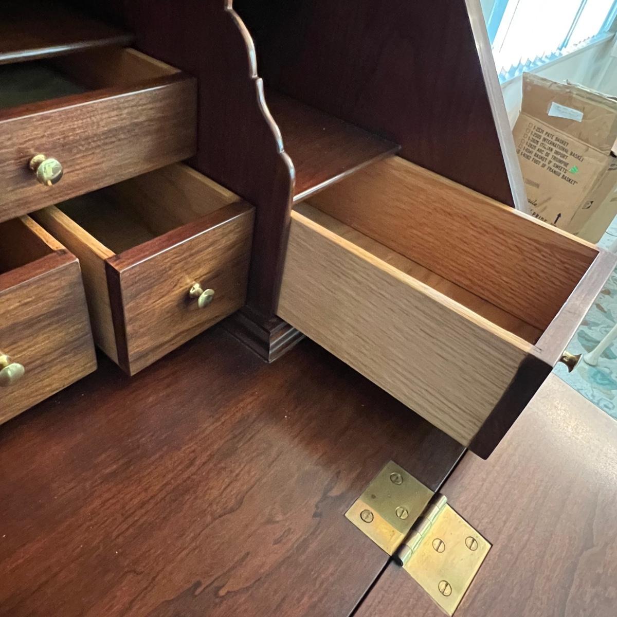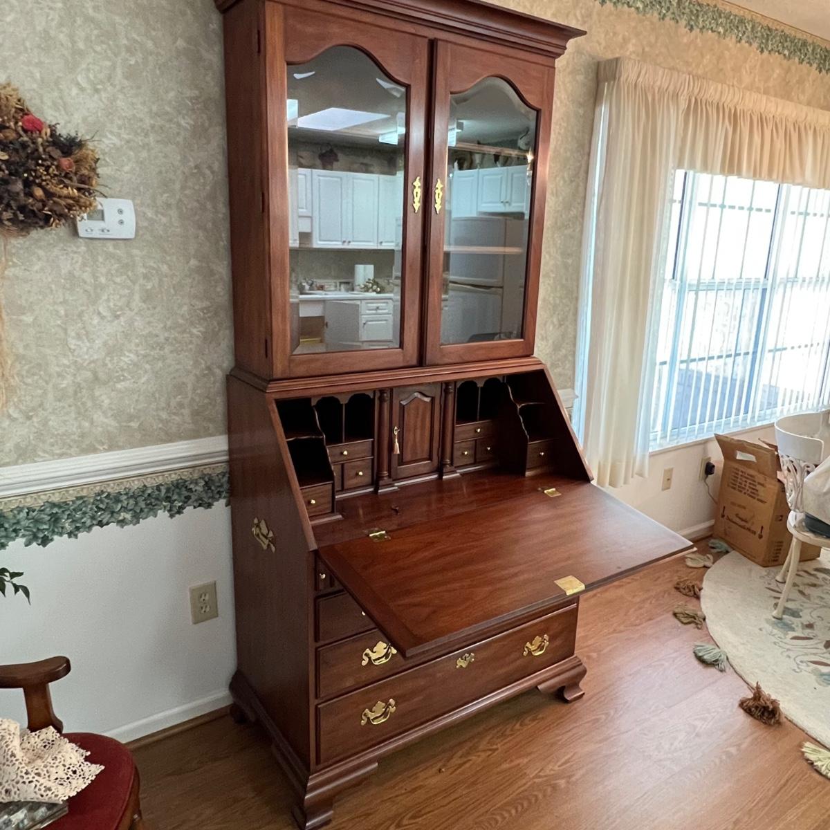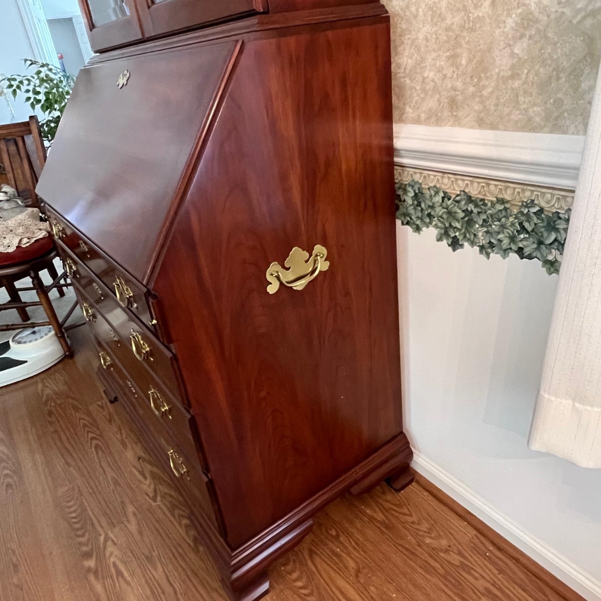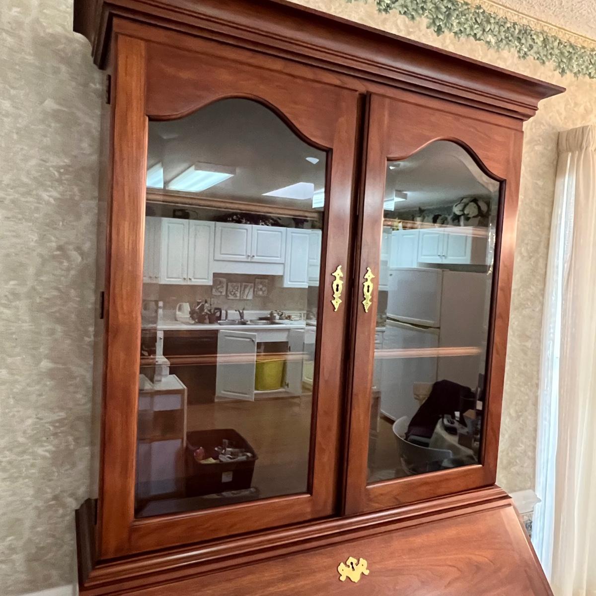 This Henkel-Harris two piece Secretary desk is solid wild black cherry wood and is in excellent condition and includes key. All hardware appears to be brass and drawers are dovetailed. Phillips head screwdriver will be needed to dismantle by winning bidder.