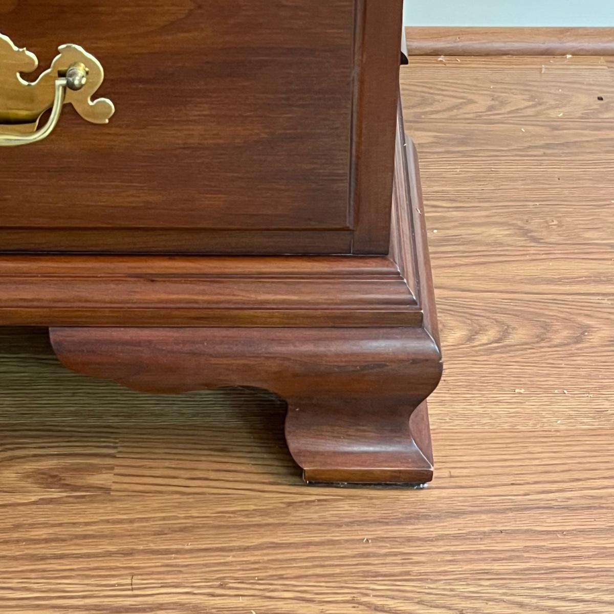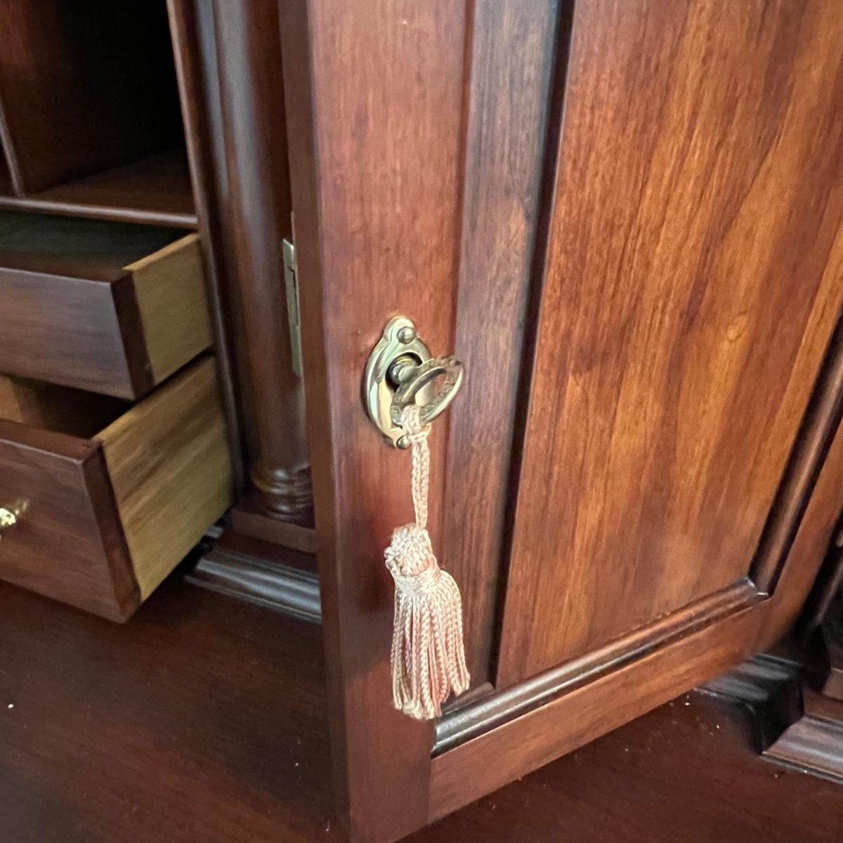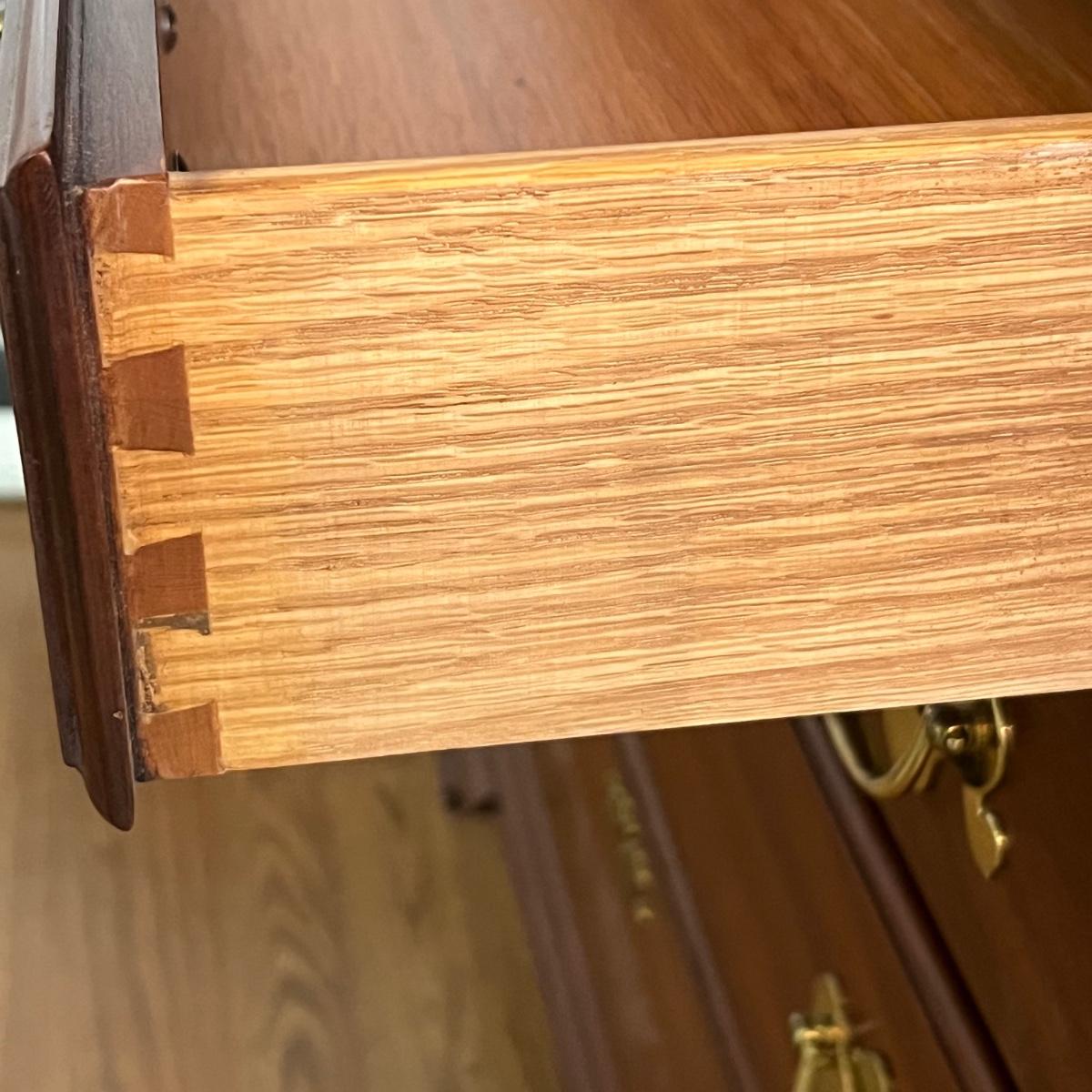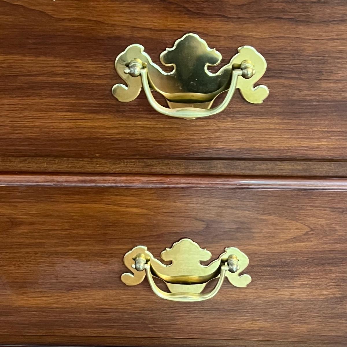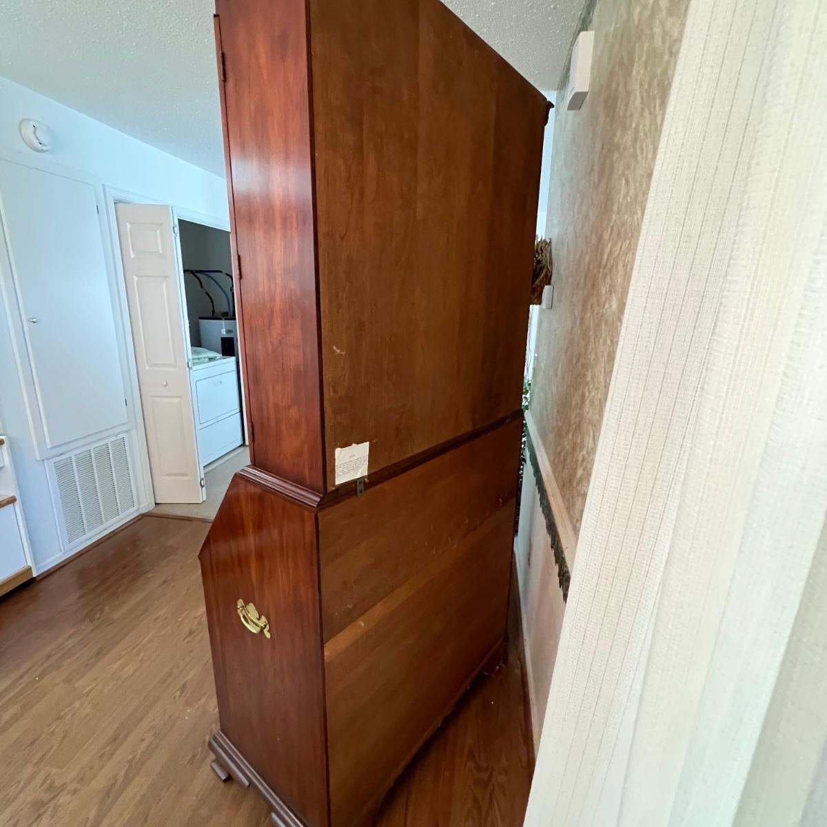 This Henkel-Harris two piece Secretary desk is solid wild black cherry wood and is in excellent condition and includes key. All hardware appears to be brass and drawers are dovetailed. Phillips head screwdriver will be needed to dismantle by winning bidder.