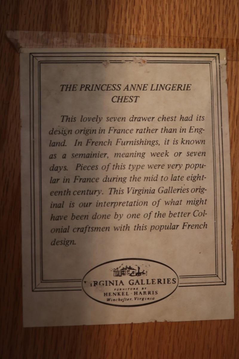 Crafted by Virginia Galleries Furniture by Henkel-Harris Genuine mahogany. Lingerie Chest. Excellent condition.