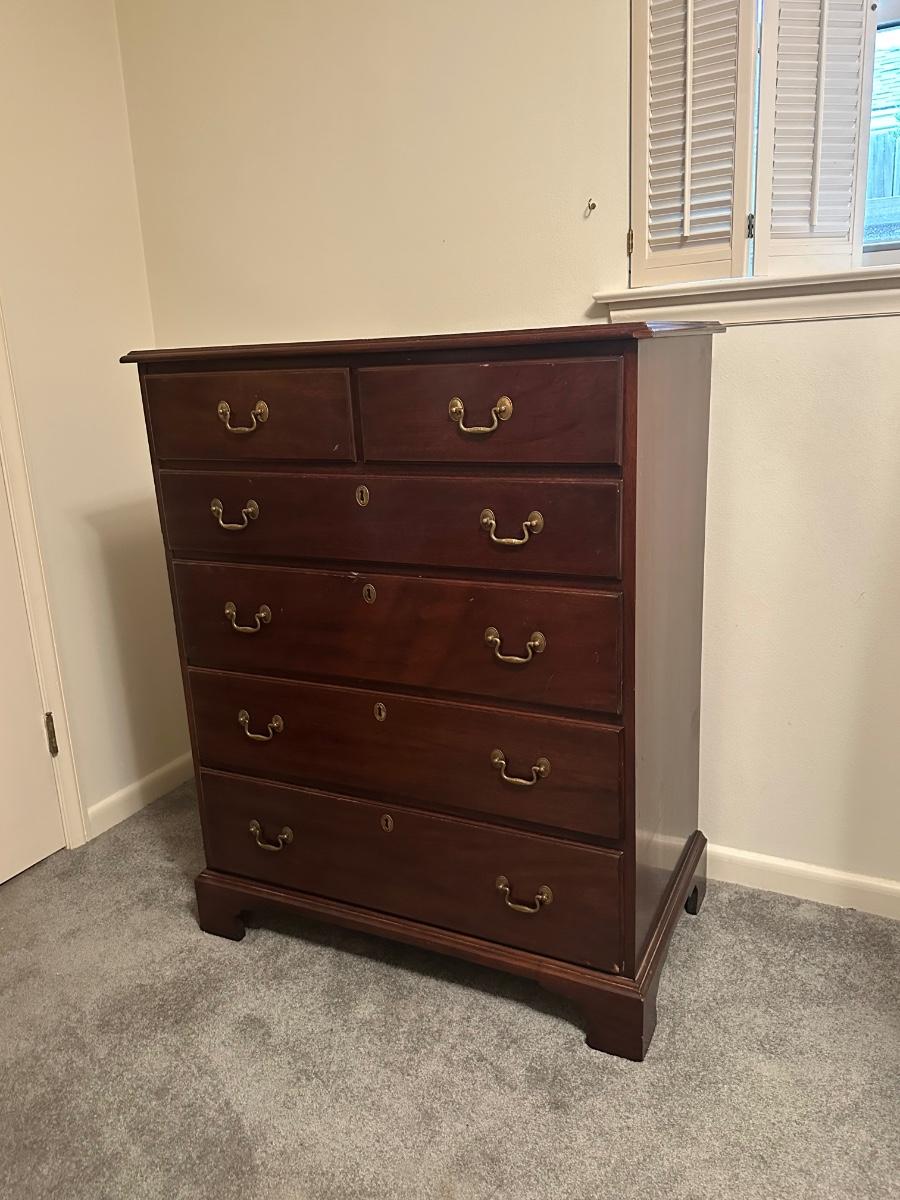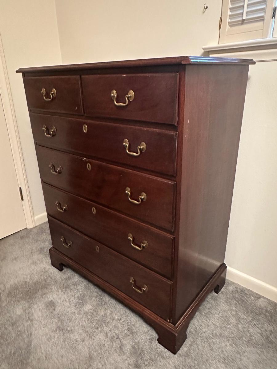 Henkel-Harris “Virginia Galleries” mahogany chest of drawers. Two short over four long drawers with dovetail construction and brass bail pulls.