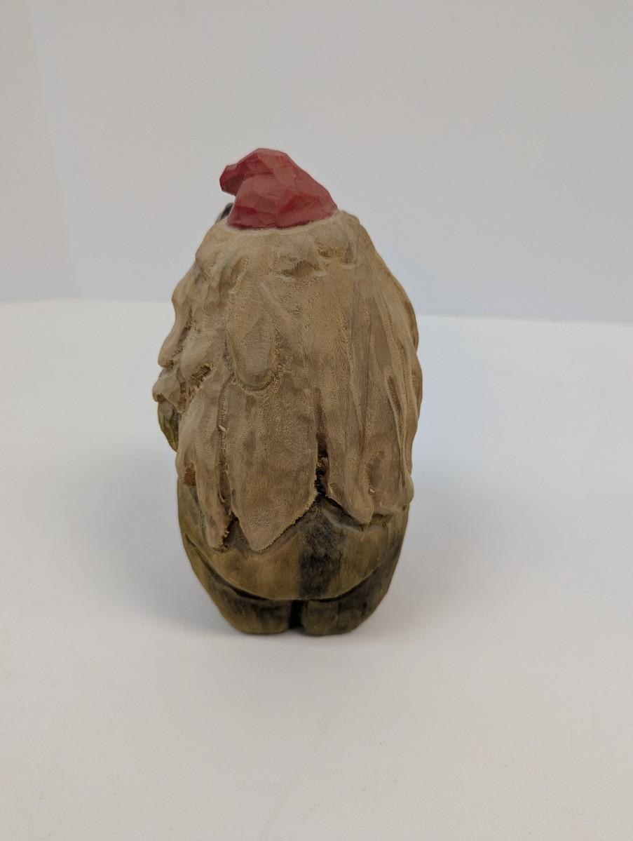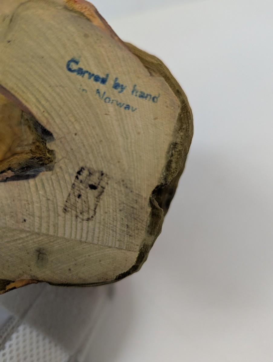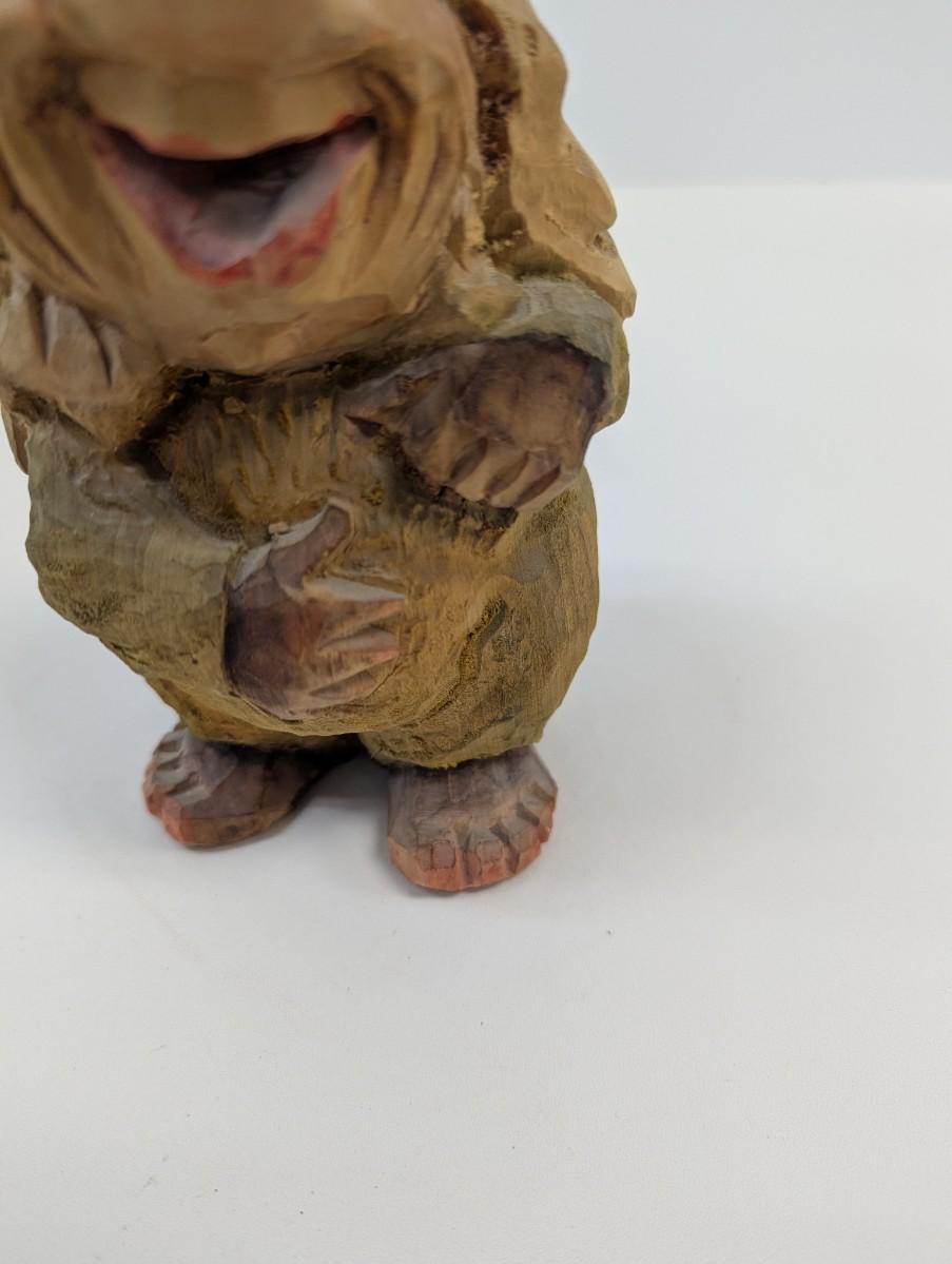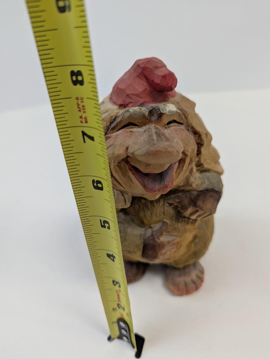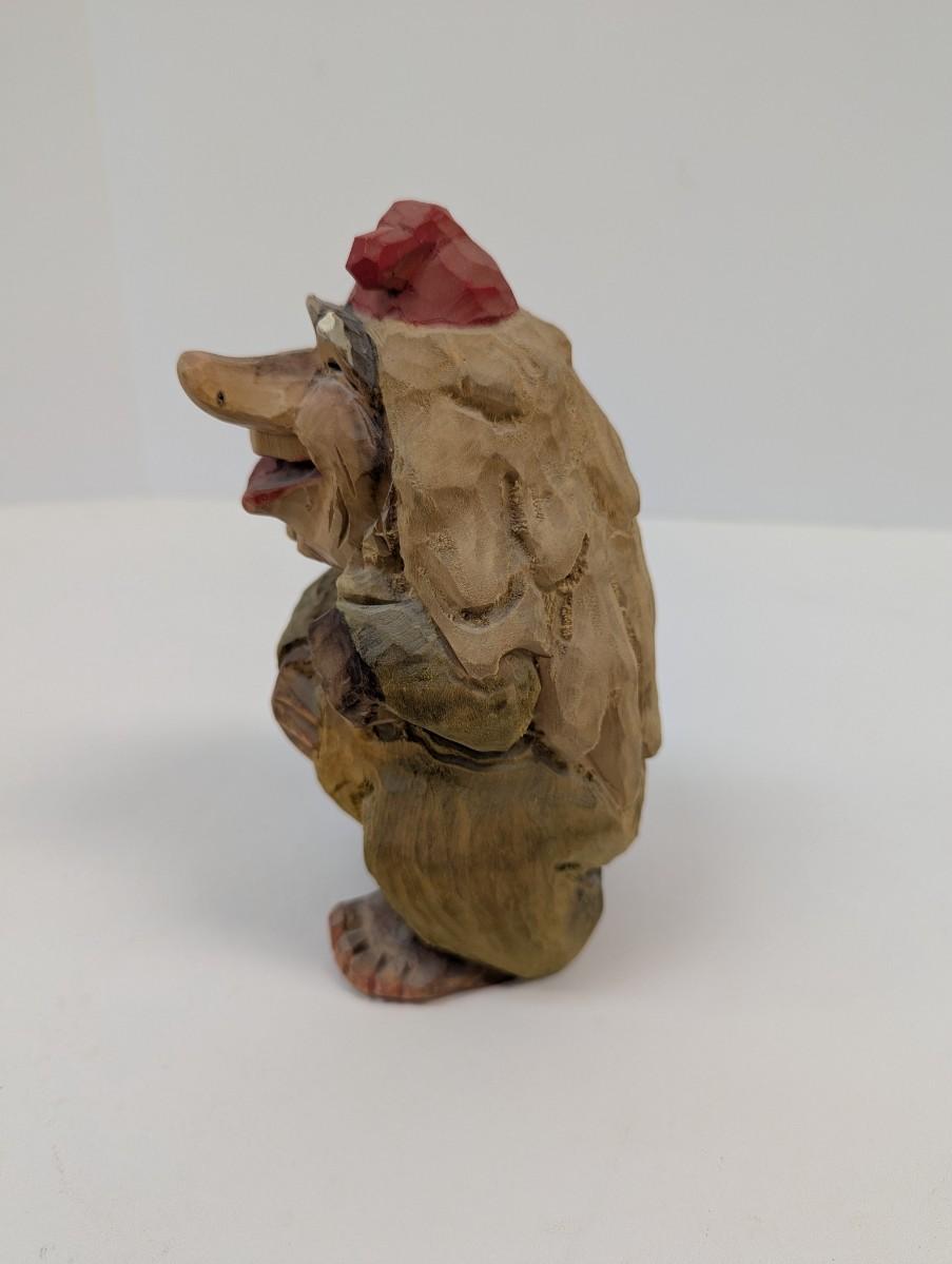 This hand carved wood troll is a unique and whimsical collectible item, crafted by Henning. The craftsmanship of this pieces is evident, with intricate details and rustic, yet expert carving techniques .
