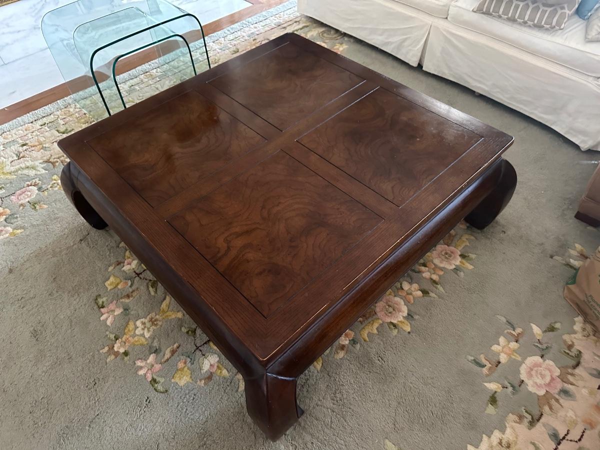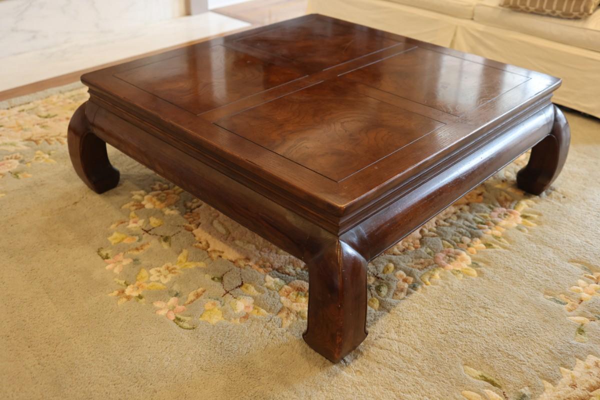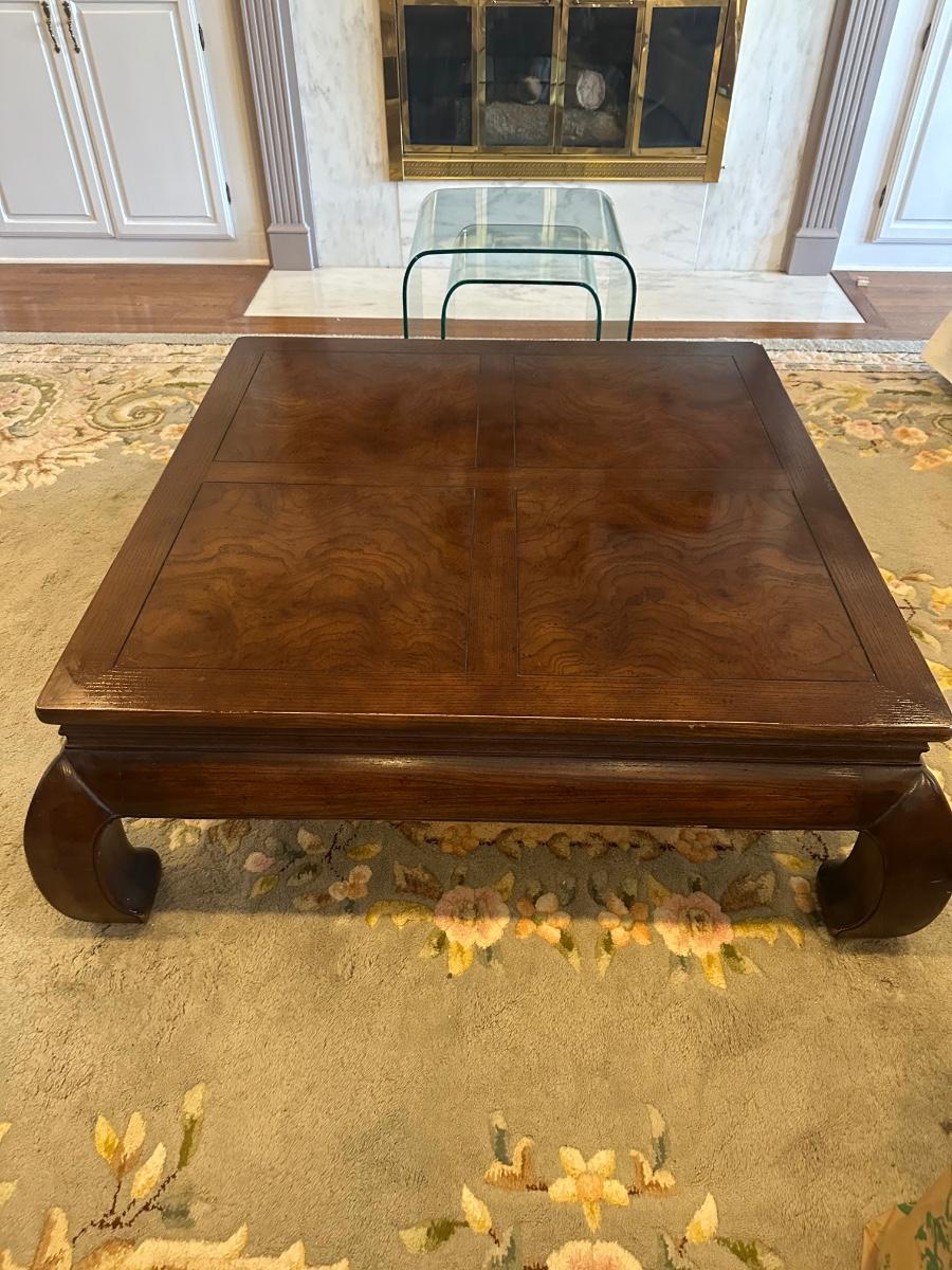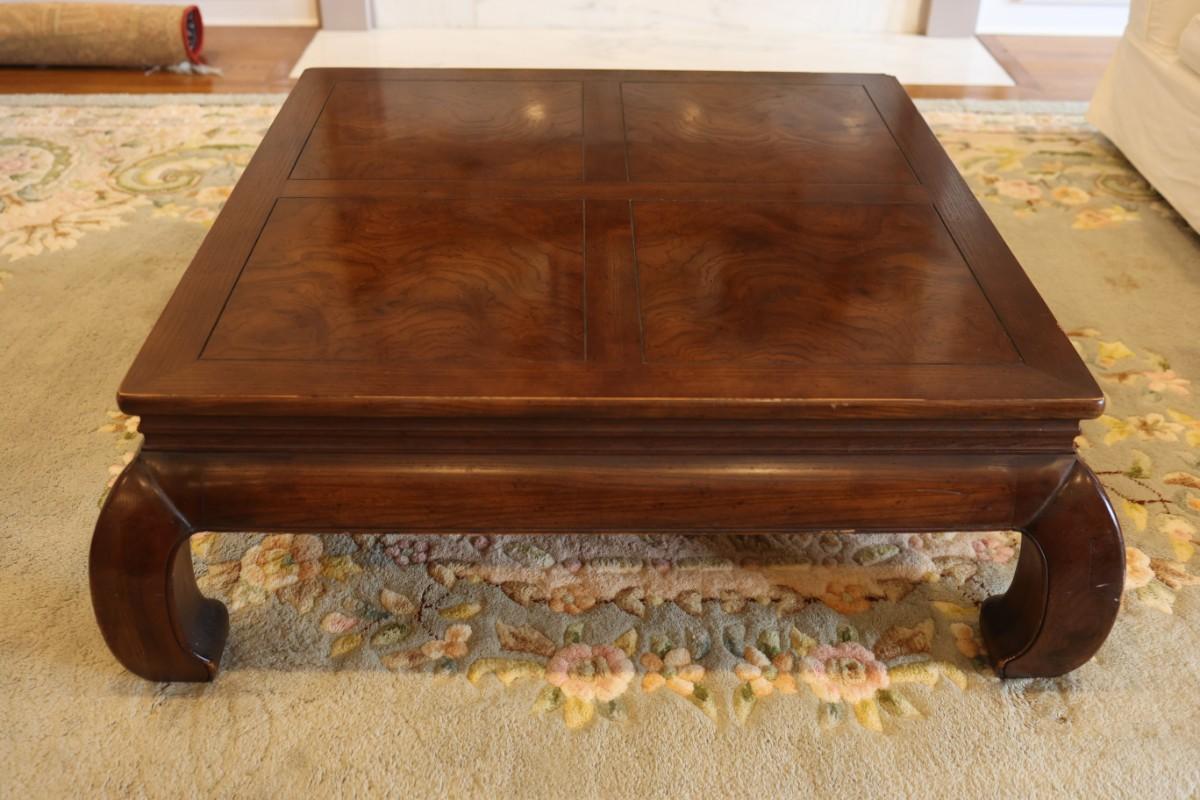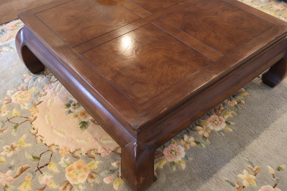 Henredon Chinoiserie Ming Style Oak and Burl Coffee Table. The table is an oak and burl construction. 1980s.