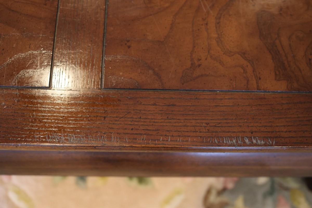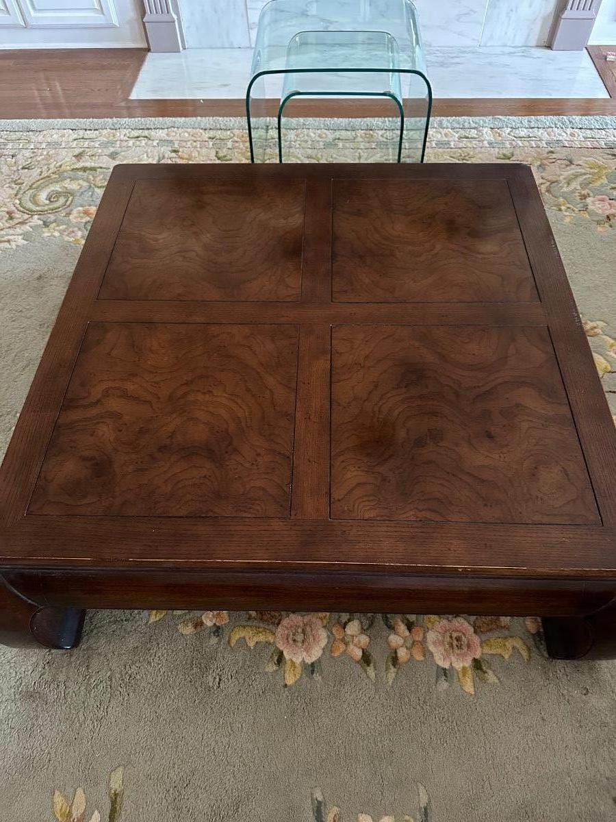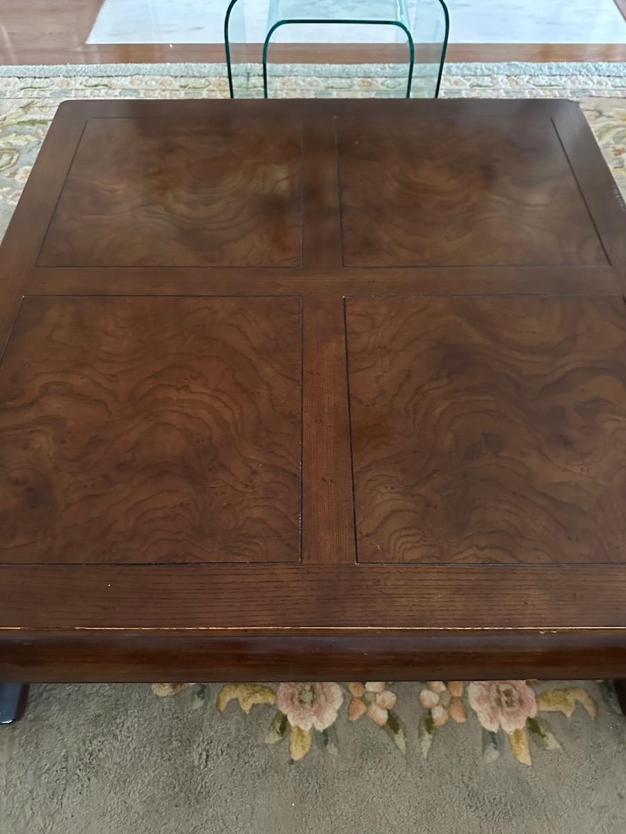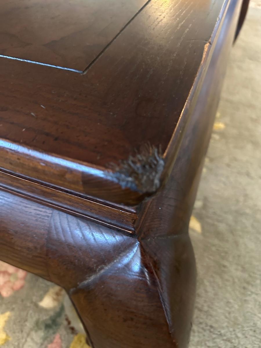 See everyday wear on the table through pictures. Otherwise very sturdy and great coffee table!