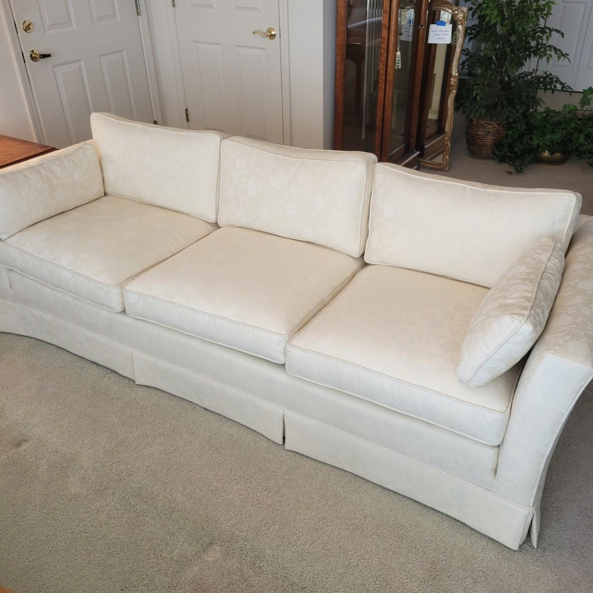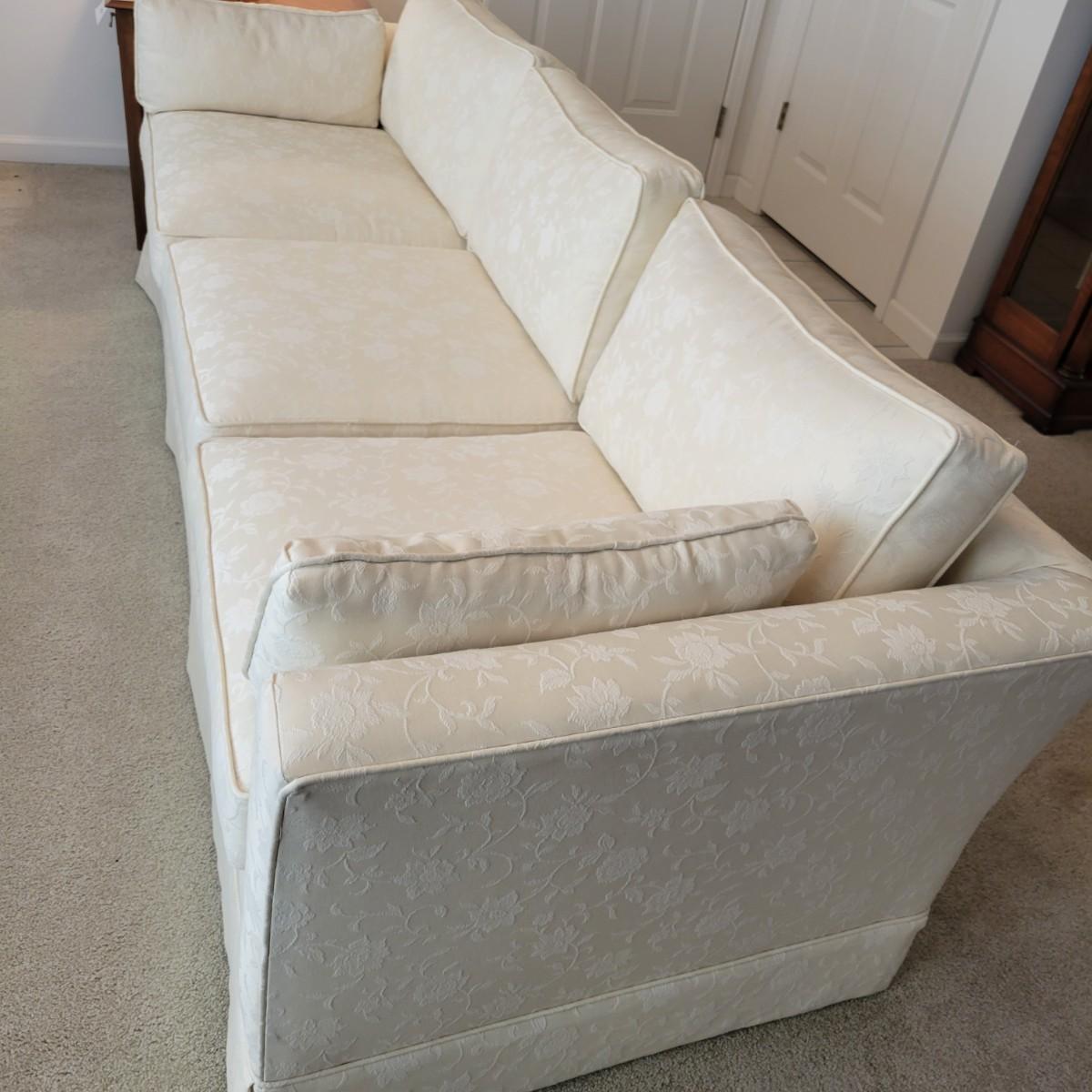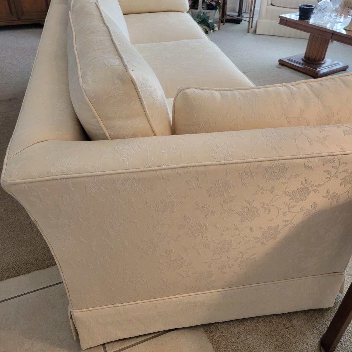 A cream colored couch with white floral accents manufactured by Henredon. This couch comes from a smoke and pet free home and includes two matching accent pillows. One back cushion does have a small minor stain and the cushion is reversible so this mark can be hidden. Measures approximately 88.5" x 33.5" x 25.5"H. Local pickup only. Winning bidder must bring assistance to help move and load this item due to its weight and/or size.