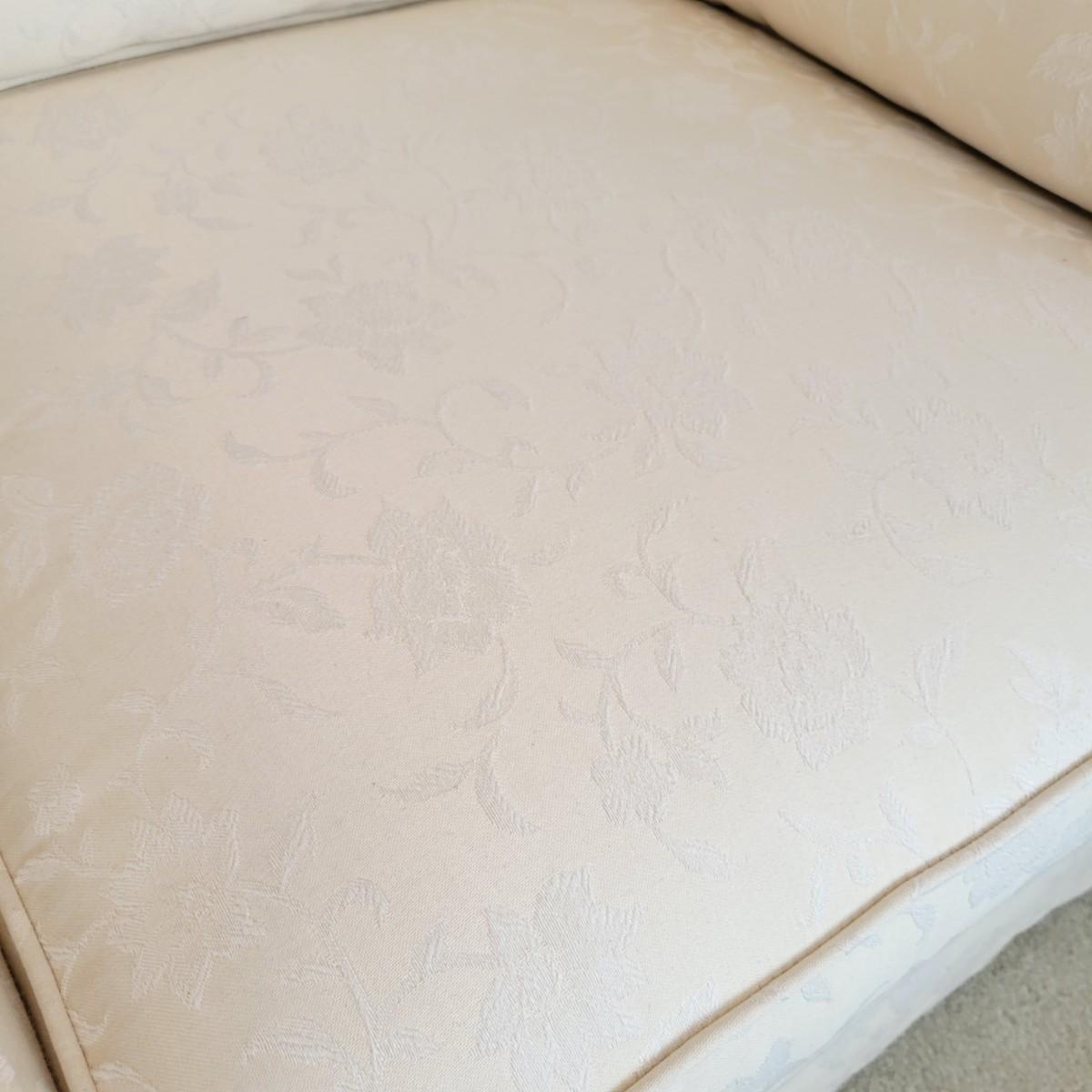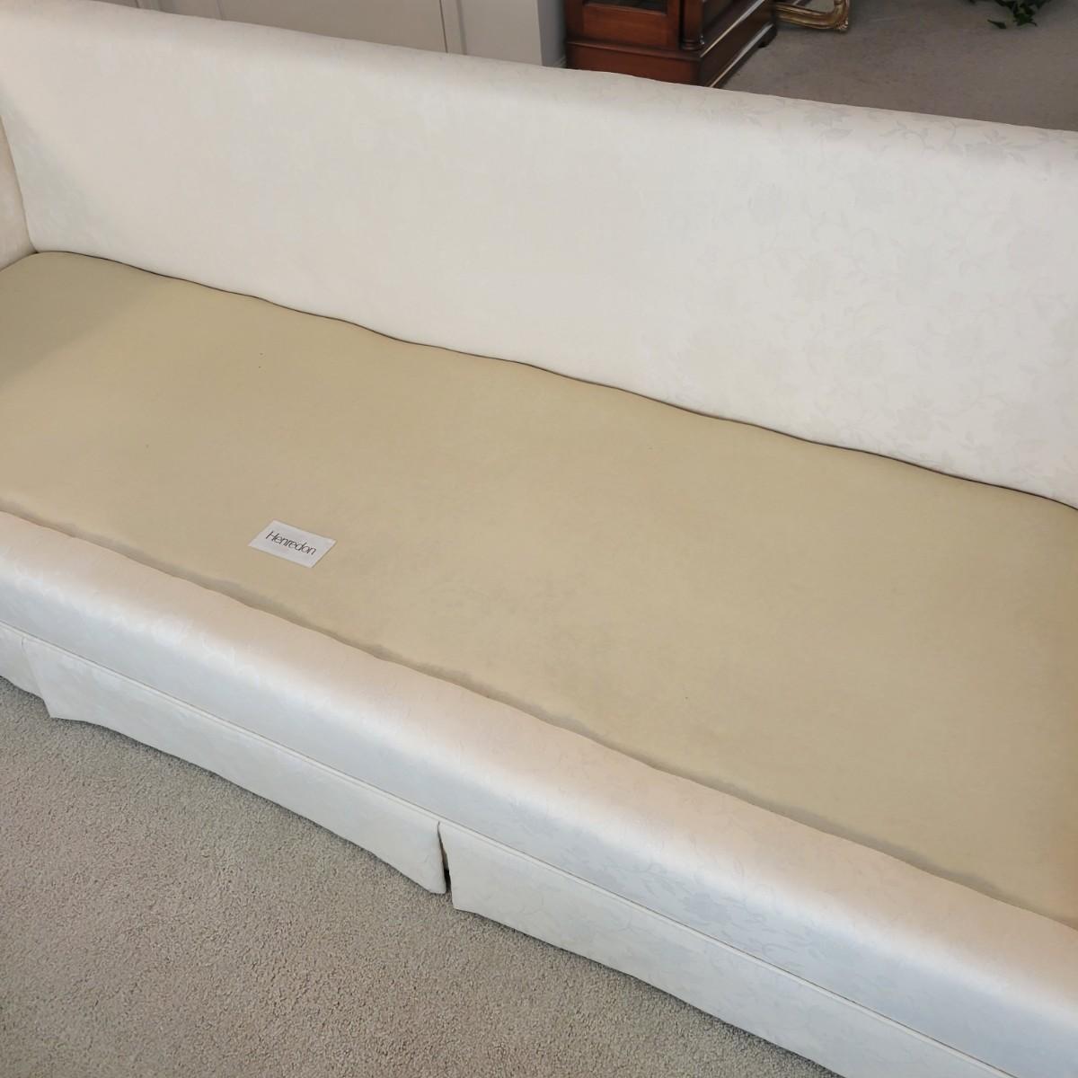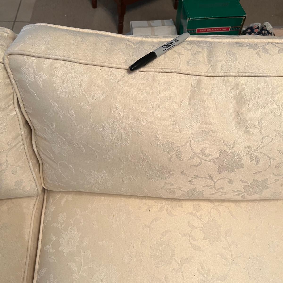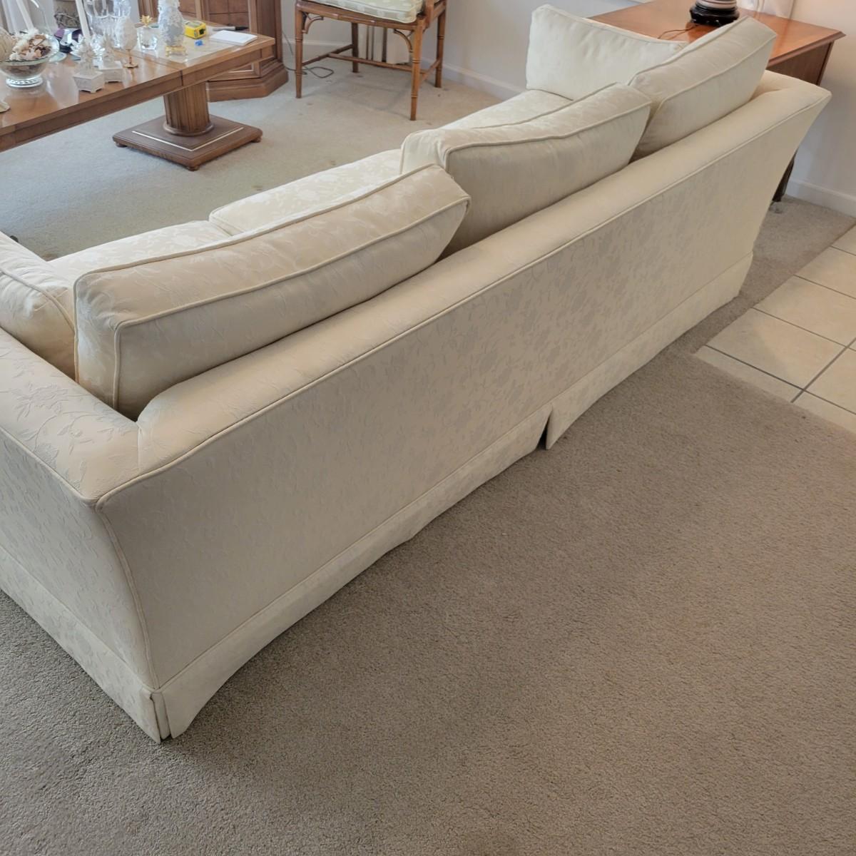 A cream colored couch with white floral accents manufactured by Henredon. This couch comes from a smoke and pet free home and includes two matching accent pillows. One back cushion does have a small minor stain and the cushion is reversible so this mark can be hidden. Measures approximately 88.5" x 33.5" x 25.5"H. Local pickup only. Winning bidder must bring assistance to help move and load this item due to its weight and/or size.