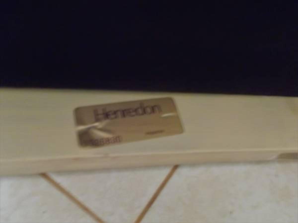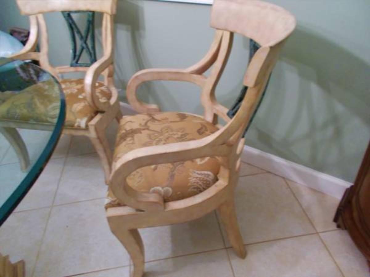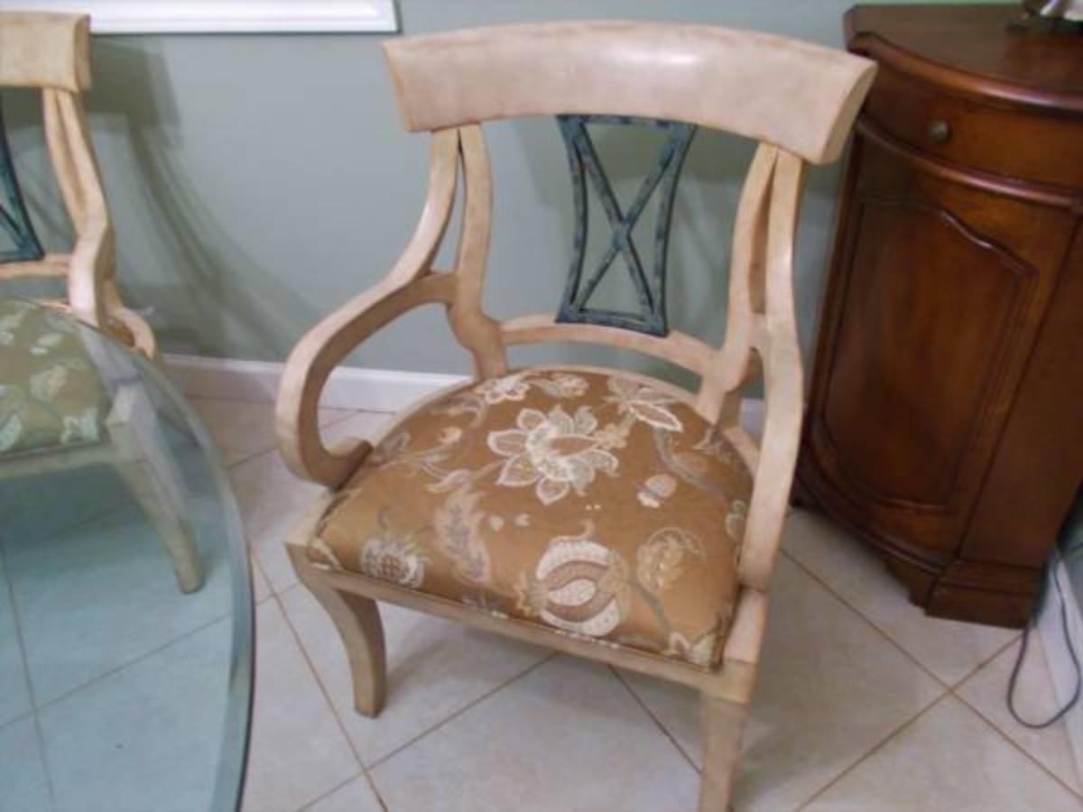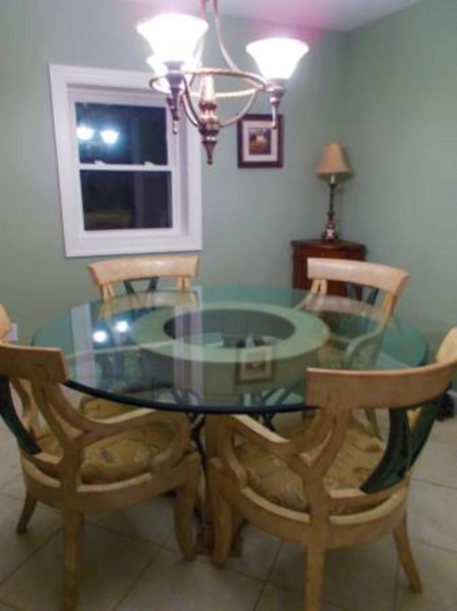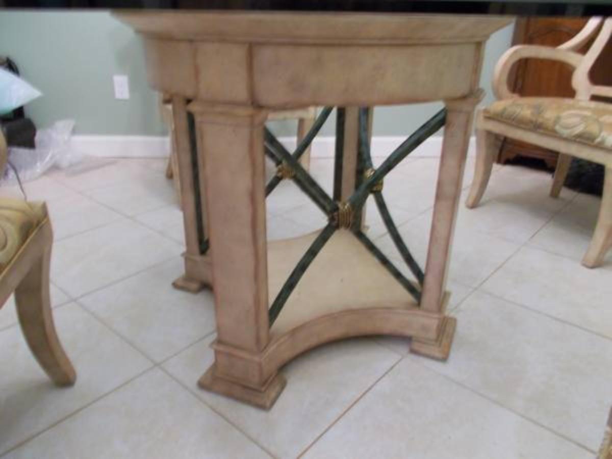 This dining table and four chairs is a very high end piece made by Henredon. The glass top is very thick with an ogee edge. It has a few nicks on the edge and underside of the glass from moving and is very heavy and will need at least two people to move the glass.Any spots on the glass or what looks like a picture on the base of the table is just a reflection from the glass of the surroundings.