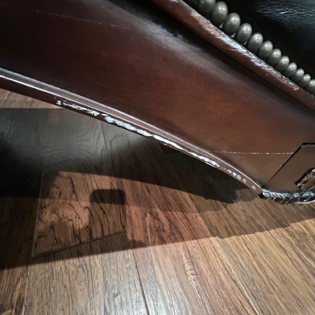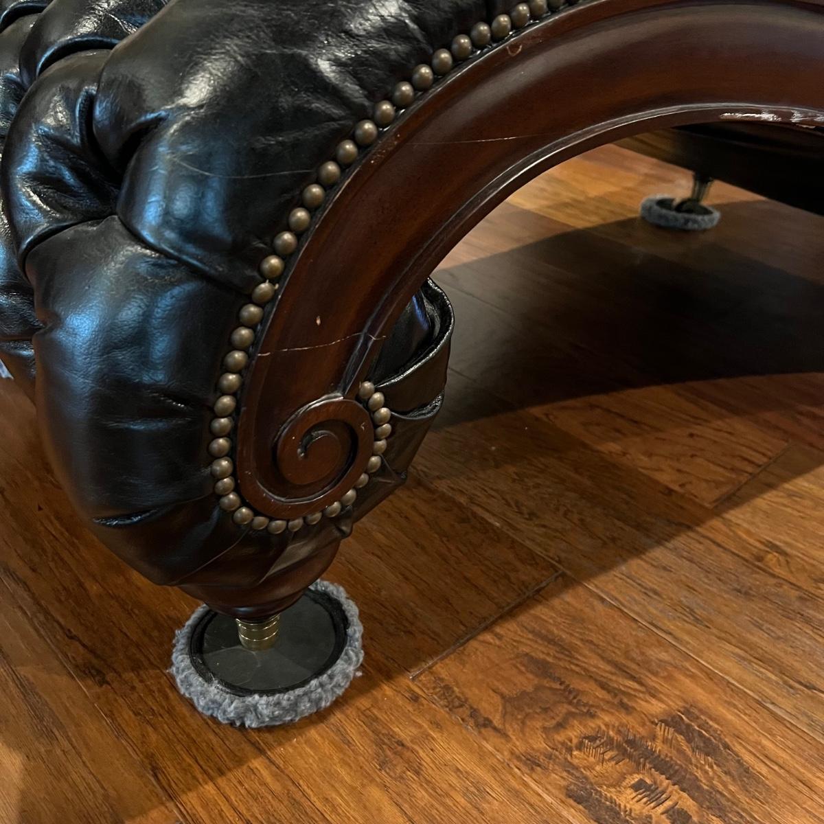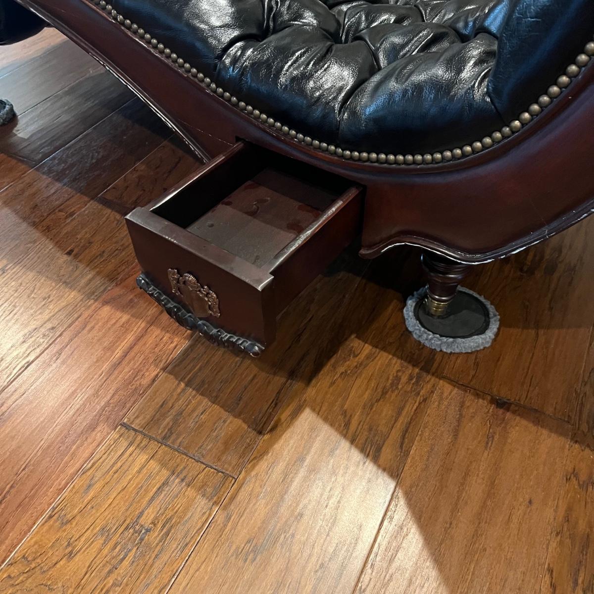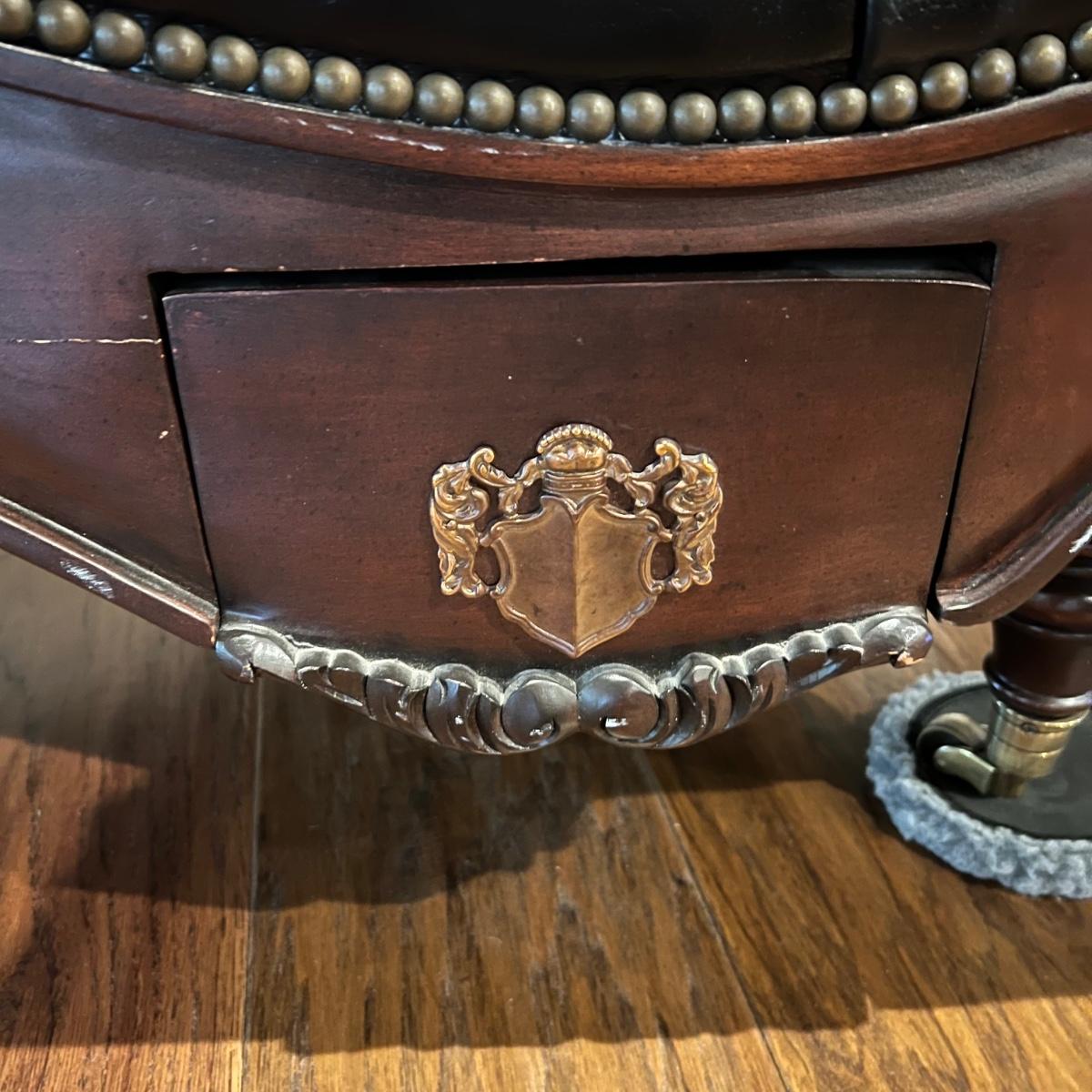 Black tufted leather seat is curved, going from 15” to 20” in seat height. There is one small drawer on the side. Its brass feet are currently on protector pads which are included. The back has wheels that collapse to keep it stationary. There are some paint marks on the one side shown in an image which should come off.