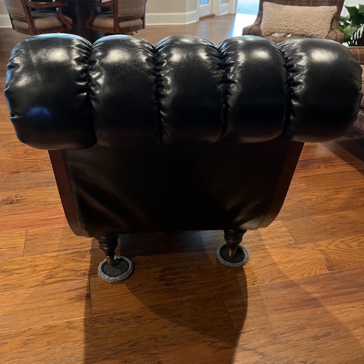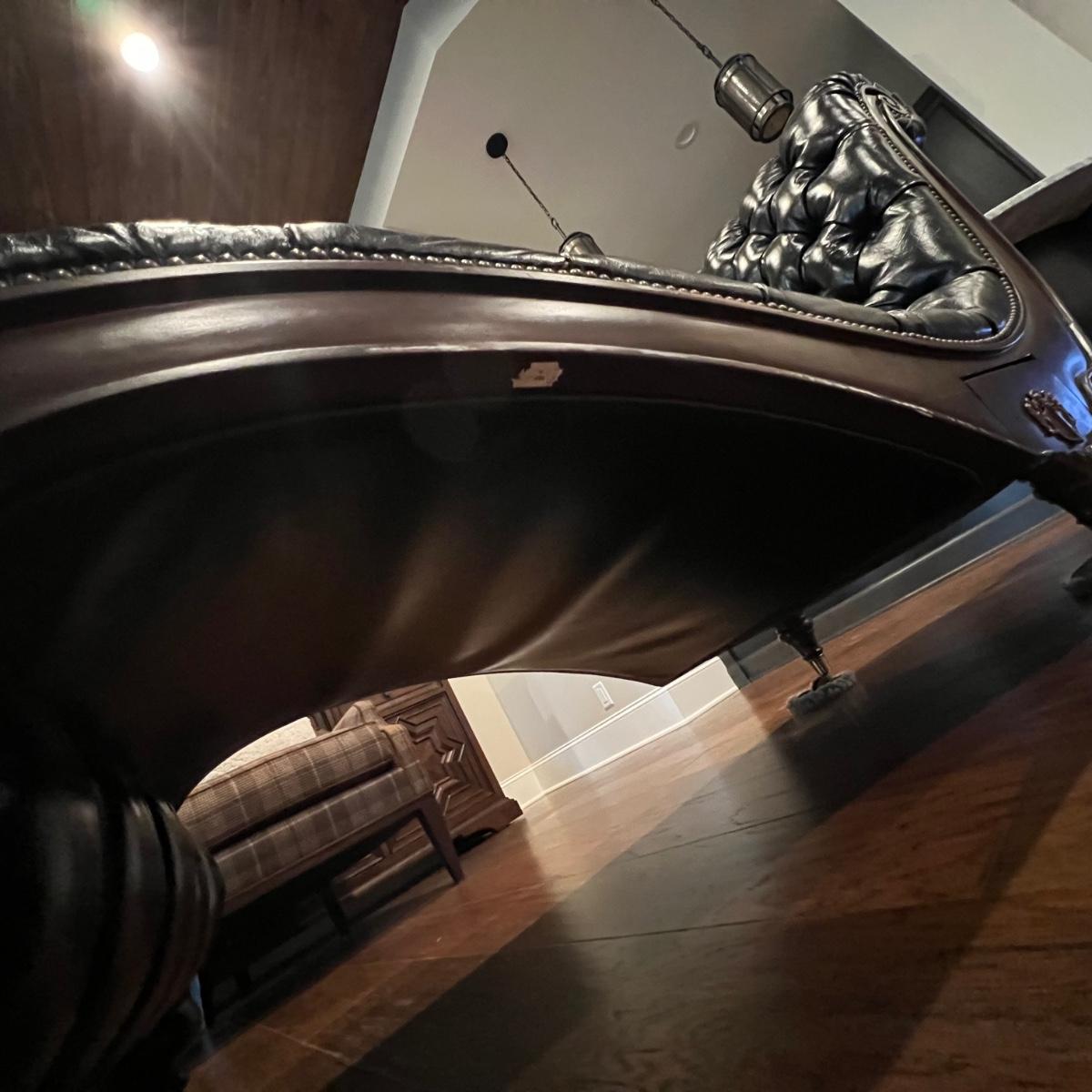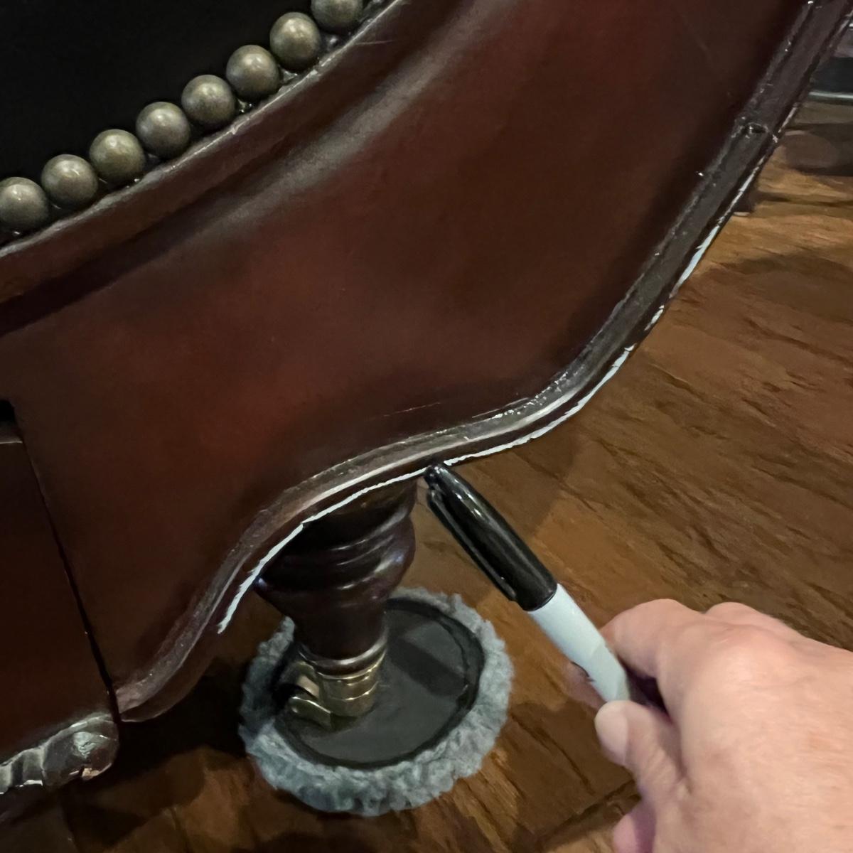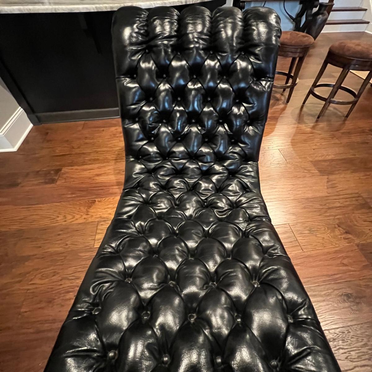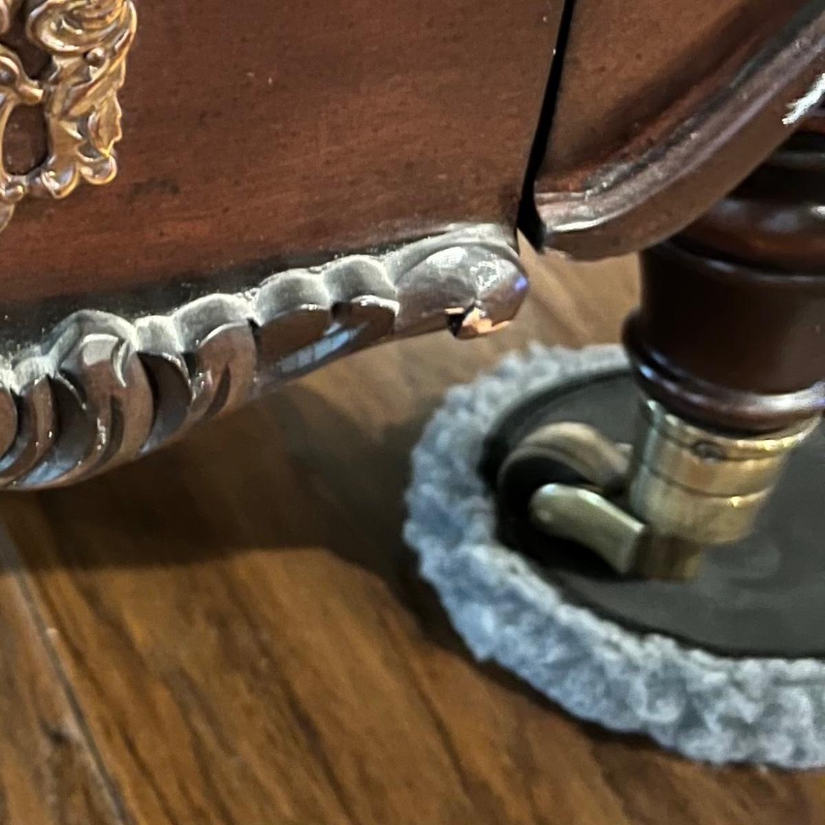 Black tufted leather seat is curved, going from 15” to 20” in seat height. There is one small drawer on the side. Its brass feet are currently on protector pads which are included. The back has wheels that collapse to keep it stationary. There are some paint marks on the one side shown in an image which should come off.