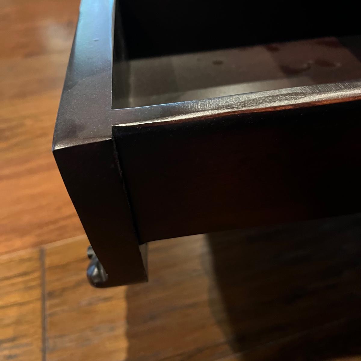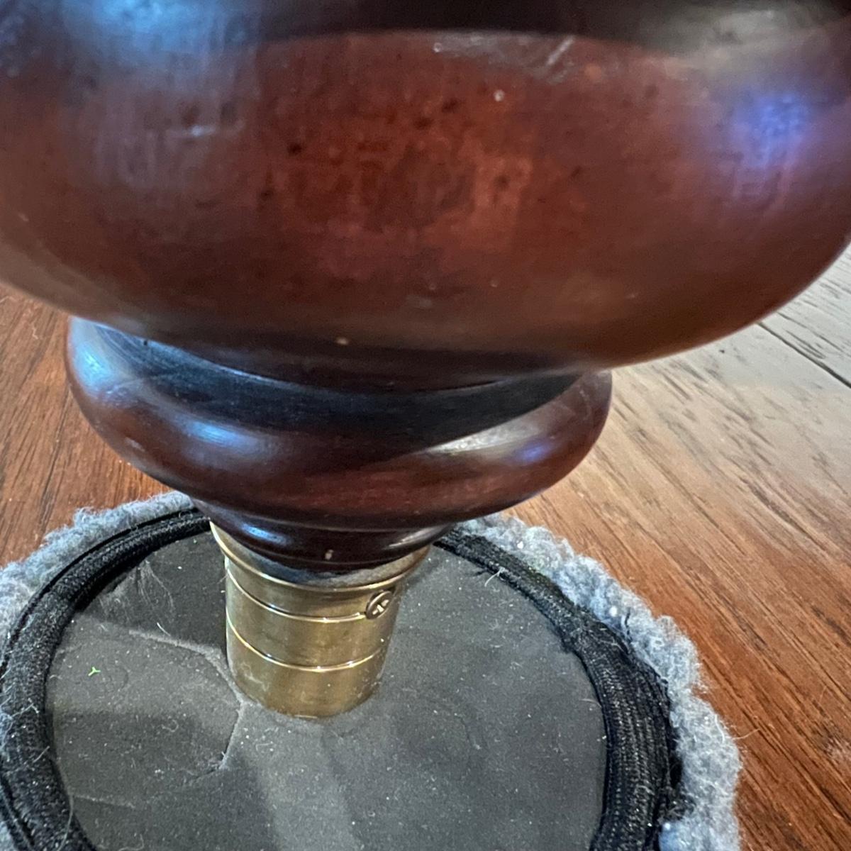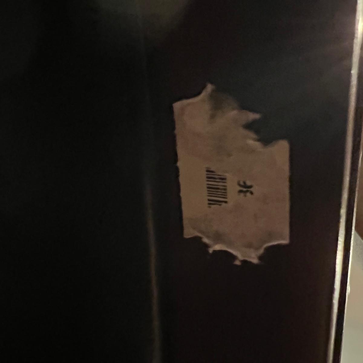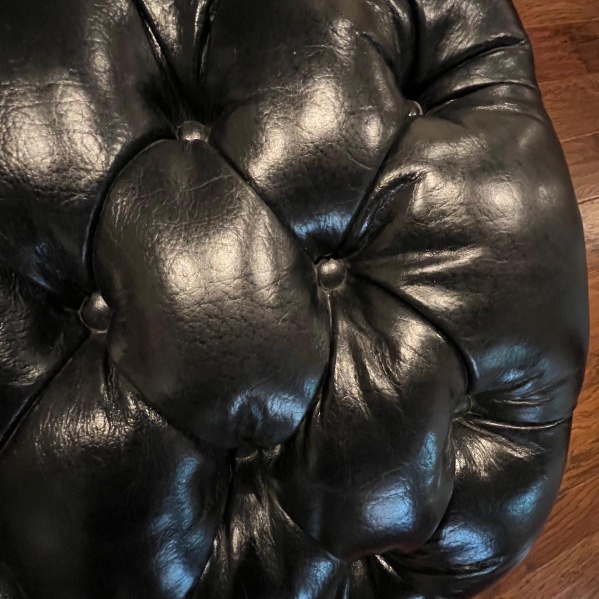 Black tufted leather seat is curved, going from 15” to 20” in seat height. There is one small drawer on the side. Its brass feet are currently on protector pads which are included. The back has wheels that collapse to keep it stationary. There are some paint marks on the one side shown in an image which should come off.