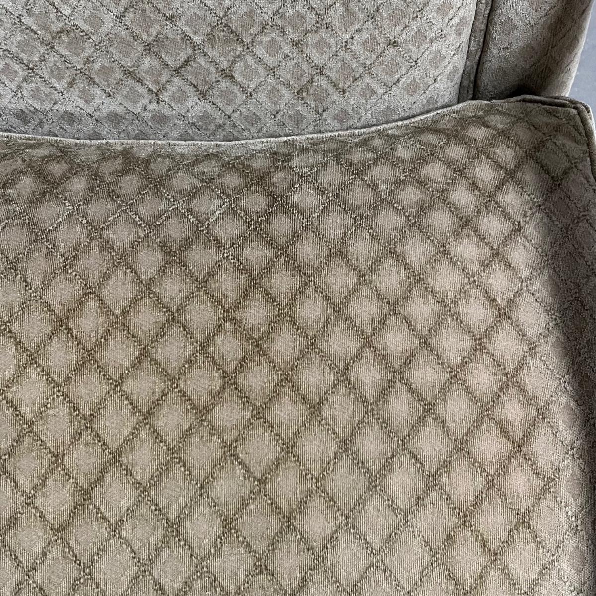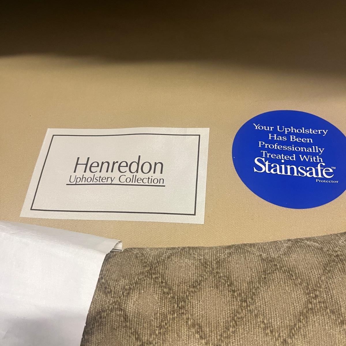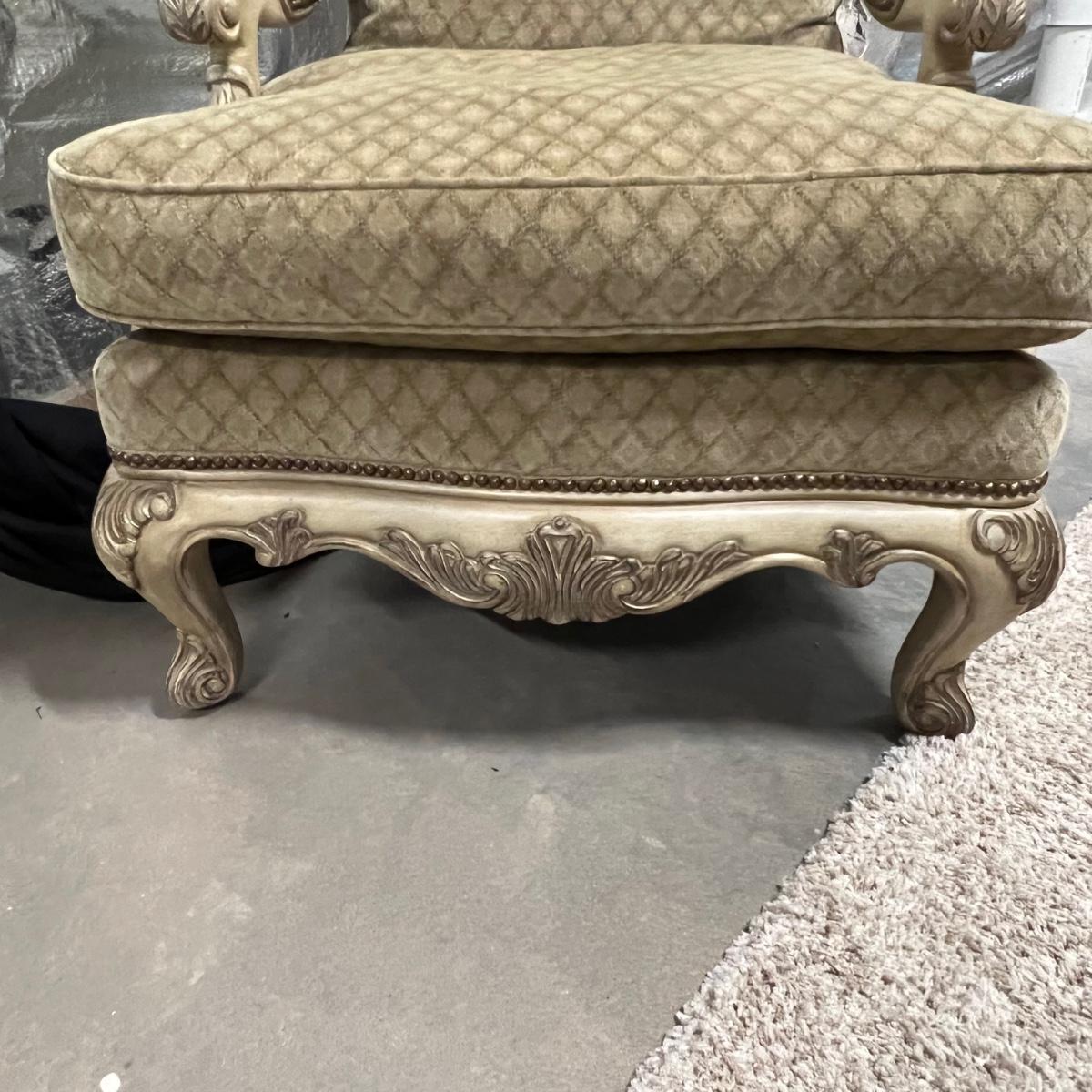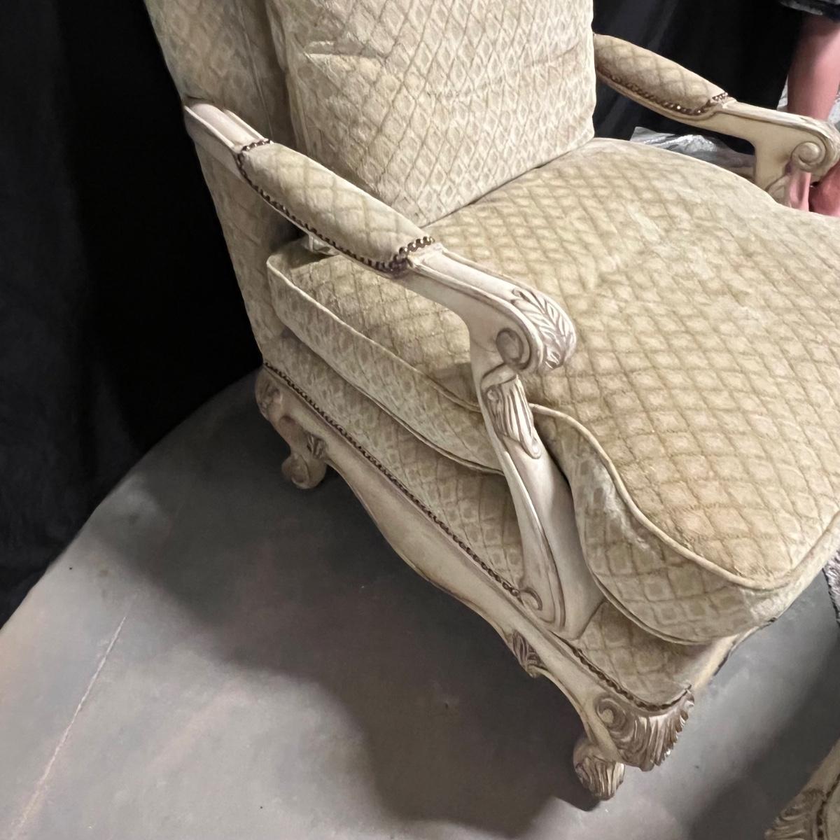 A matching chair and ottoman from Henredon in this lot. Extremely comfortable chair that has a soft velvet feel to the upholstery which is a tan color with Diamond design (some images appear lighter in color due to lighting, the main photo shows the truest representation of color). The removal seat and back cushions have zippers and are partially duck down, see image for materials. Frame is wood painted in a dark ivory color with dark brass colored metal tacks.
