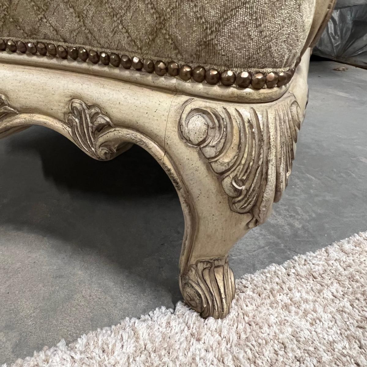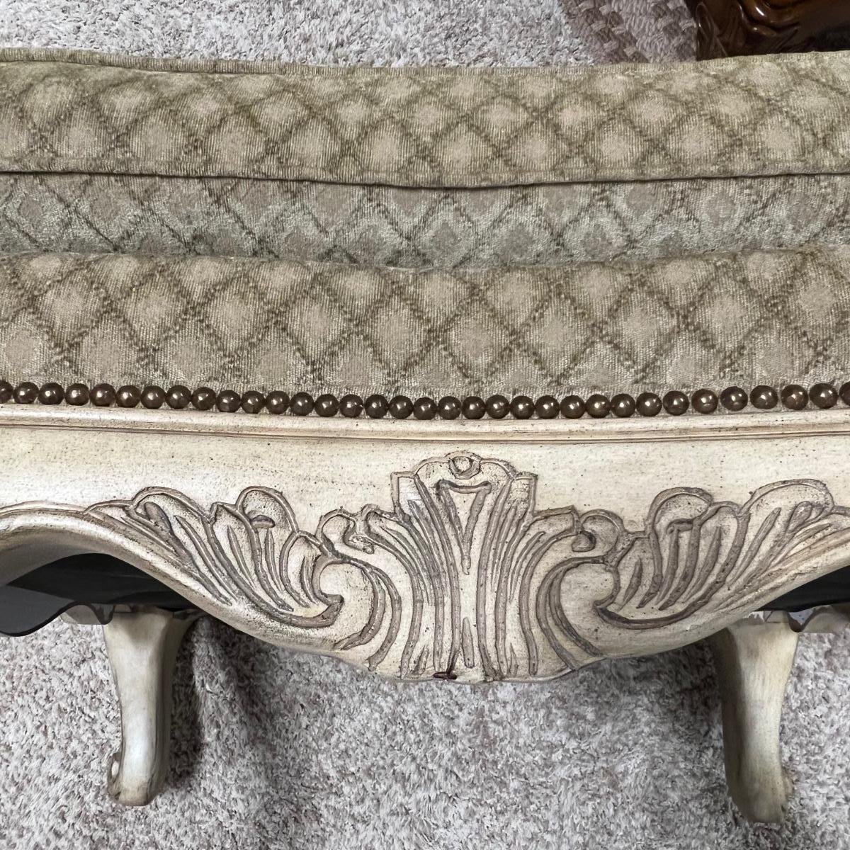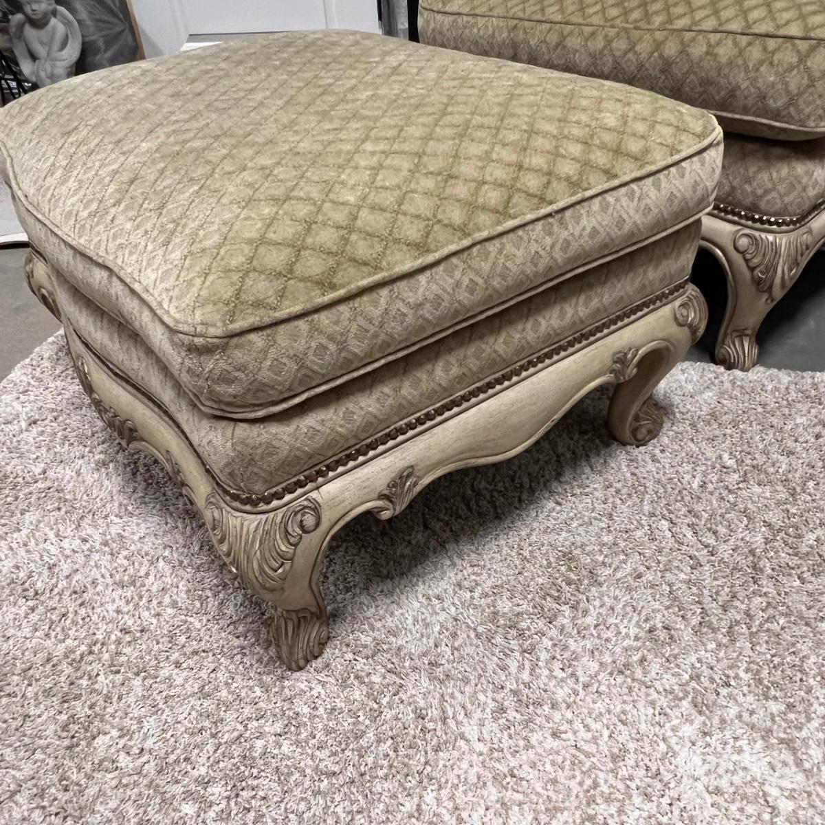 A matching chair and ottoman from Henredon in this lot. Extremely comfortable chair that has a soft velvet feel to the upholstery which is a tan color with Diamond design (some images appear lighter in color due to lighting, the main photo shows the truest representation of color). The removal seat and back cushions have zippers and are partially duck down, see image for materials. Frame is wood painted in a dark ivory color with dark brass colored metal tacks.