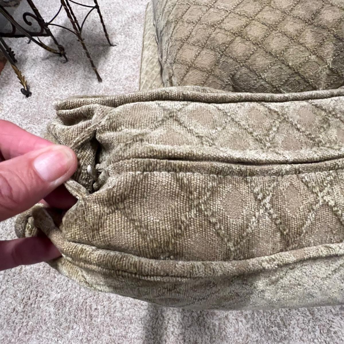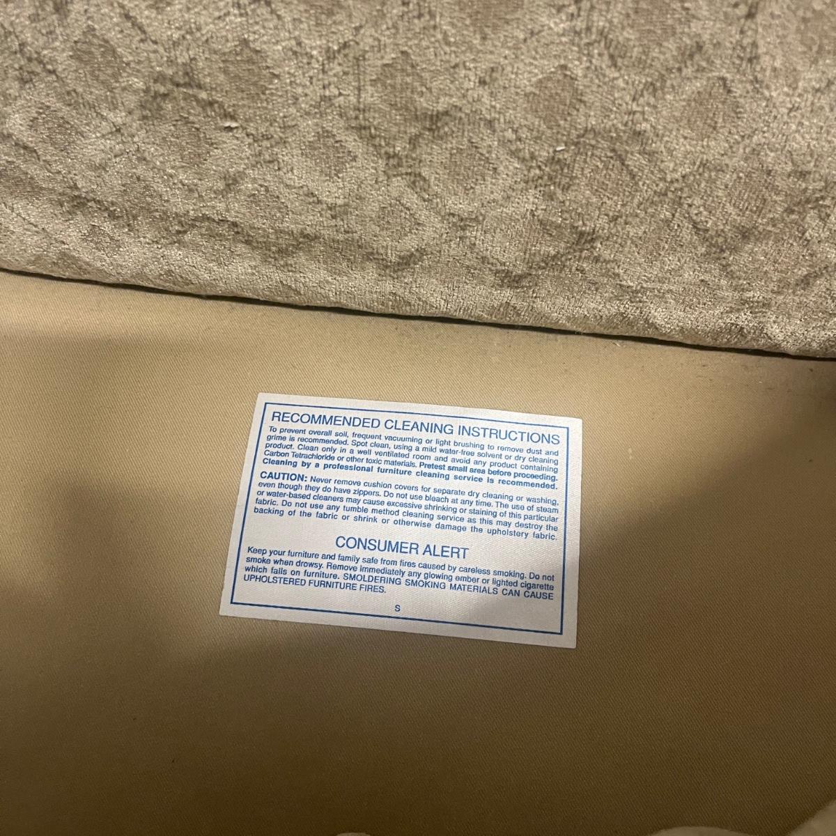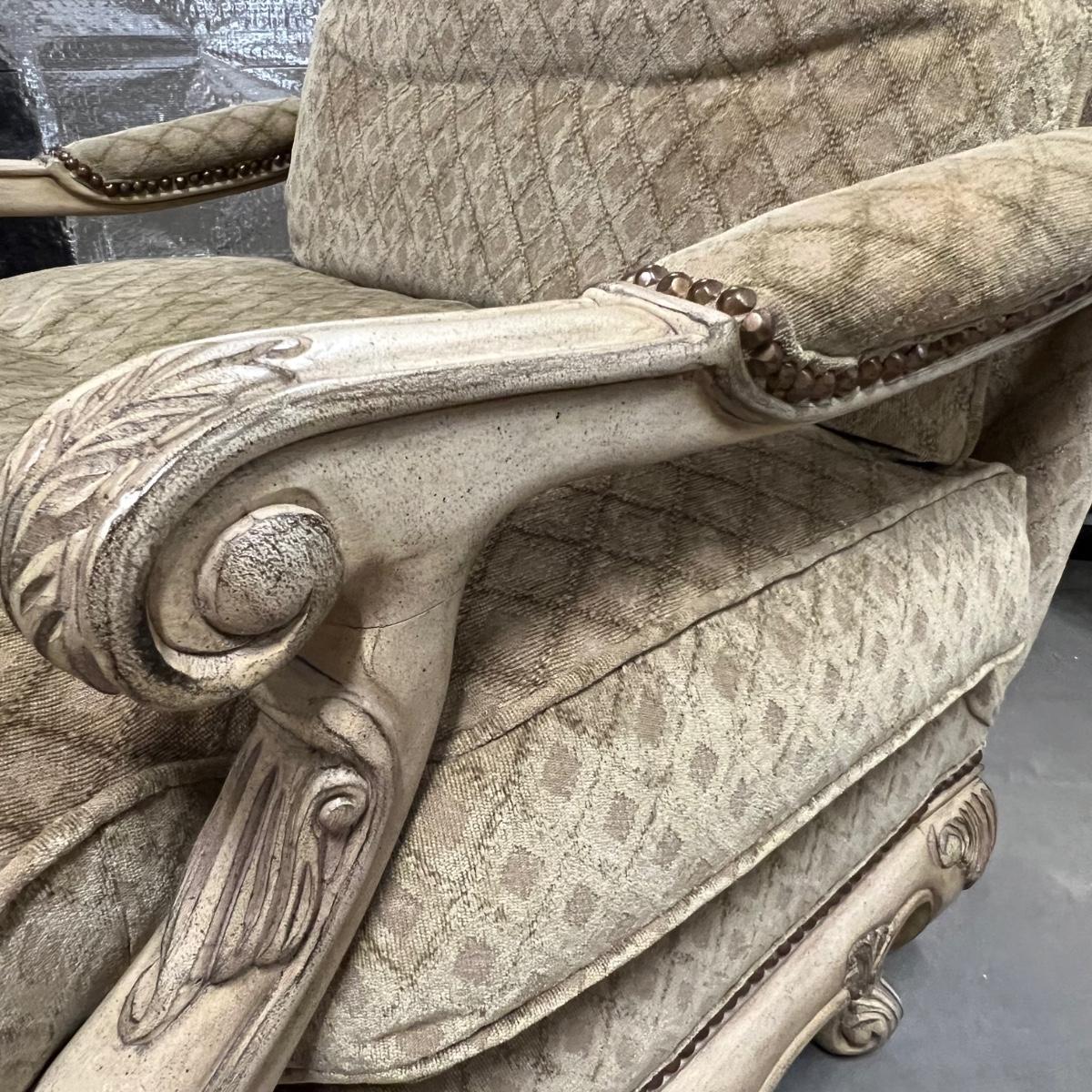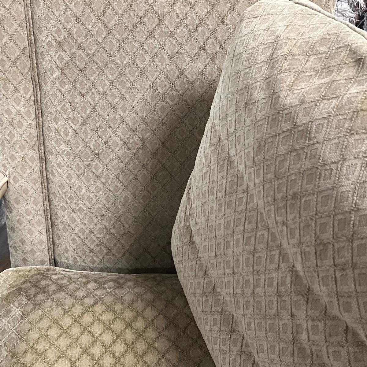 A matching chair and ottoman from Henredon in this lot. Extremely comfortable chair that has a soft velvet feel to the upholstery which is a tan color with Diamond design (some images appear lighter in color due to lighting, the main photo shows the truest representation of color). The removal seat and back cushions have zippers and are partially duck down, see image for materials. Frame is wood painted in a dark ivory color with dark brass colored metal tacks.