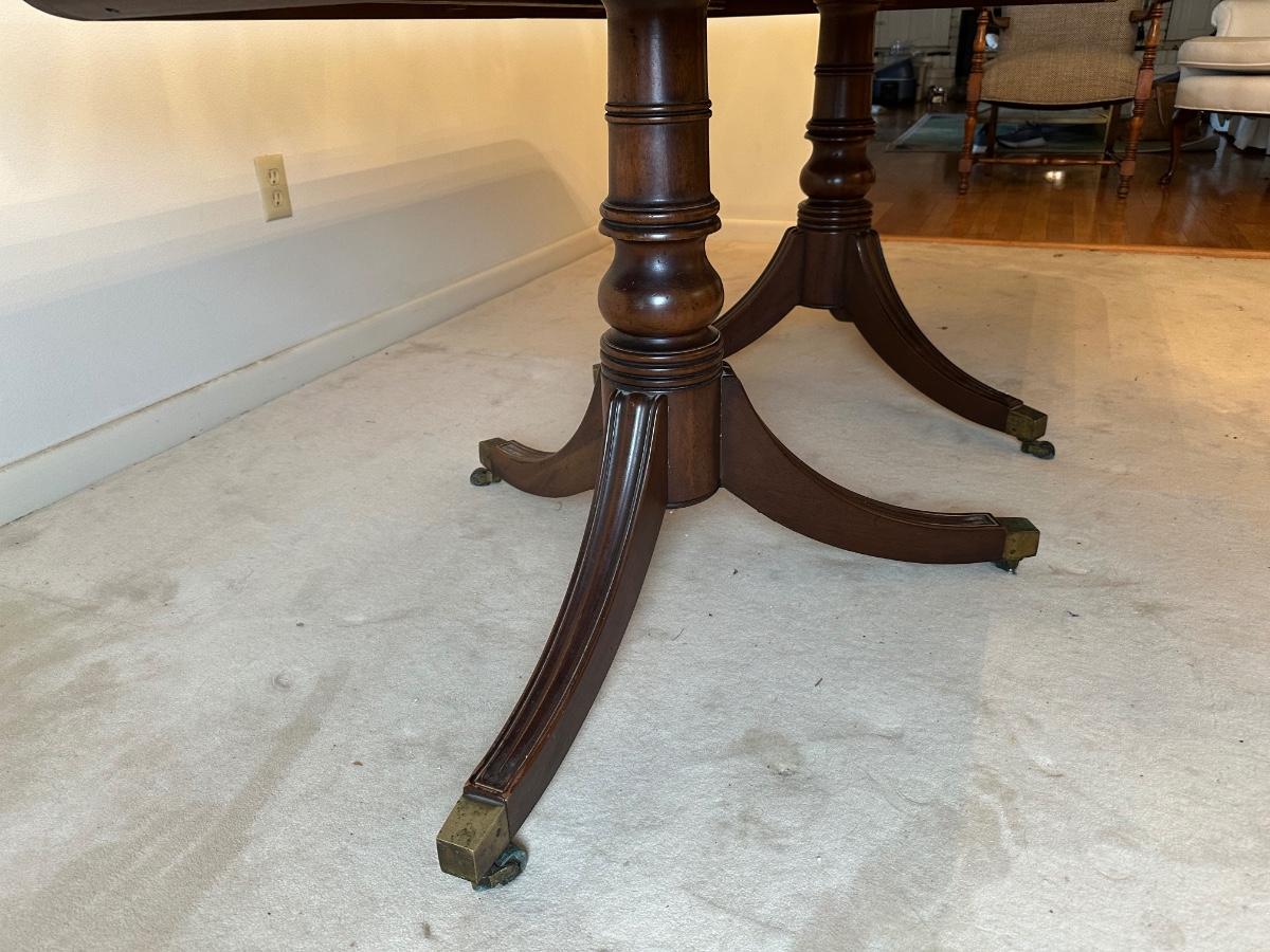 Henredon mahogany dining table in a classic double-pedestal. Features a veneered top with banded edge, two turned pedestals, and brass-capped legs on casters. Comes with three matching leaves for extended seating.