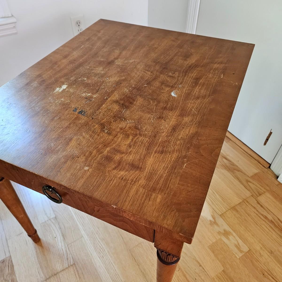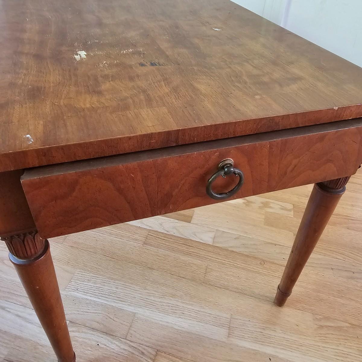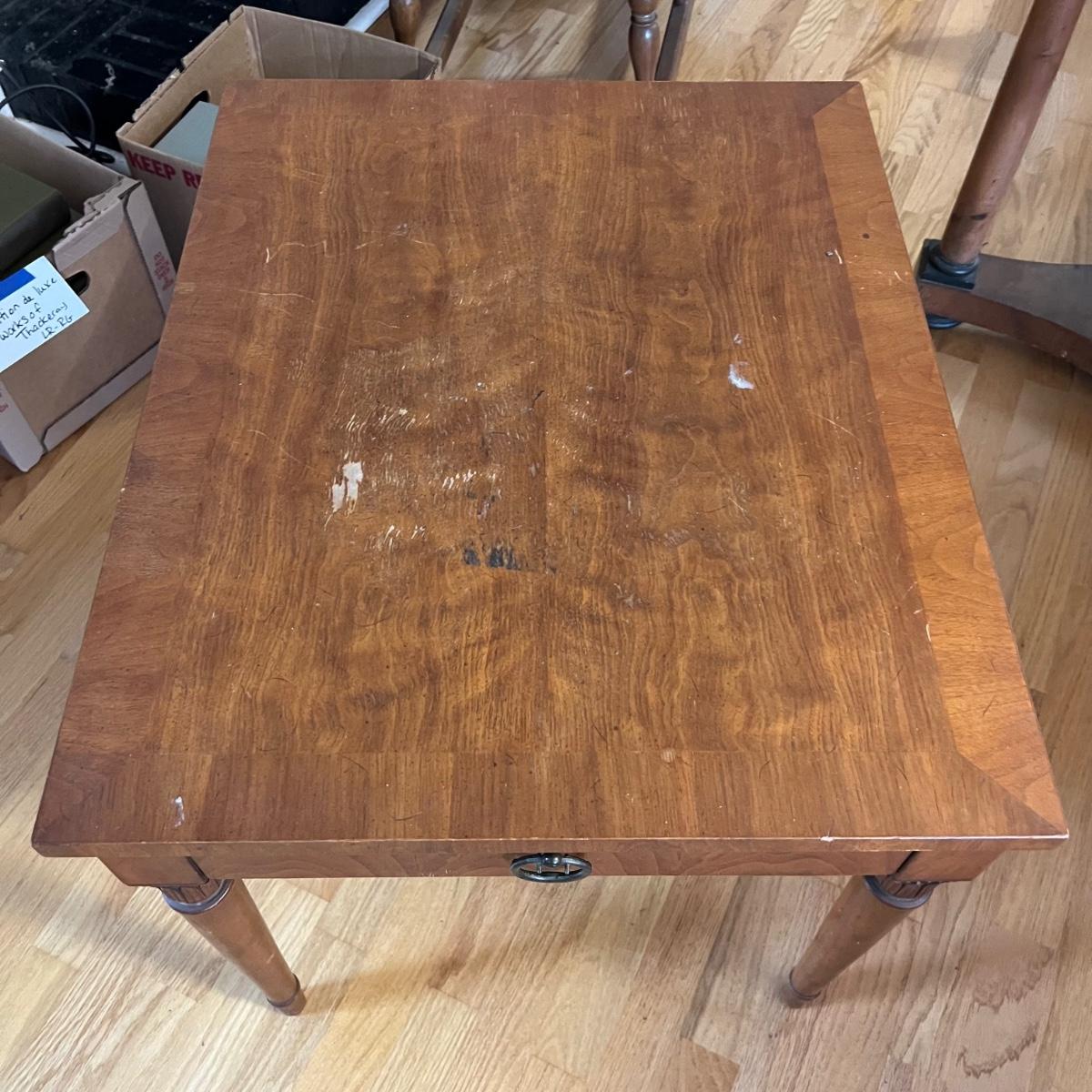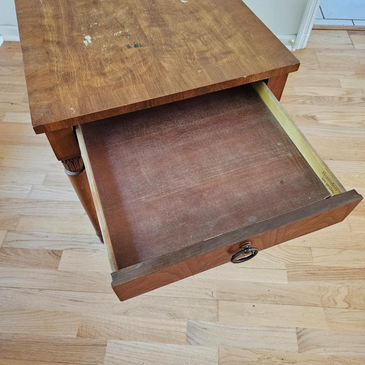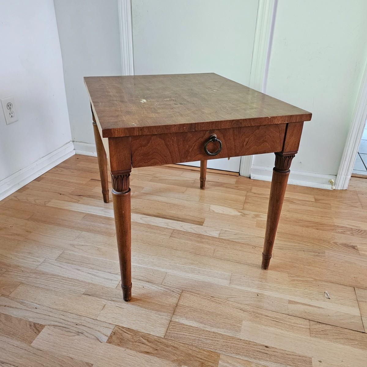 Medium colored side table with drawer by Henredon. Tapered legs with carved top pieces and one drawer with dovetail corners. Table measures 22" x 27" x 22"H, has blemishes, some noted in photos and is missing some pieces of veneer trim underneath. See photos for details. Local pickup only.