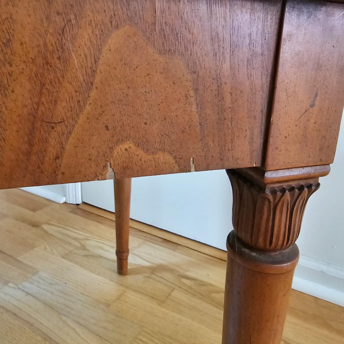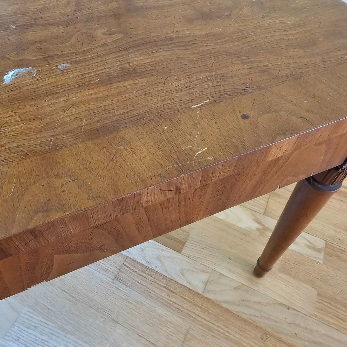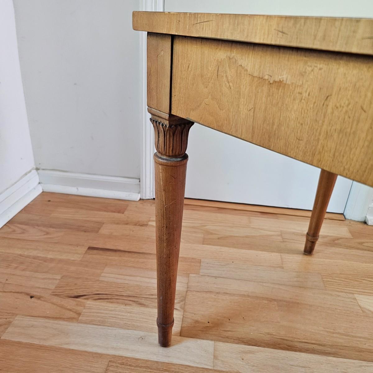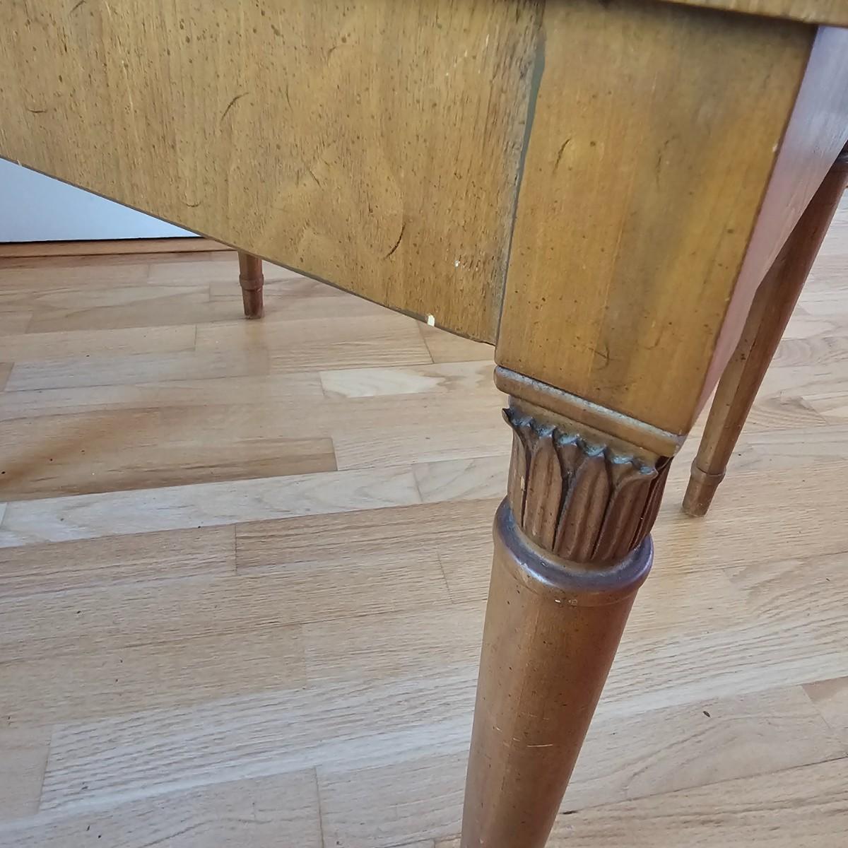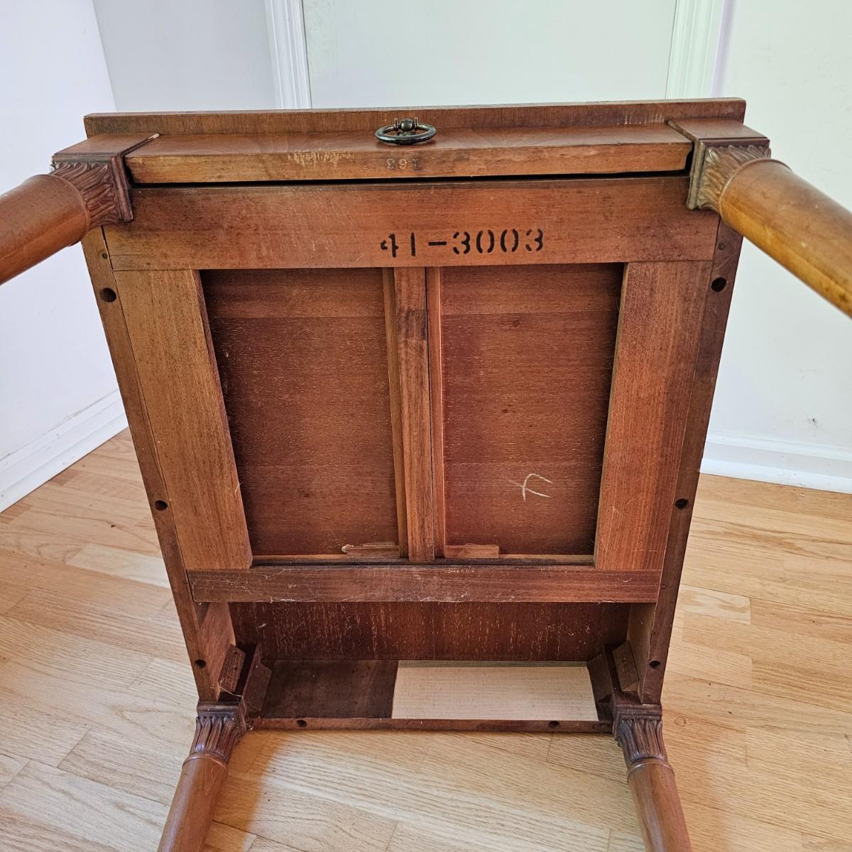 Medium colored side table with drawer by Henredon. Tapered legs with carved top pieces and one drawer with dovetail corners. Table measures 22" x 27" x 22"H, has blemishes, some noted in photos and is missing some pieces of veneer trim underneath. See photos for details. Local pickup only.