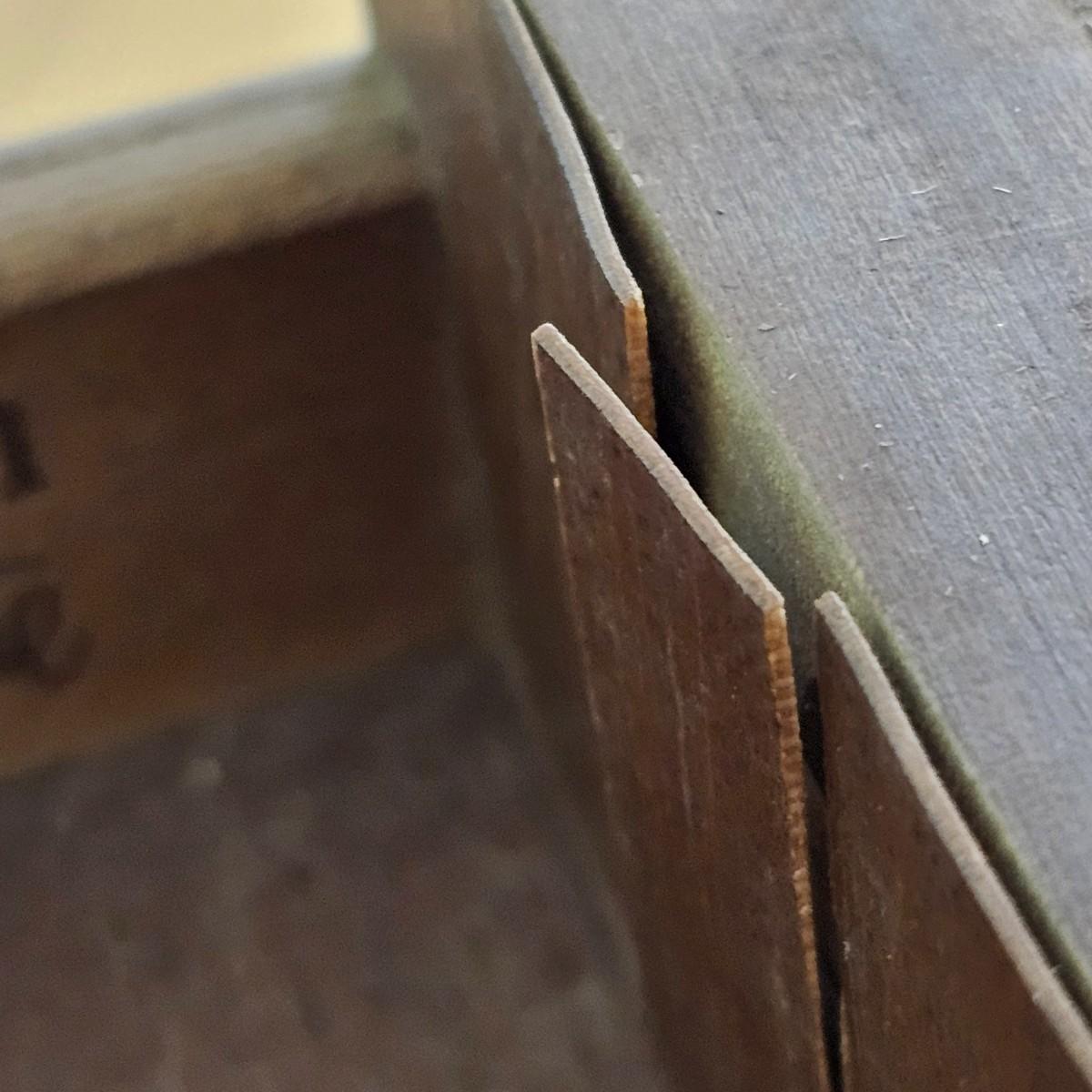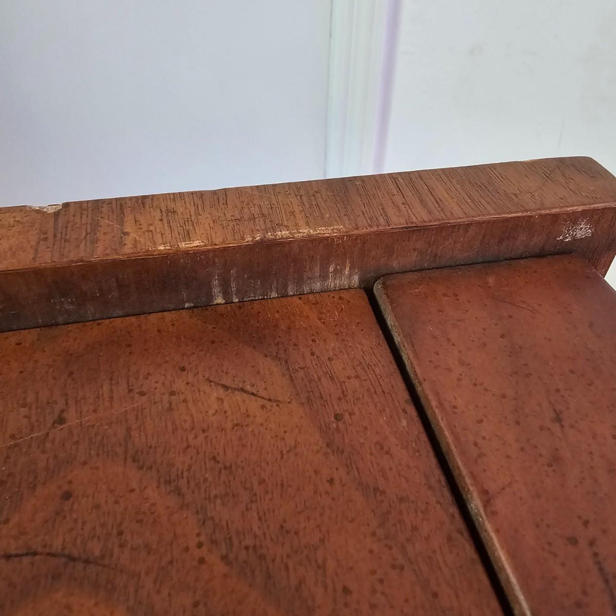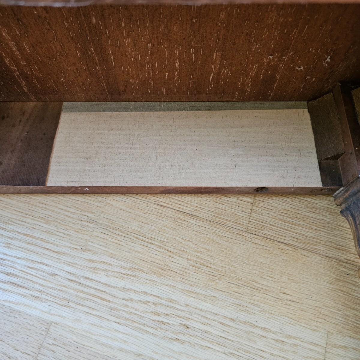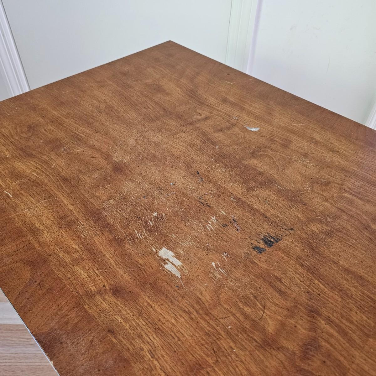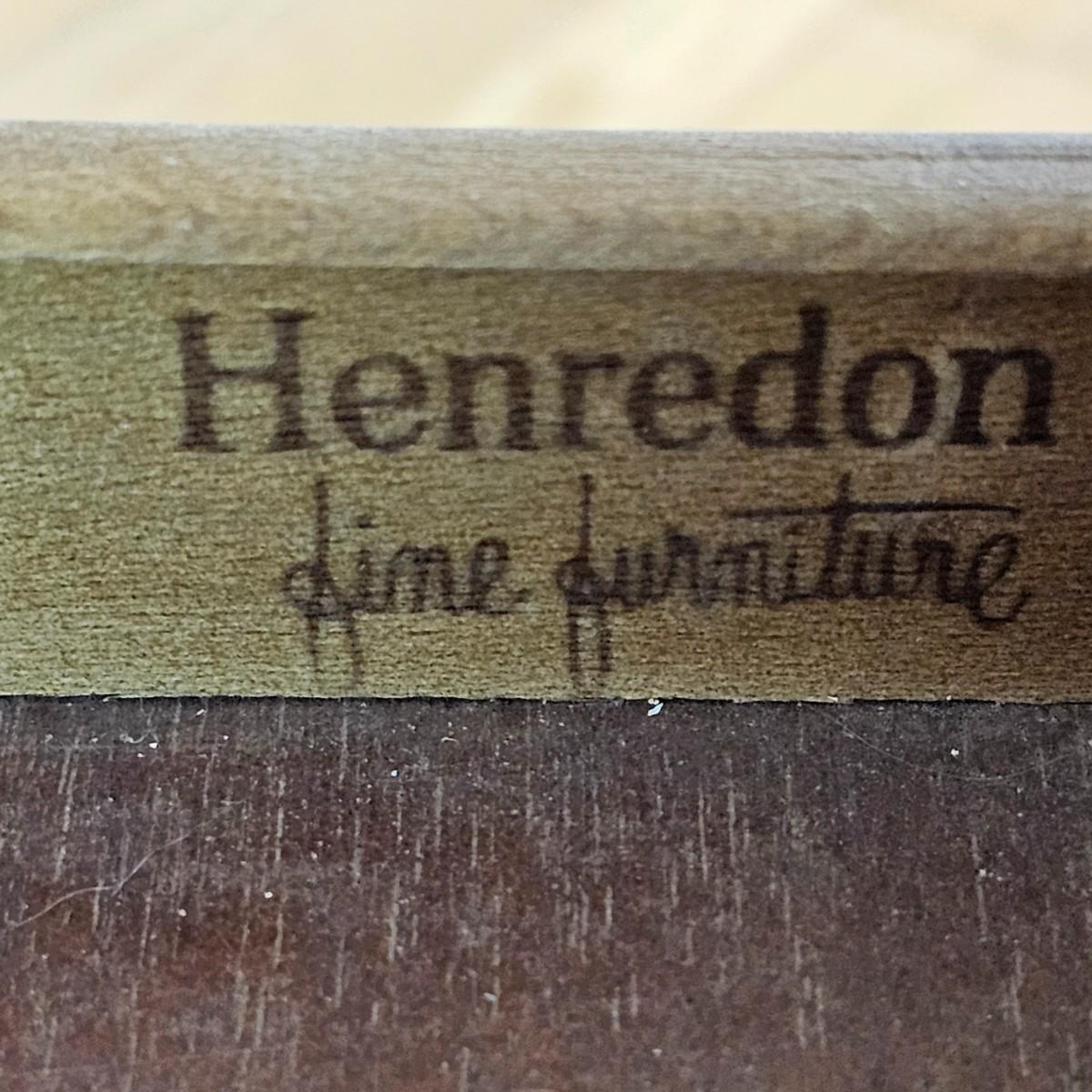 Medium colored side table with drawer by Henredon. Tapered legs with carved top pieces and one drawer with dovetail corners. Table measures 22" x 27" x 22"H, has blemishes, some noted in photos and is missing some pieces of veneer trim underneath. See photos for details. Local pickup only.