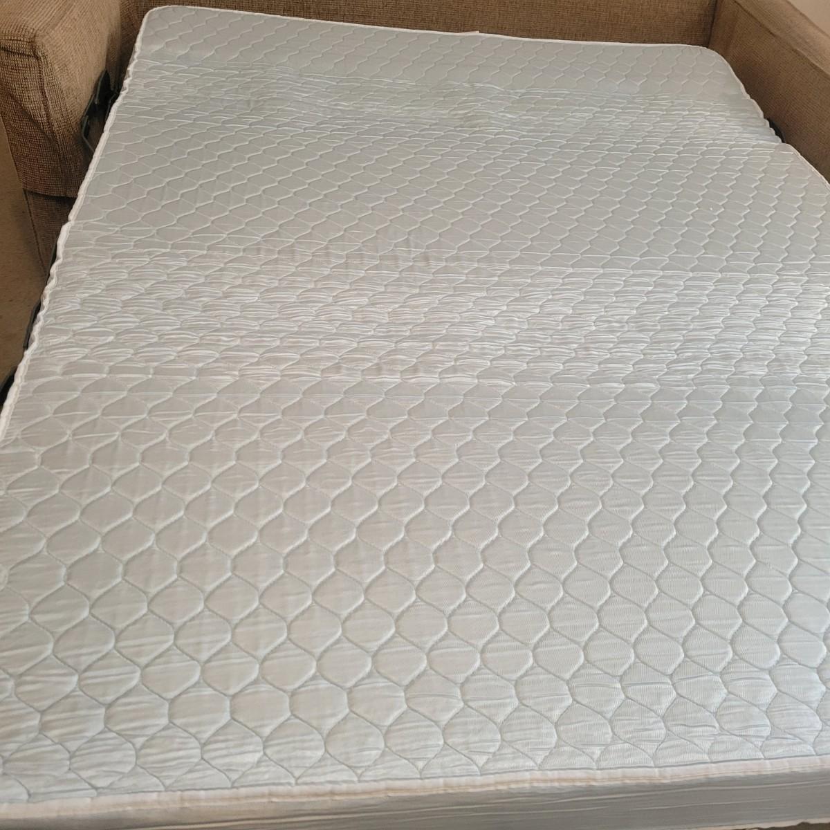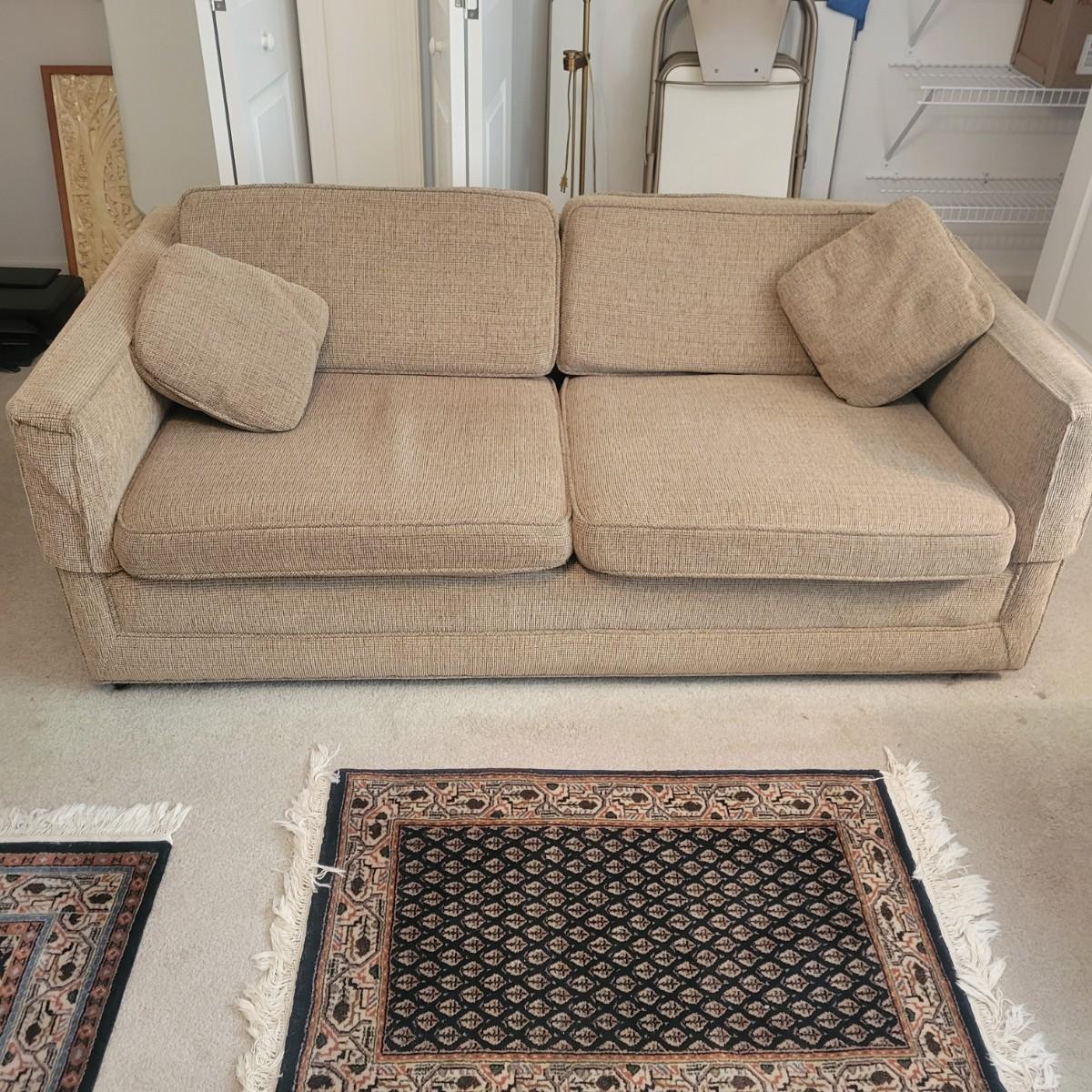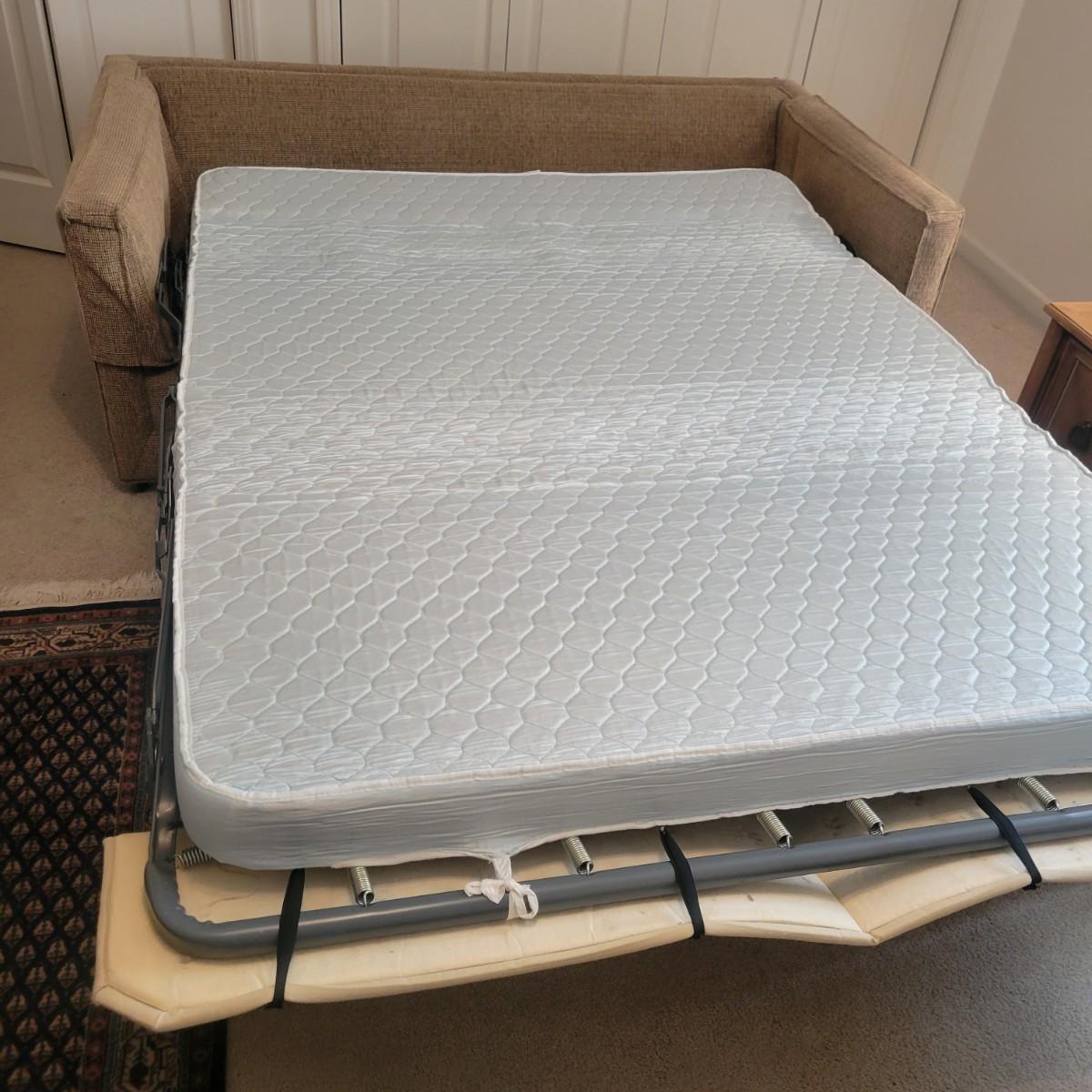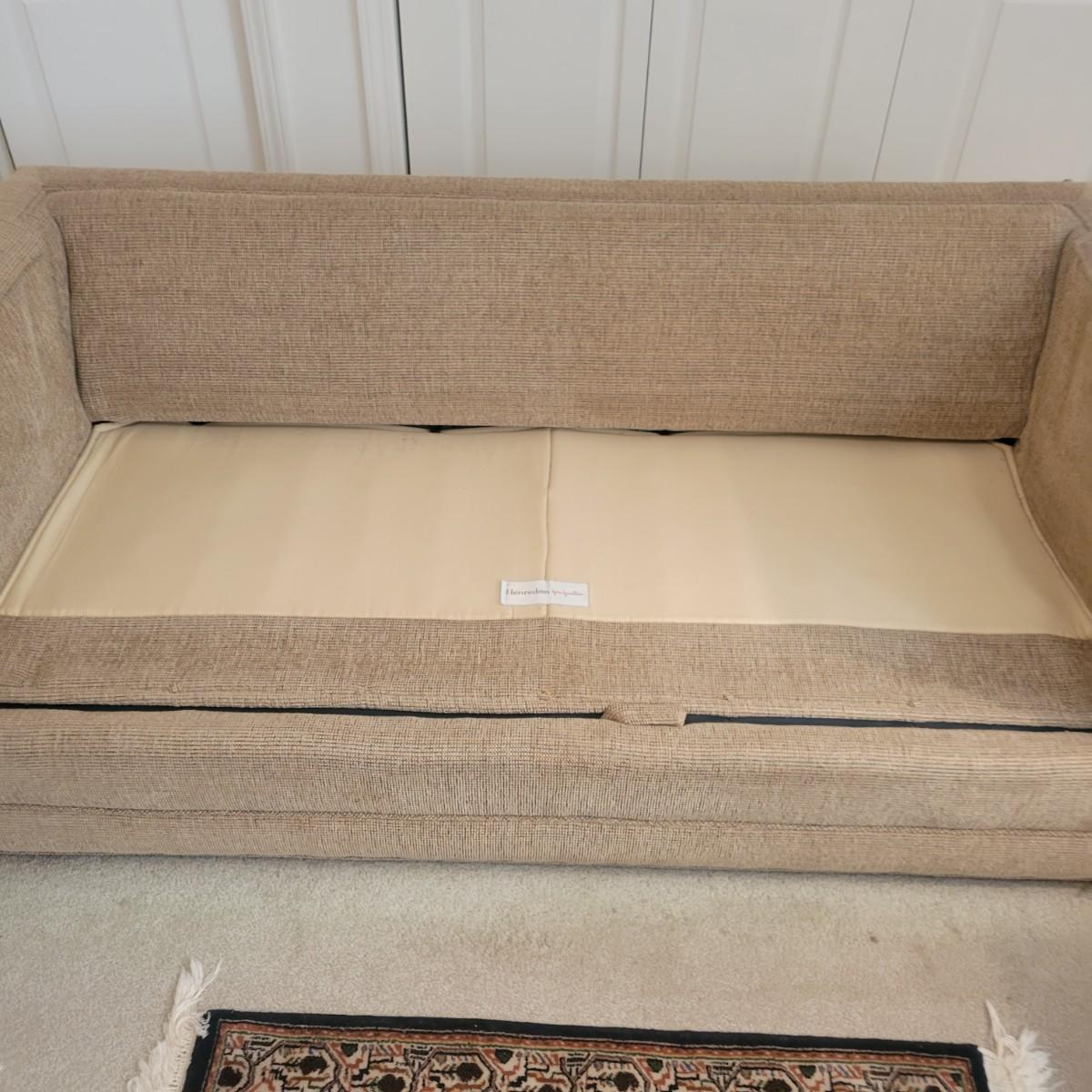A Henredon sleeper sofa with no notable damage, stains or odors. This sofa comes with arm covers and matching pillows. The pull out is a full sized mattress. Sofa measures approximately 67.5" x 35.5" x 24" with a seat height of 16". Local pickup only. Winning bidder must bring assistance to help move and load this item due to its weight and/or size. The mattress is available to the winning bidder if desired, but the winning bidder is not required to take it.