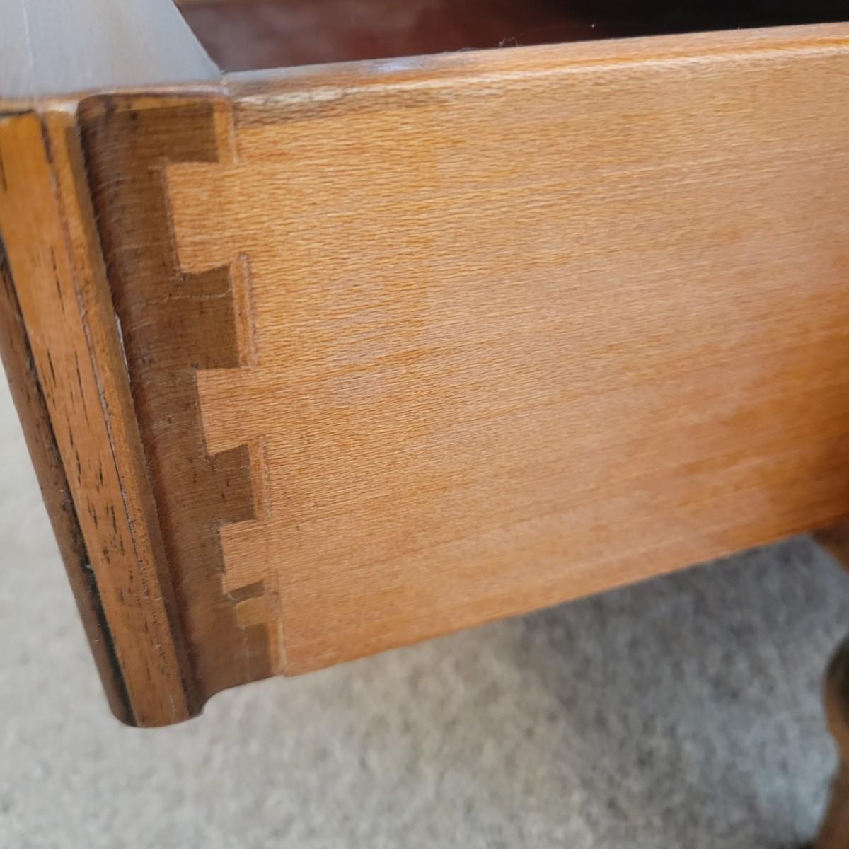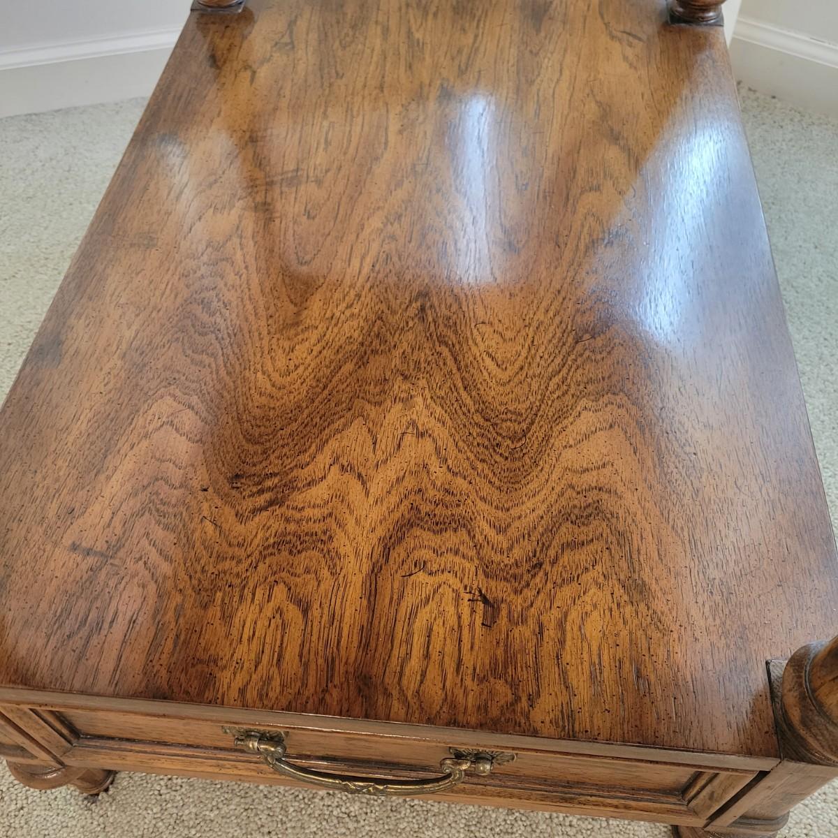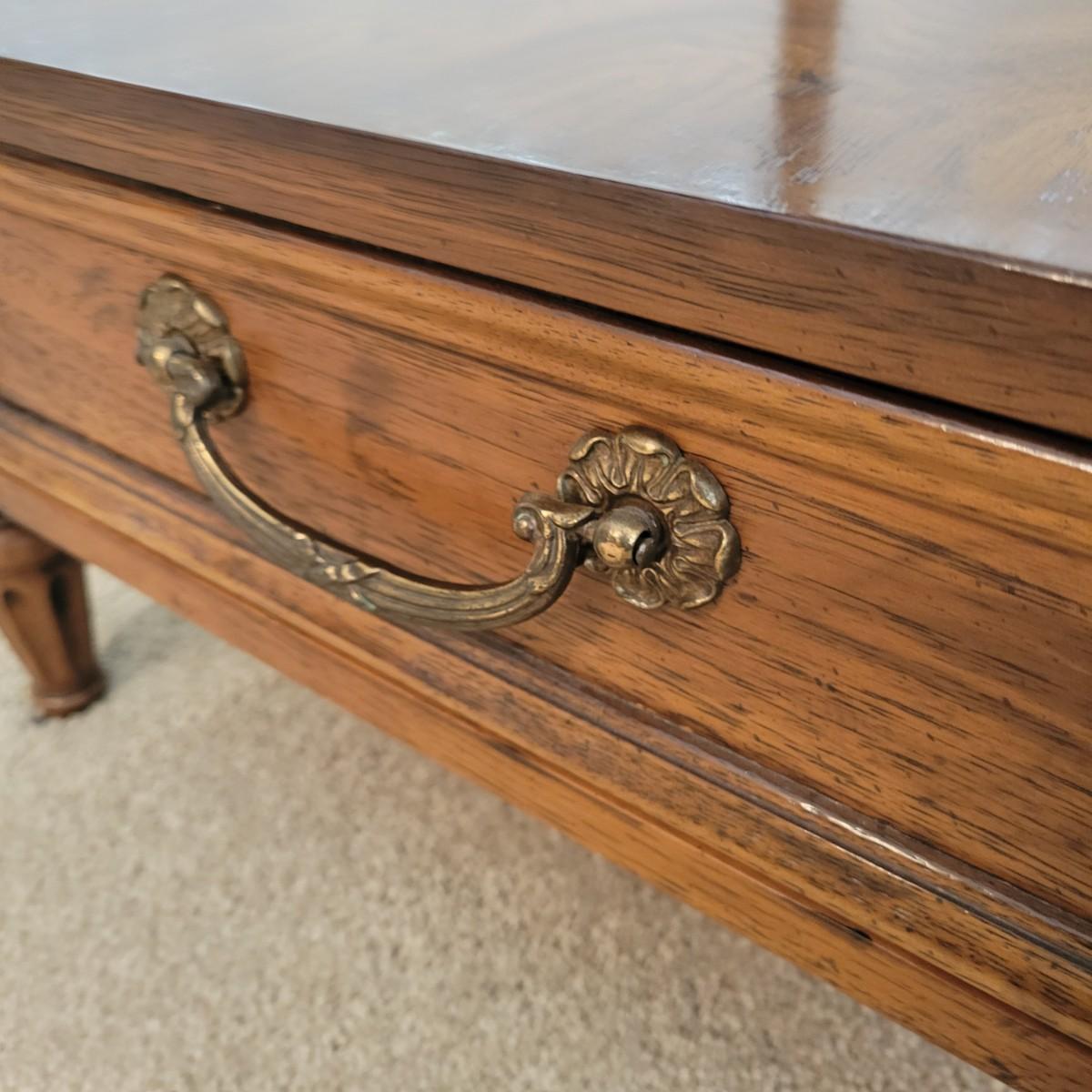 A veneered solid wood side table manufactured by Henredon. This table features a single dovetailed drawer with brass accents. Table measures approximately 19" x 26" x 25.5"H. Local pickup only