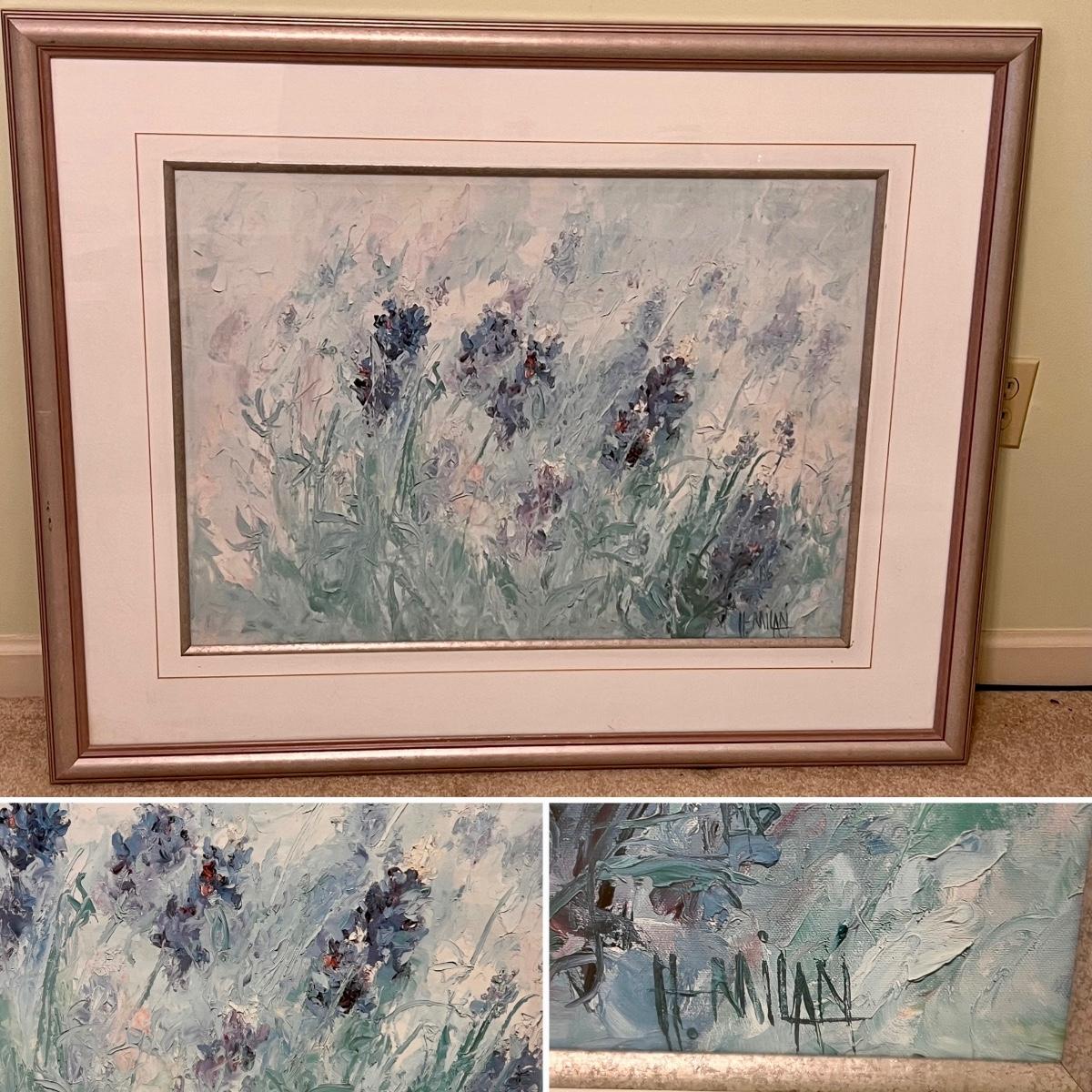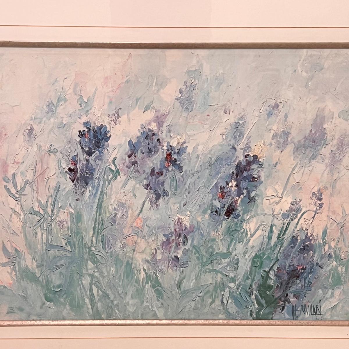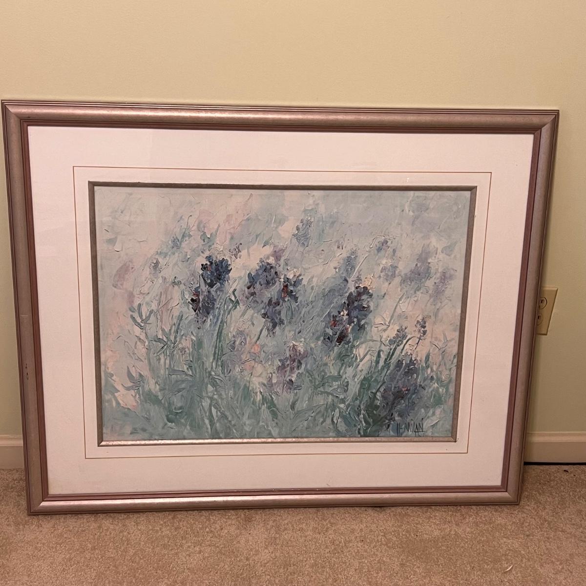 Stunning print of blue and purple hued flowers has a printed signature that appears to be H. Milan. It is nicely framed and under glass in a large silver colored wood frame that measures 41” x 33”H.