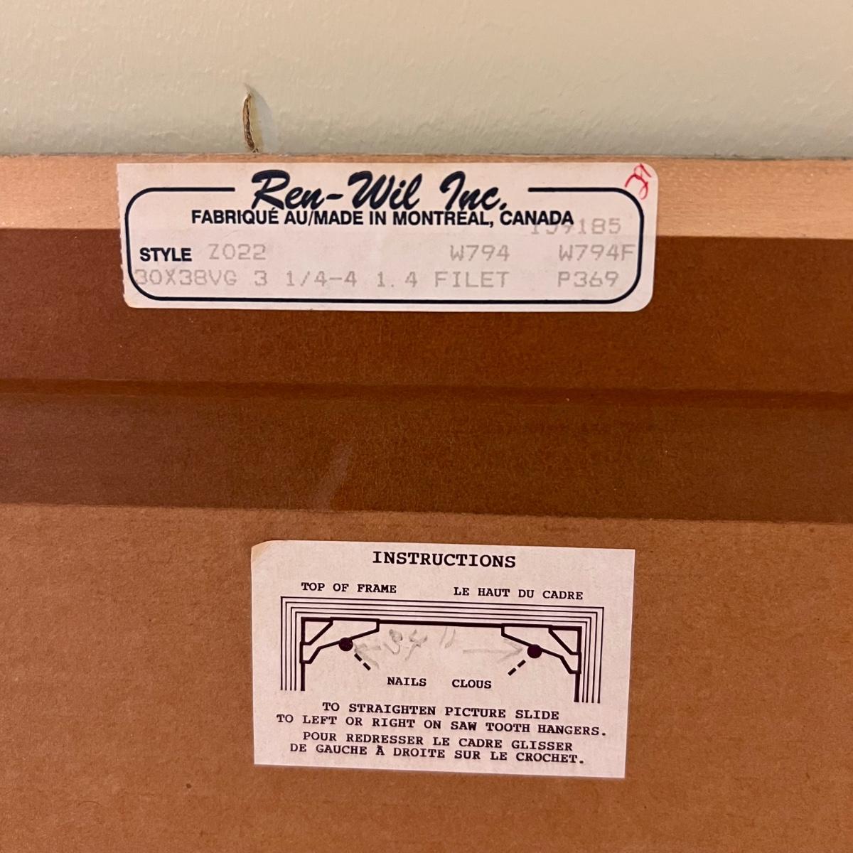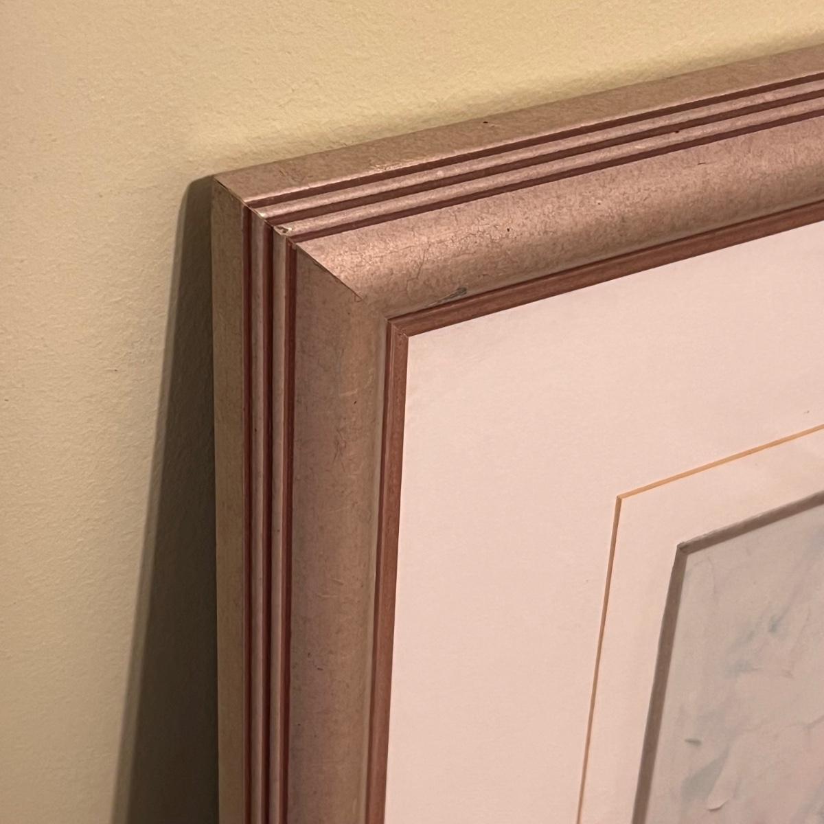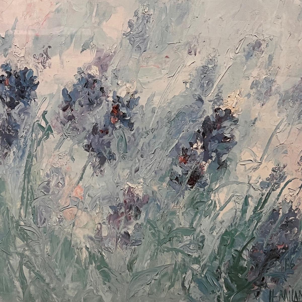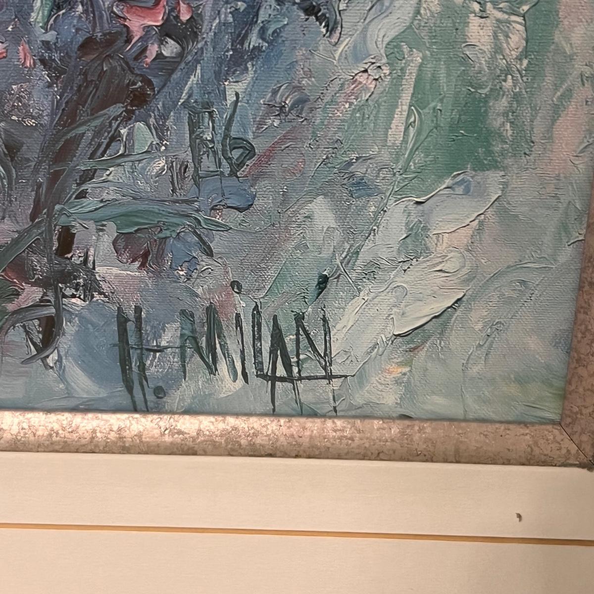 Stunning print of blue and purple hued flowers has a printed signature that appears to be H. Milan. It is nicely framed and under glass in a large silver colored wood frame that measures 41” x 33”H.