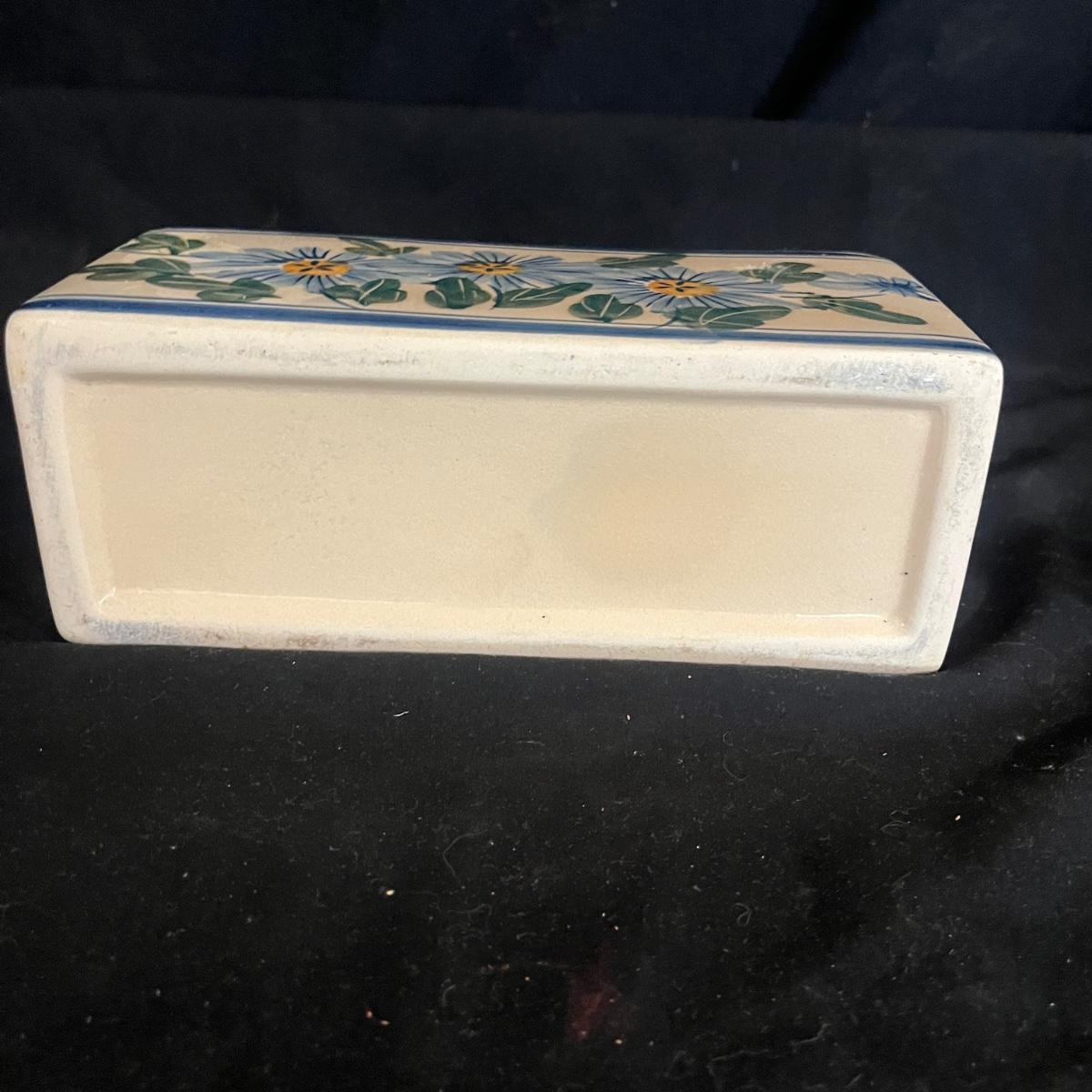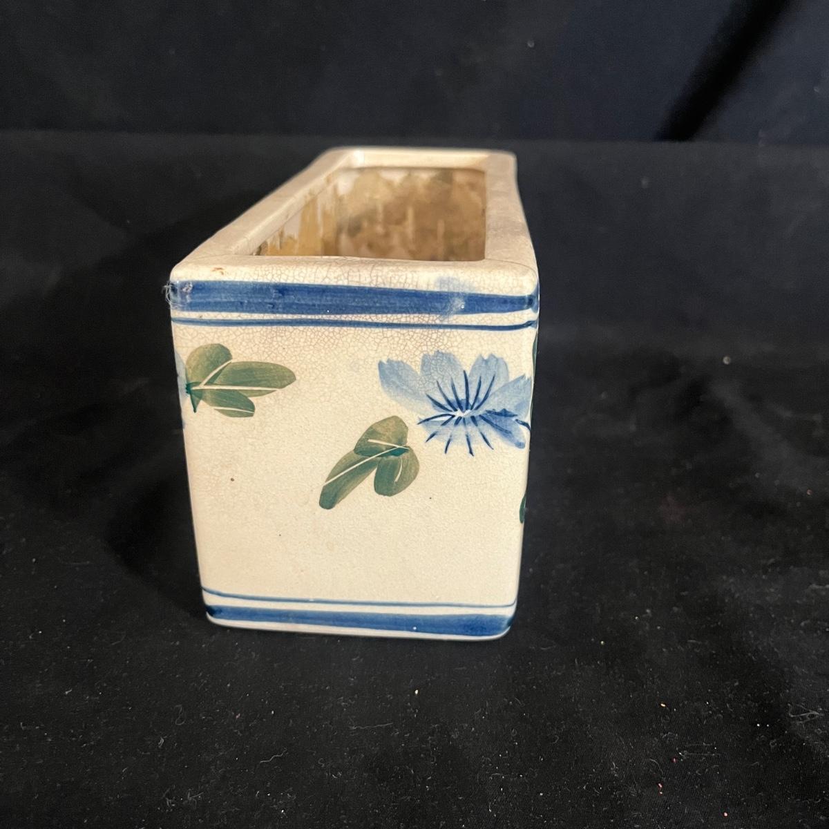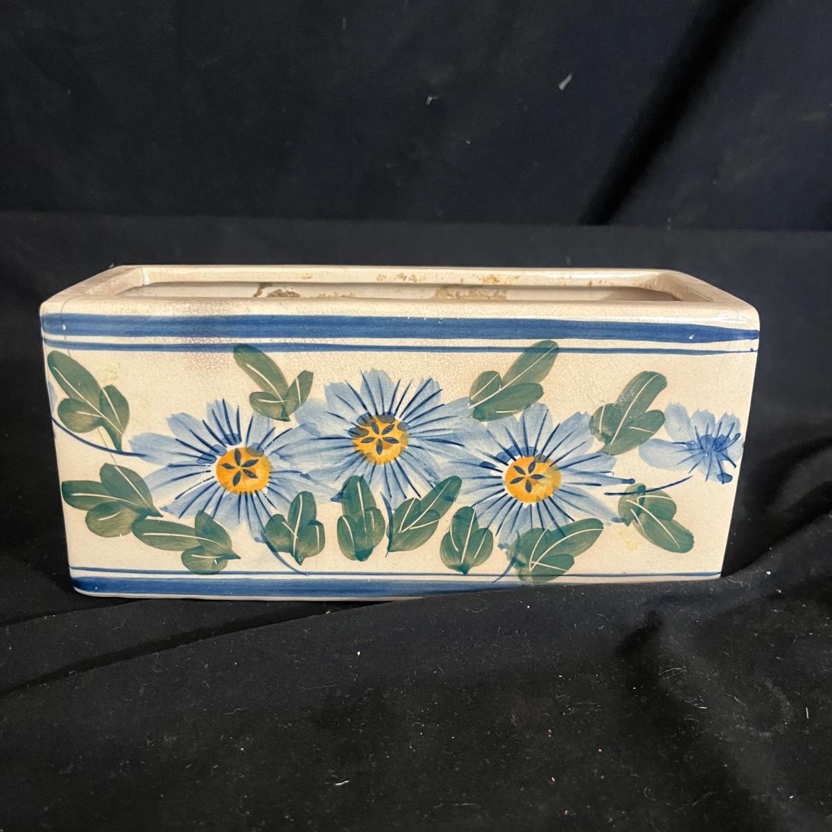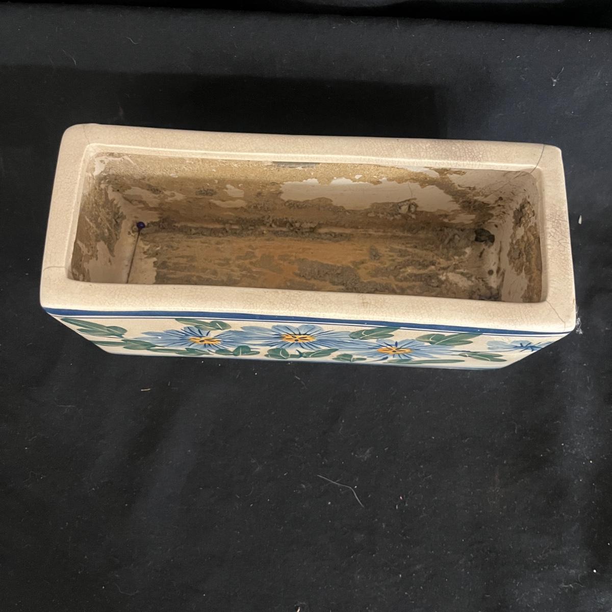 Lot includes Henriot Quimper ceramic dish and plate, four hand made ceramic coasters, two ceramic numbers, small ceramic pitcher, egg holder and bird figurine. Also includes a ceramic planter that measures 8” x 3” x 3.75”H. Planter has crack, see pictures.