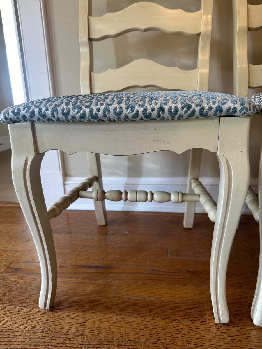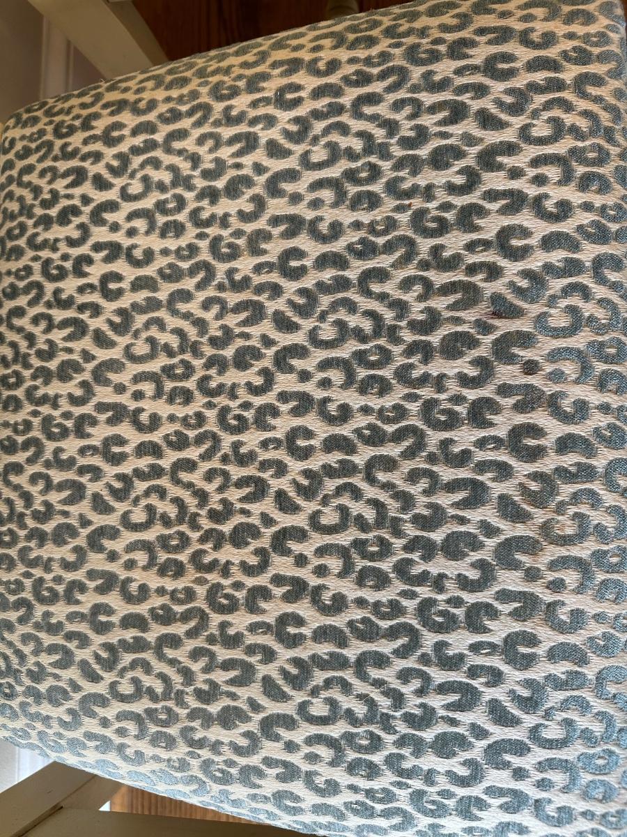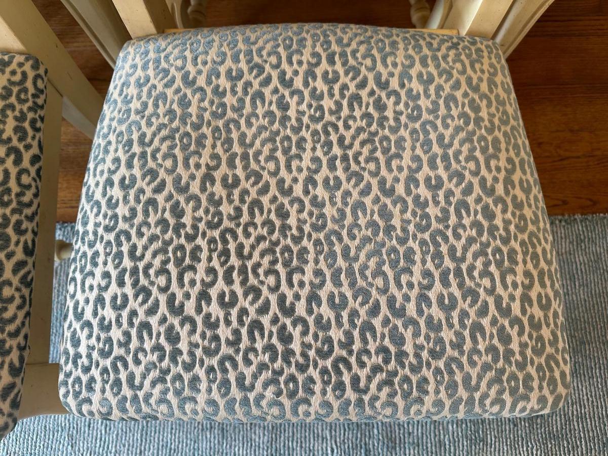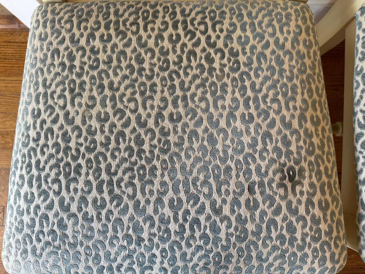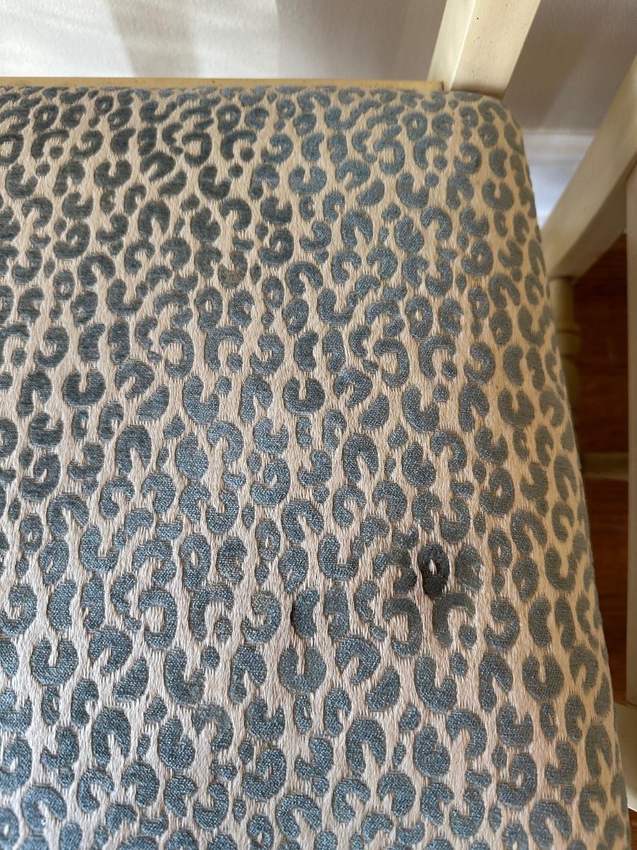 Comes with extra fabric for seat covers! One seat does have a little mark, could possibly come out with proper cleaning. The wood has some scratches, see pictures. .
