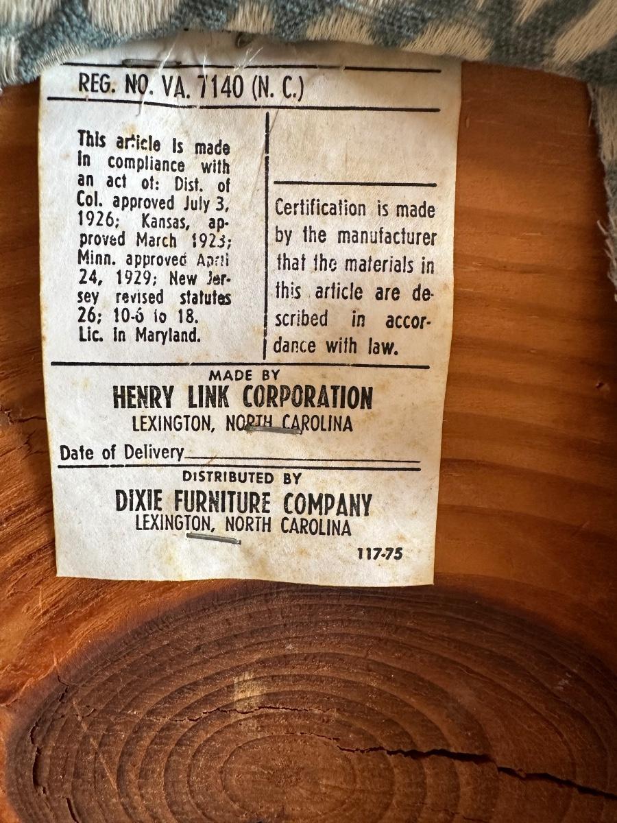 Made by Henry Link Corporation. Distributed by Dixie Furniture Company. (6) solid chairs.