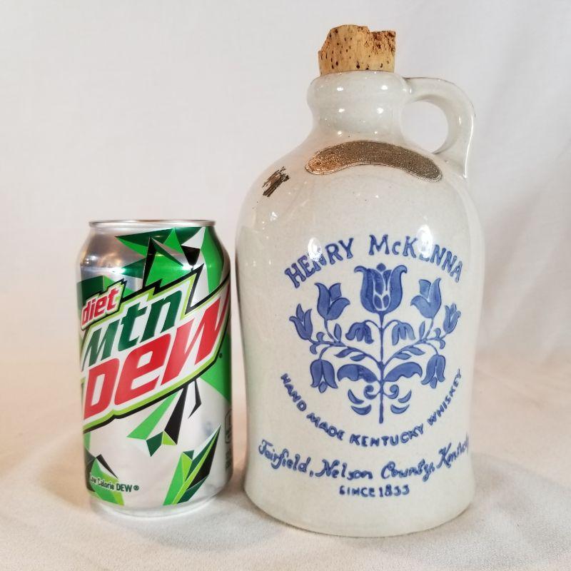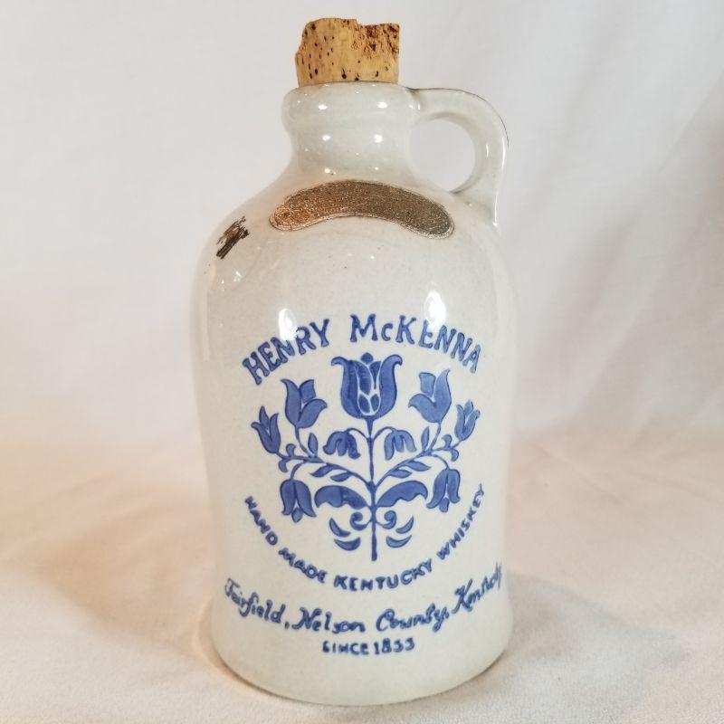 Henry McKenna Whiskey Jug. Delft Blue tulips and writing under the glaze. Jug has no contents but the original whiskey it held was Made in Kentucky - 4/5 quart size. Fairfield, Nelson County, Kentucky - Since 1833 appears on face. Embossed on bottom 146 68 D126 Still has most of the paper labels and cork stopper. Very good condition consistent with age and use.